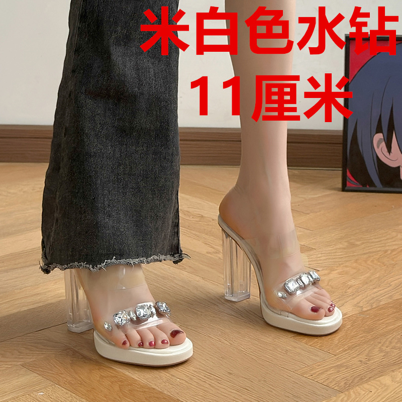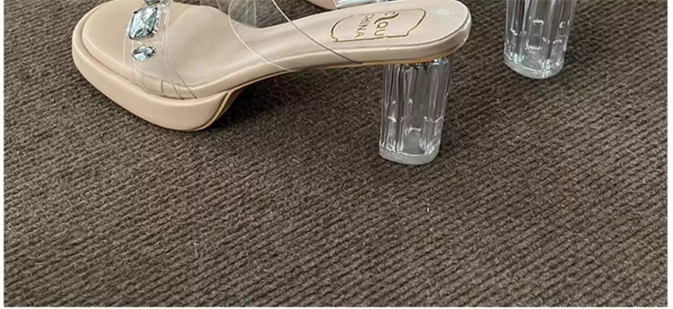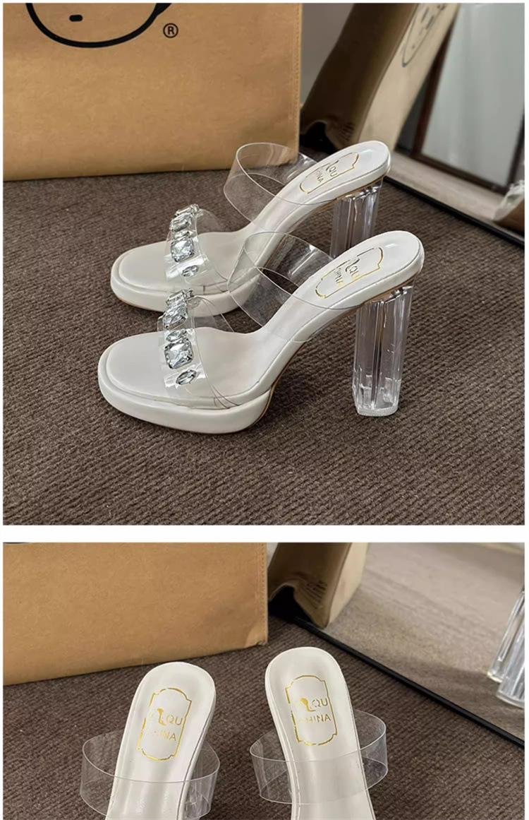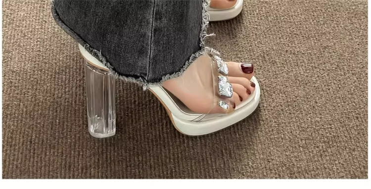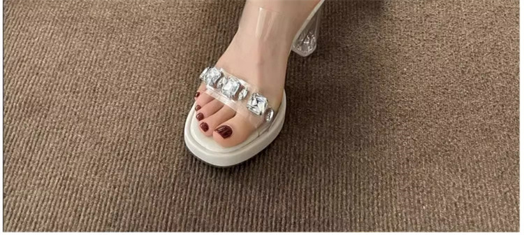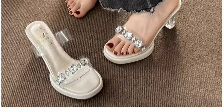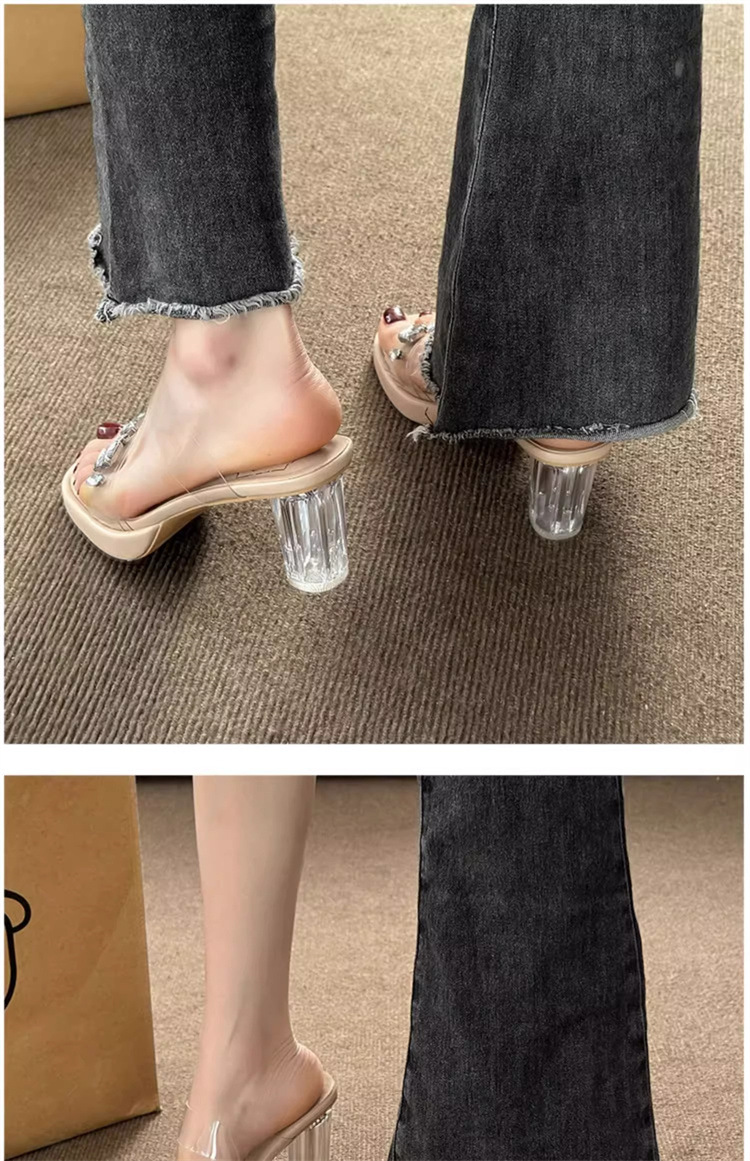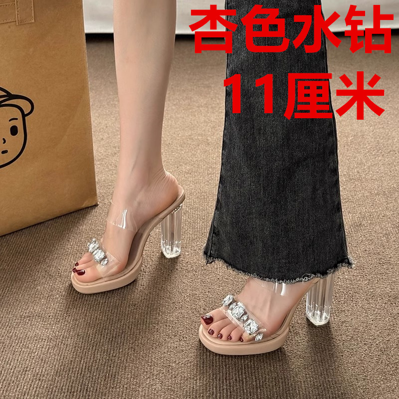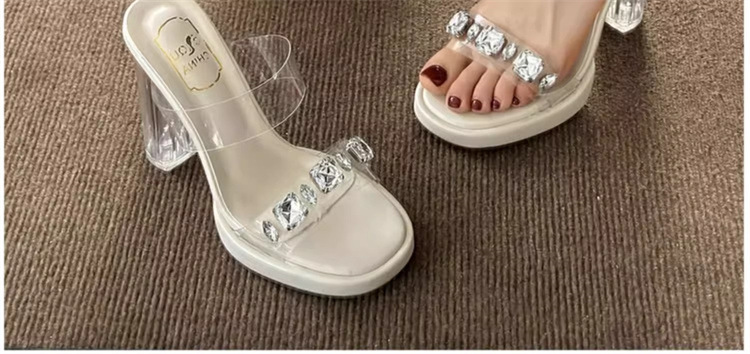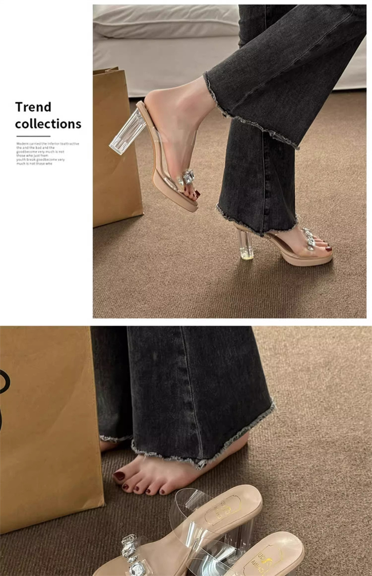 여성용 하이힐 2025 여름 신작 프렌치 두꺼운 굽 라인스톤 투명 크리스탈 샌들 여성 슬리퍼 여성 신발스토어 가기