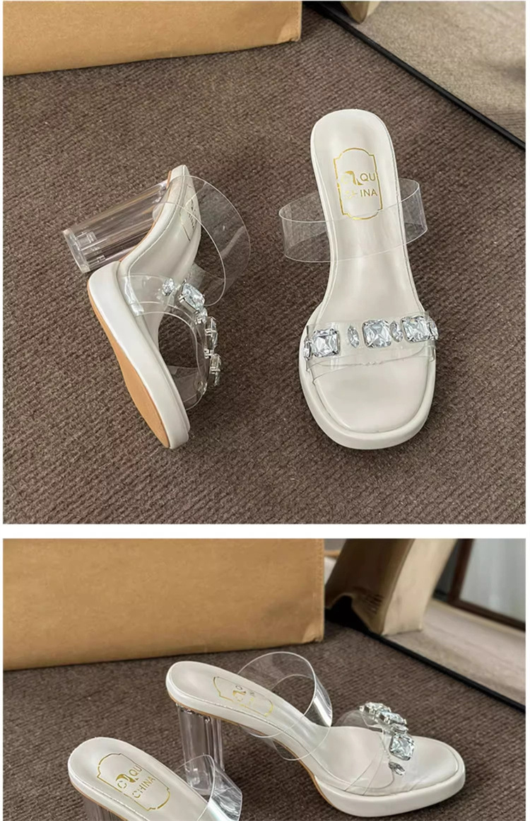 여성용 하이힐 2025 여름 신작 프렌치 두꺼운 굽 라인스톤 투명 크리스탈 샌들 여성 슬리퍼 여성 신발