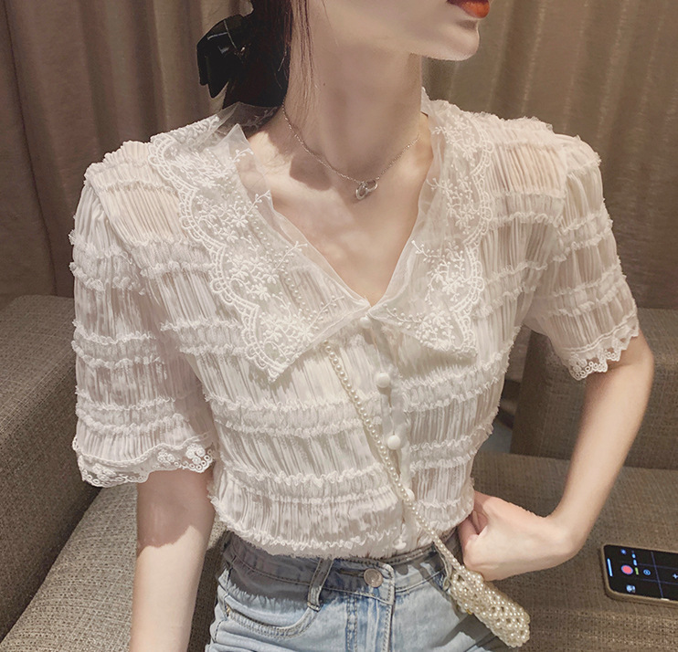 프랑스 달콤하고 부드러운 슈퍼 페어리 여성 최고의 디자인 센스 틈새 한펑 세련된 반팔 쉬폰 셔츠