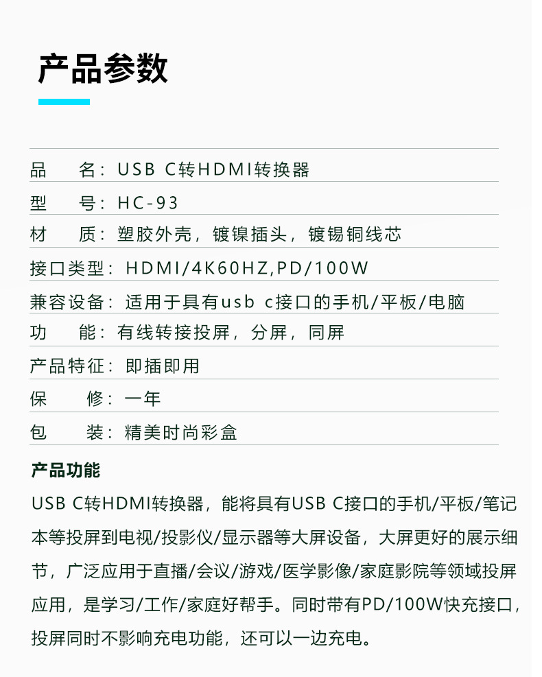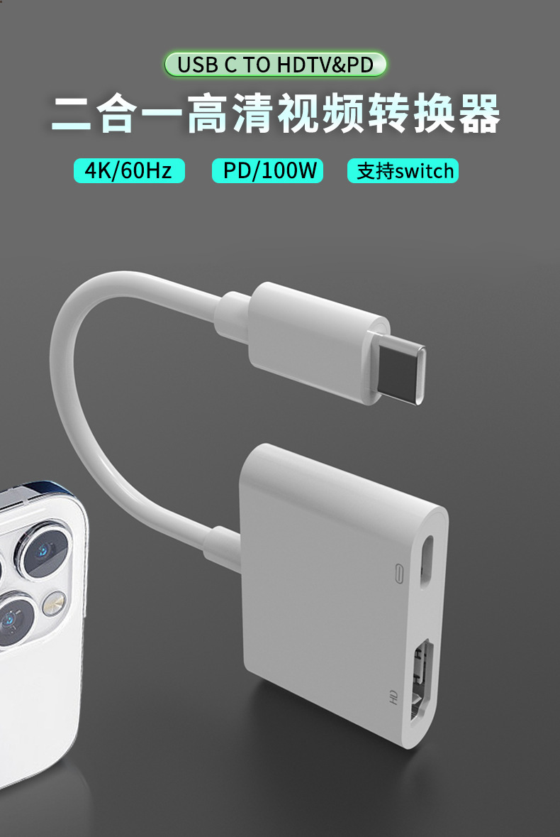 타입-C to HDMI 4K 고화질 PD 비디오 케이블, 애플 15 휴대폰 동일 화면 연결 및 휴대폰 고화질 화면 프로젝션에 적합