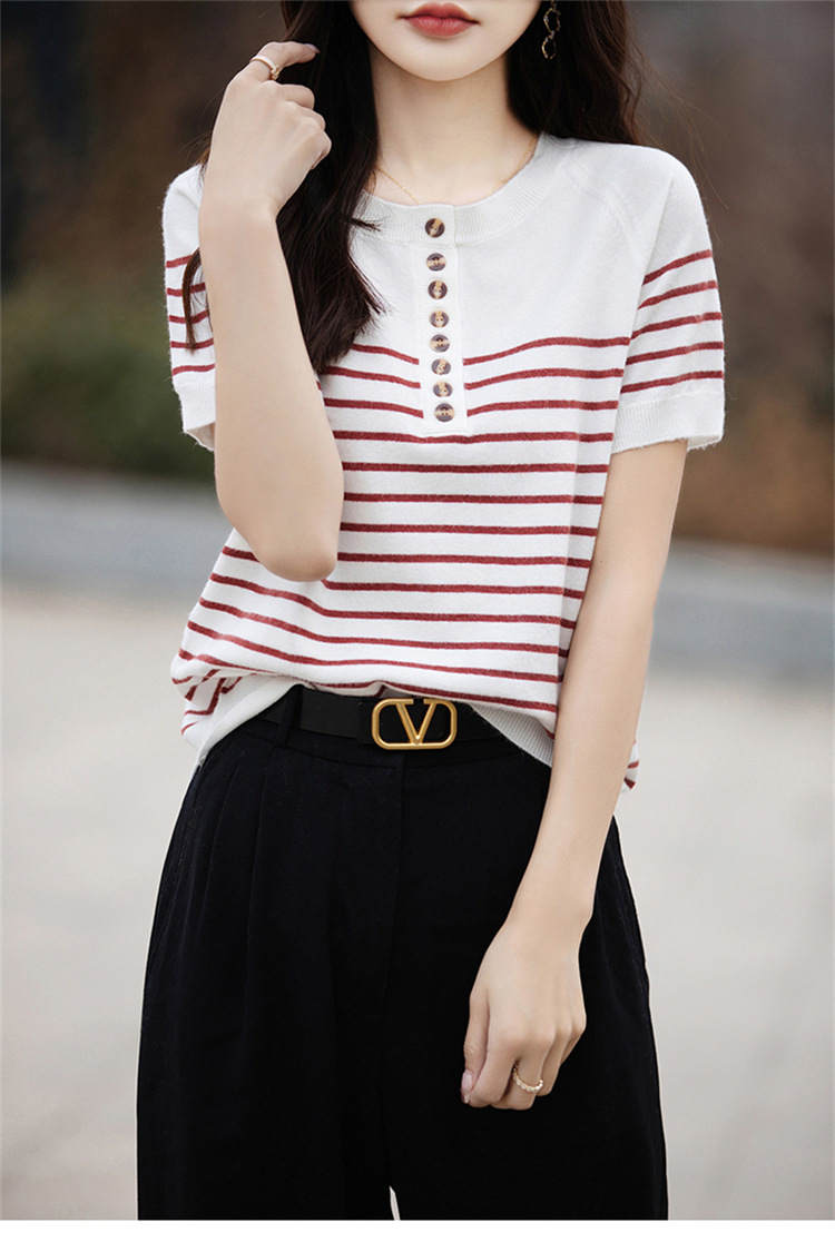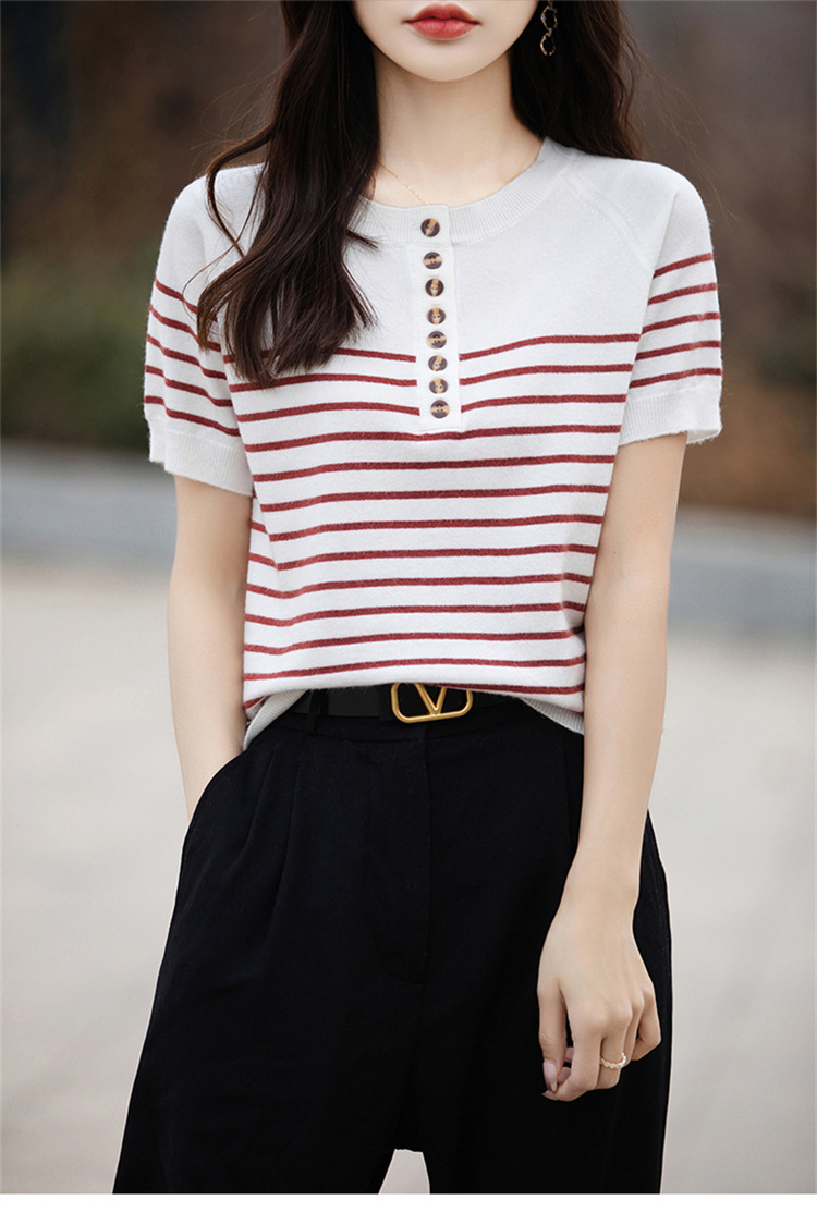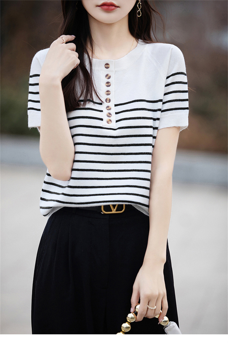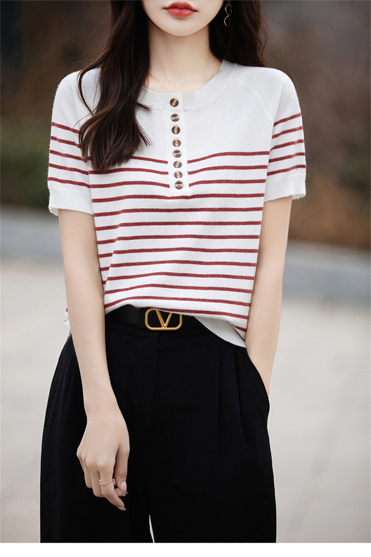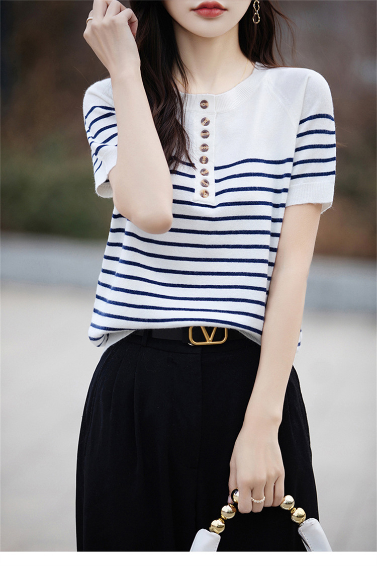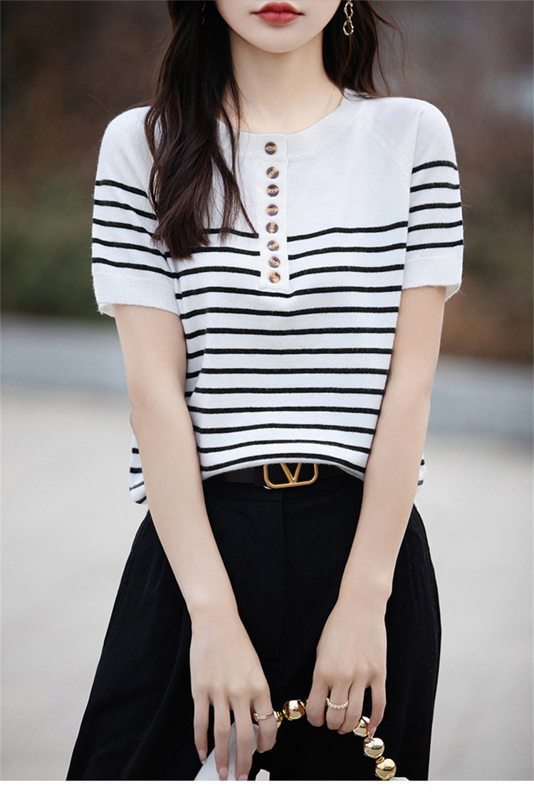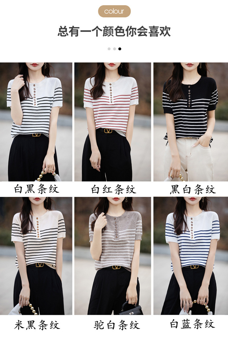 2024 년 여름 패션 한국 스타일 느슨한 줄무늬 반팔 티셔츠 여성용 컬러 대비 하프 오픈 칼라 니트 반소매 여성용 탑