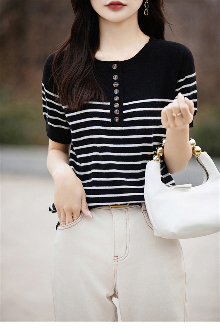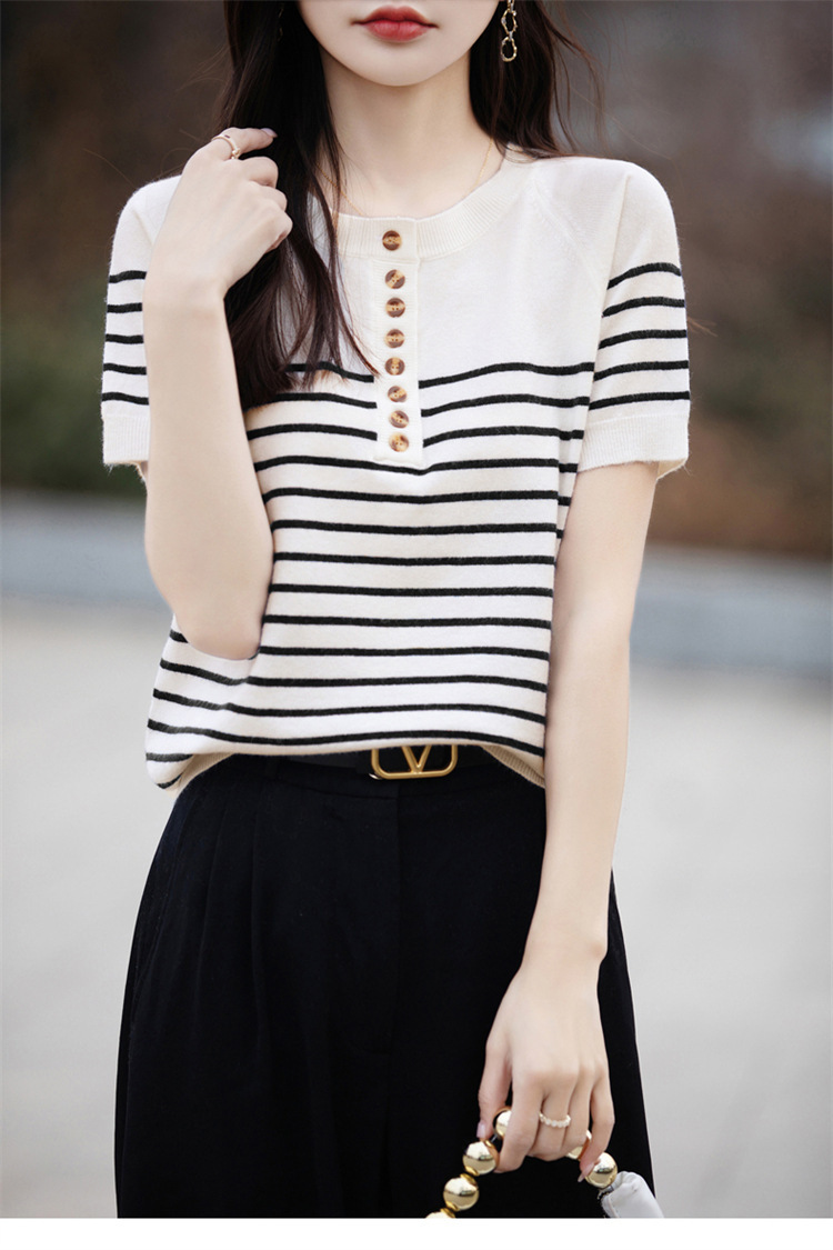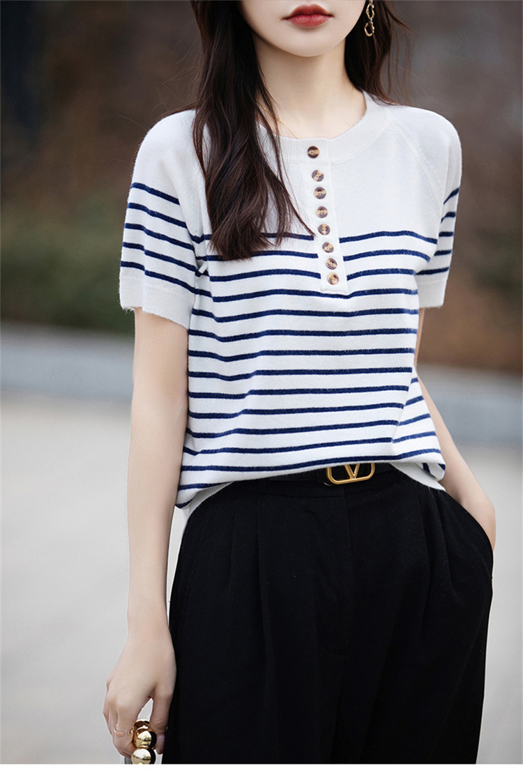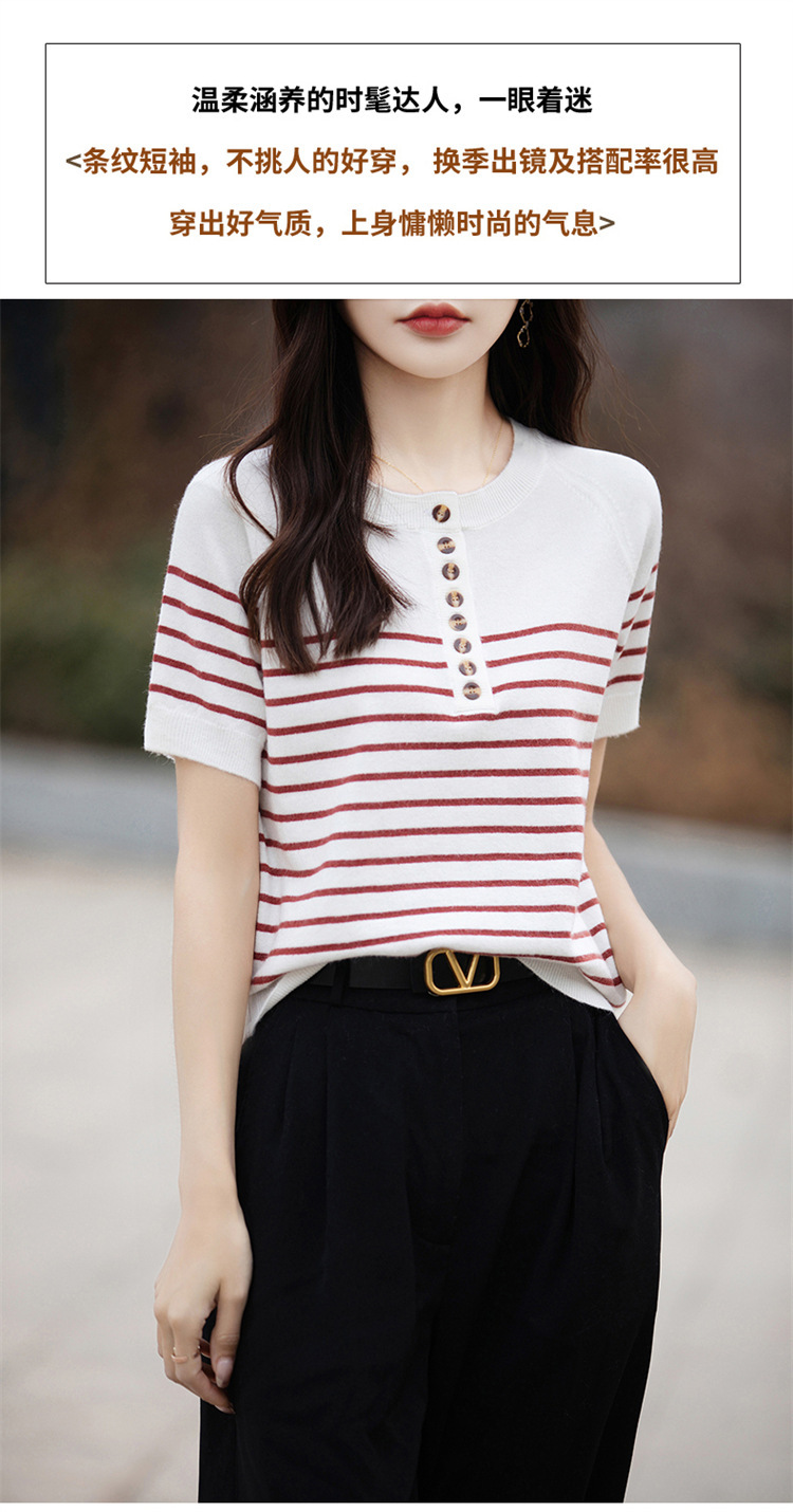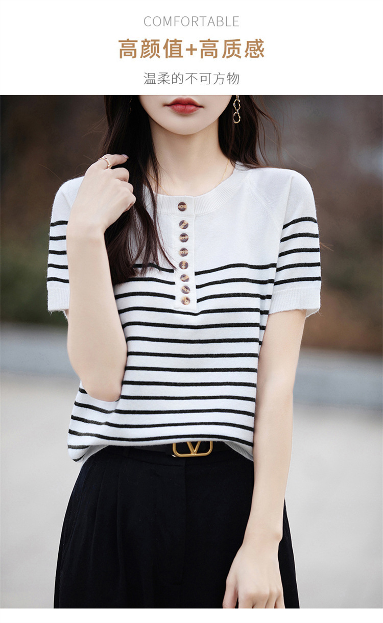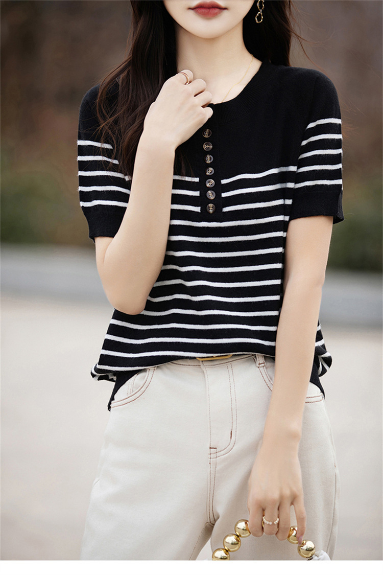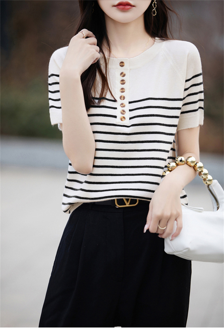 2024 년 여름 패션 한국 스타일 느슨한 줄무늬 반팔 티셔츠 여성용 컬러 대비 하프 오픈 칼라 니트 반소매 여성용 탑