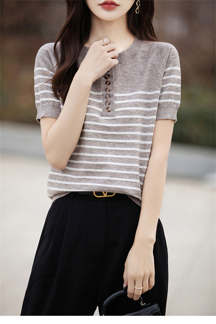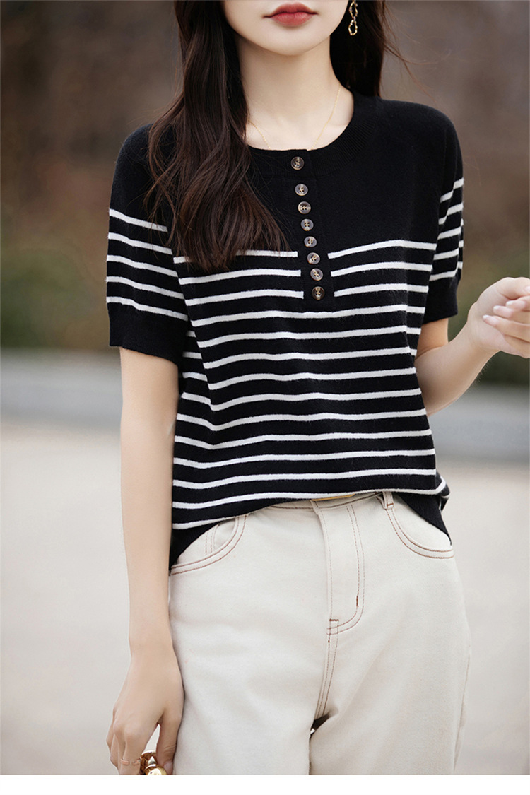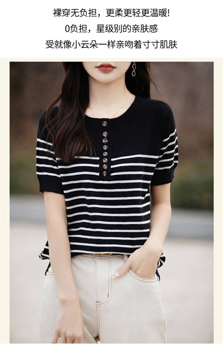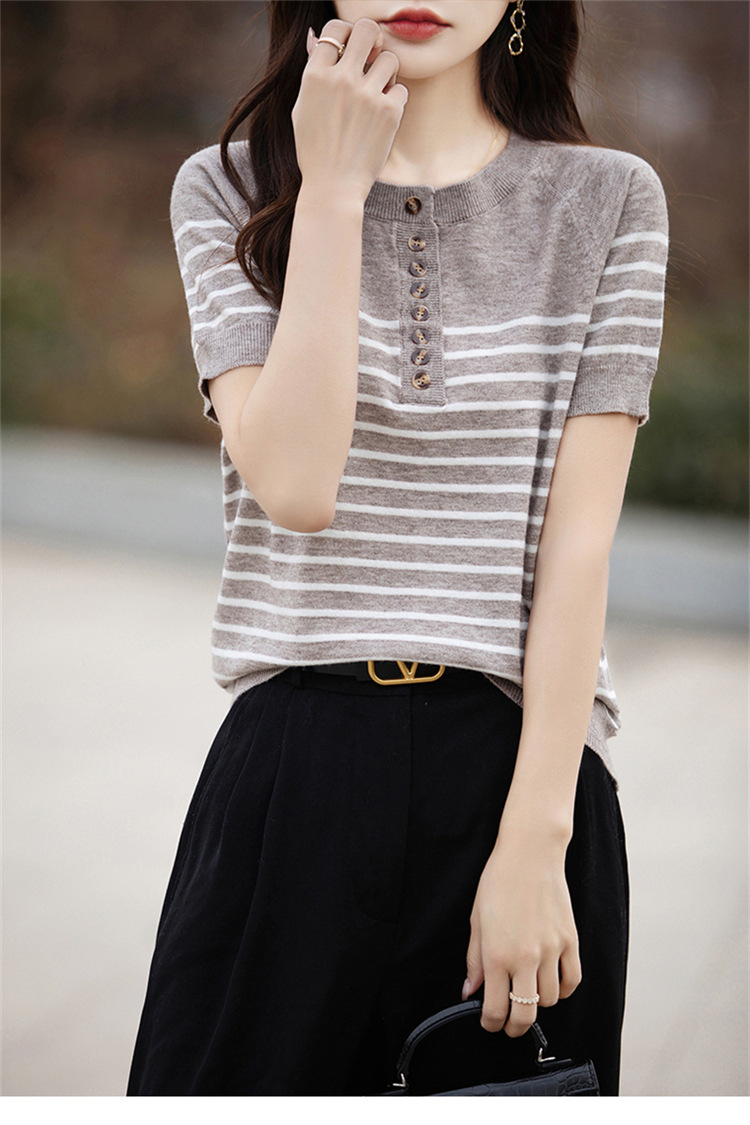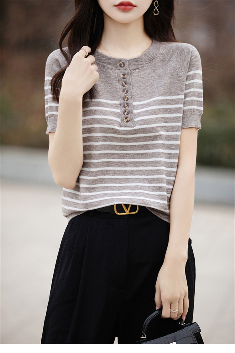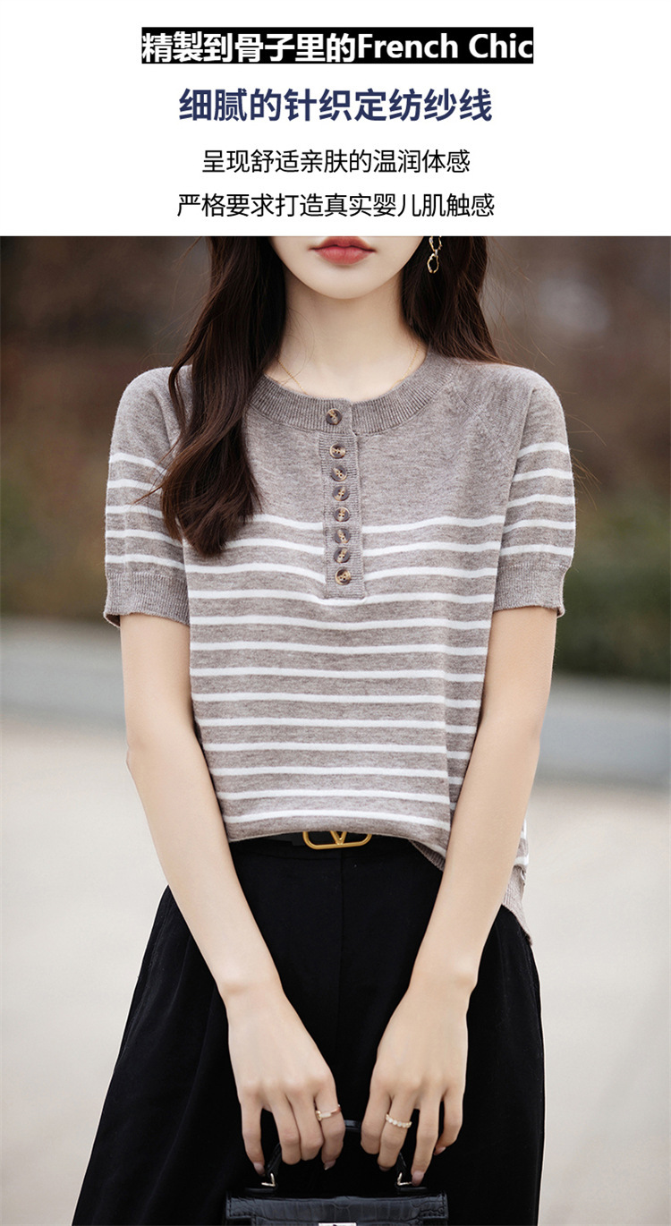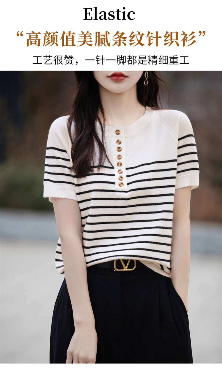 2024 년 여름 패션 한국 스타일 느슨한 줄무늬 반팔 티셔츠 여성용 컬러 대비 하프 오픈 칼라 니트 반소매 여성용 탑
