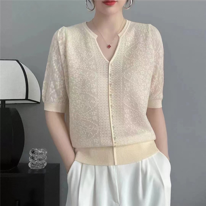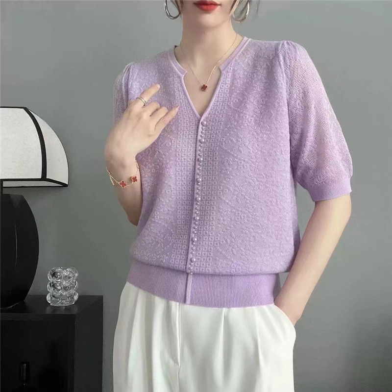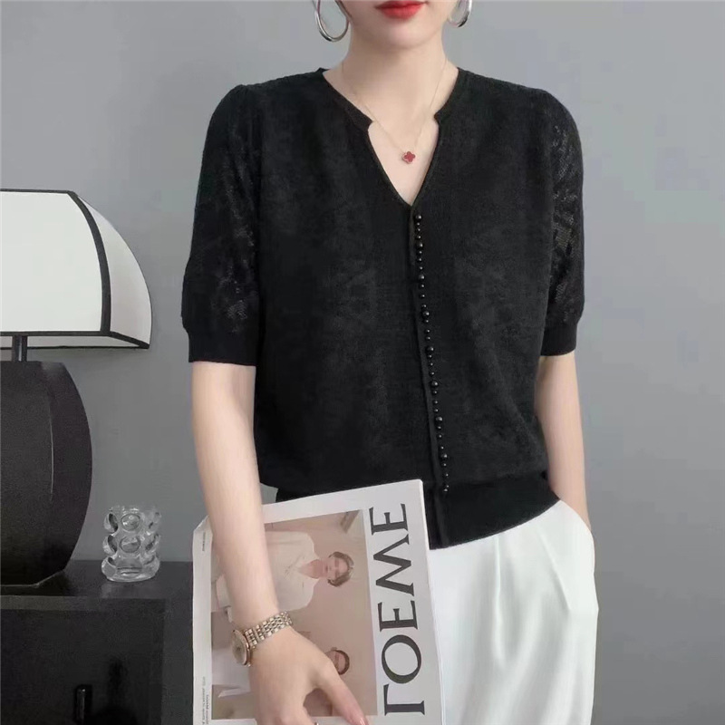 여름 새로운 아이스 실크 반팔 티셔츠 여성 V 넥 구슬 디자인 패션 올 매치 할로우 크로 셰 니트 탑