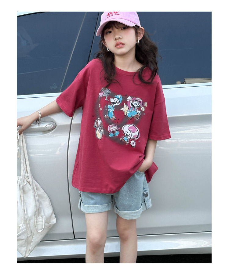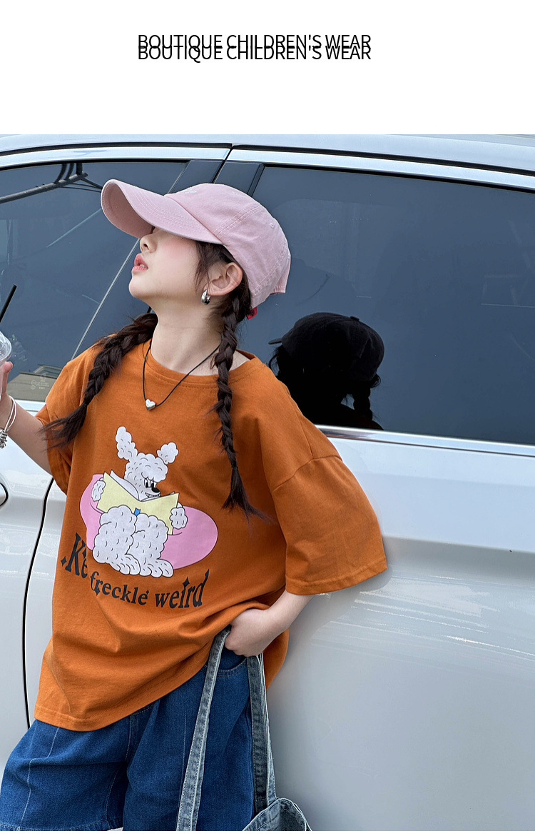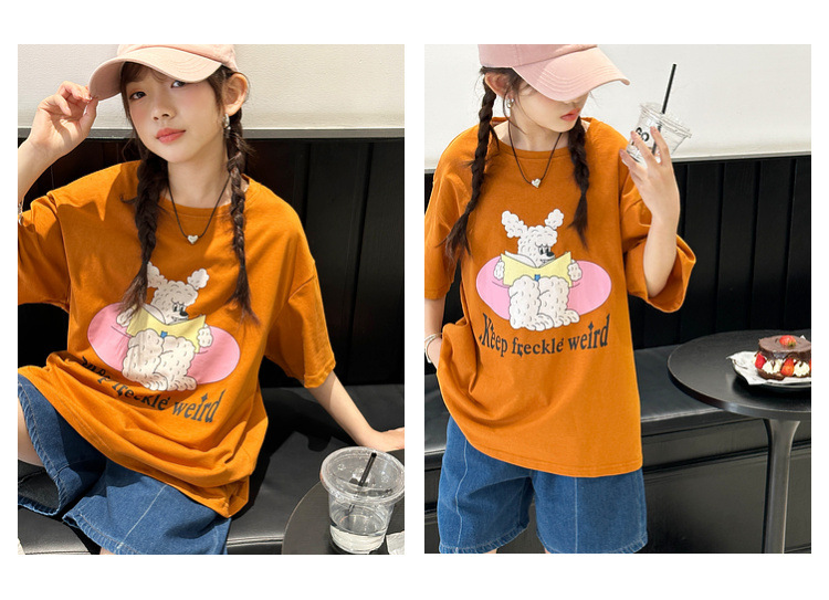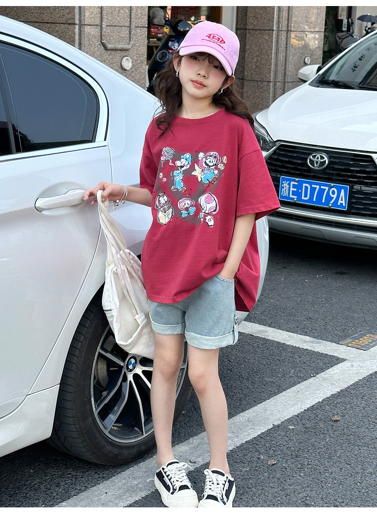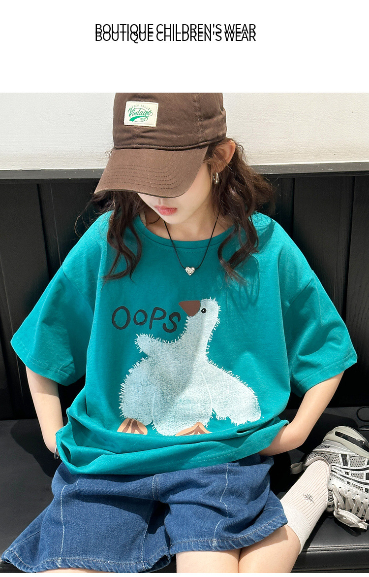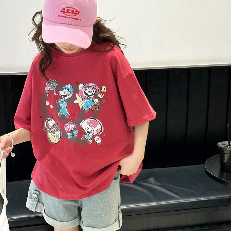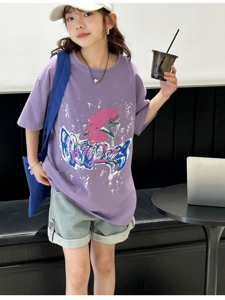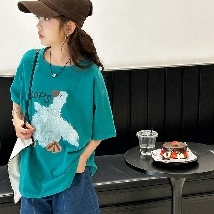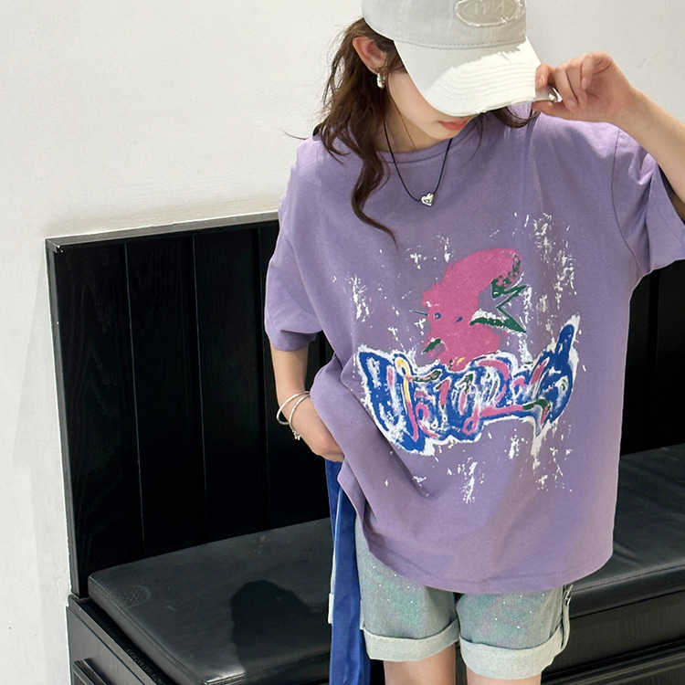 여자 반팔 티셔츠 2025 새로운 여름 여자 유행 브랜드 느슨한 여름 옷 어린이 여름 스타일 큰 어린이 한국 스타일상의