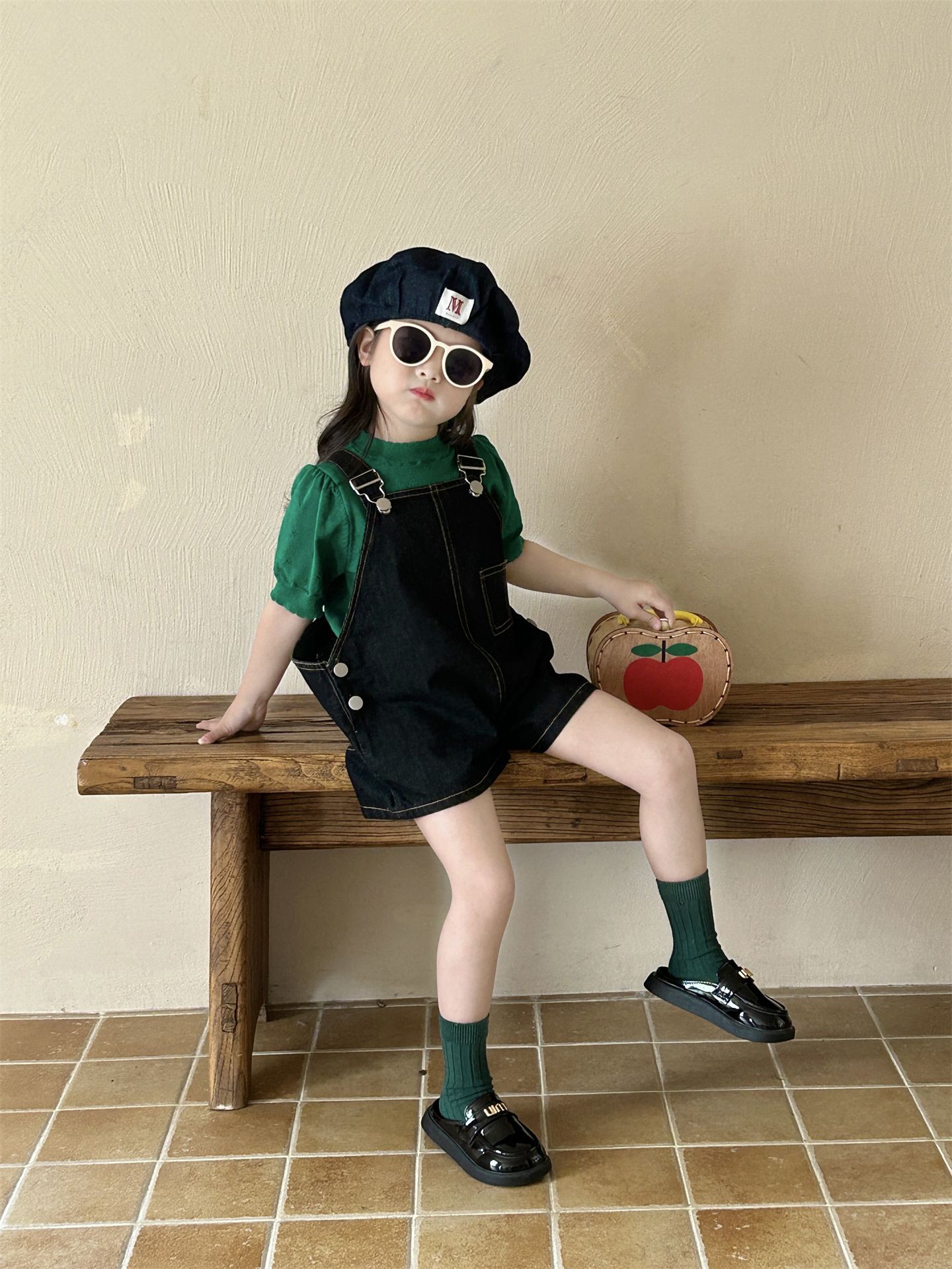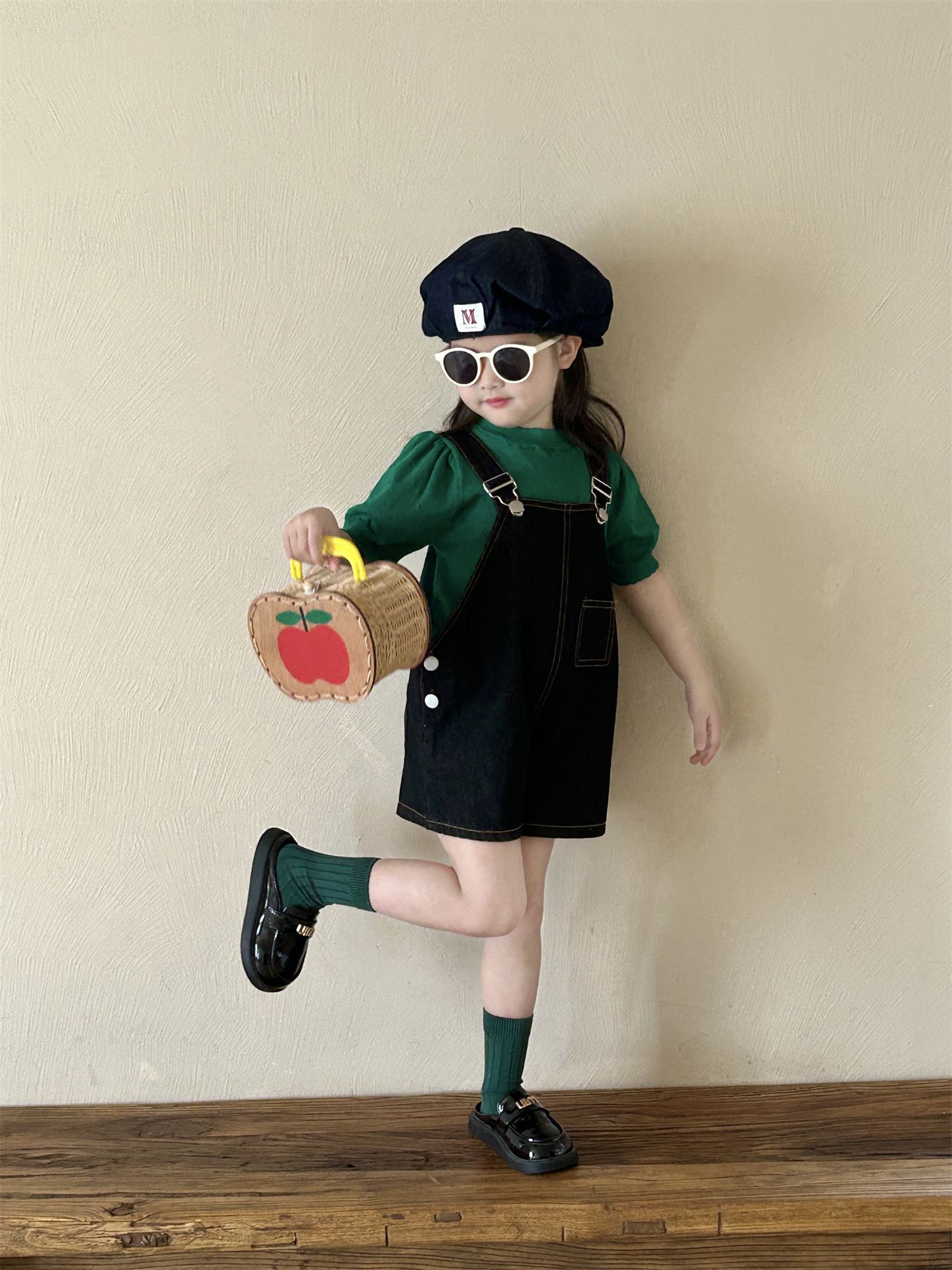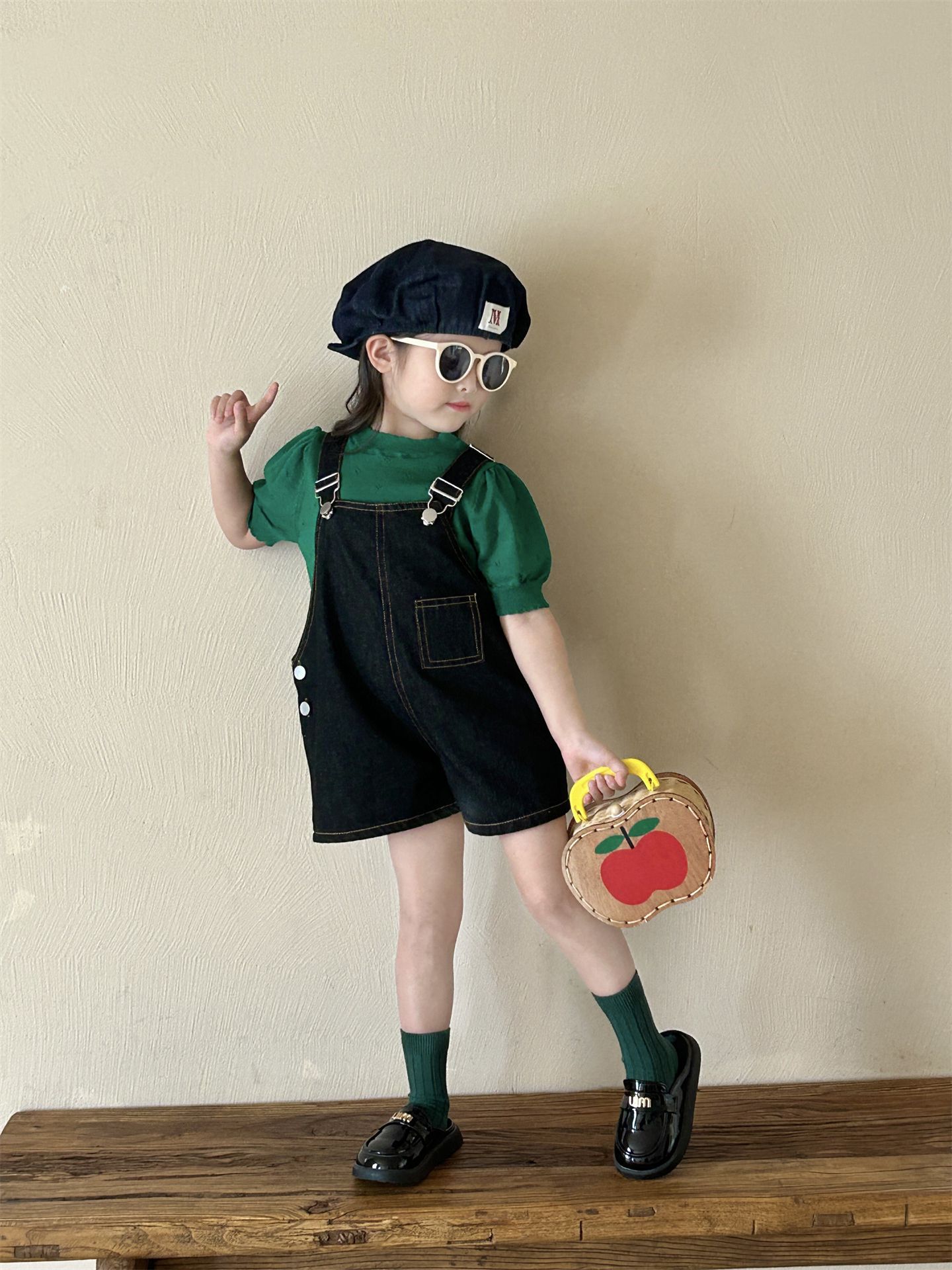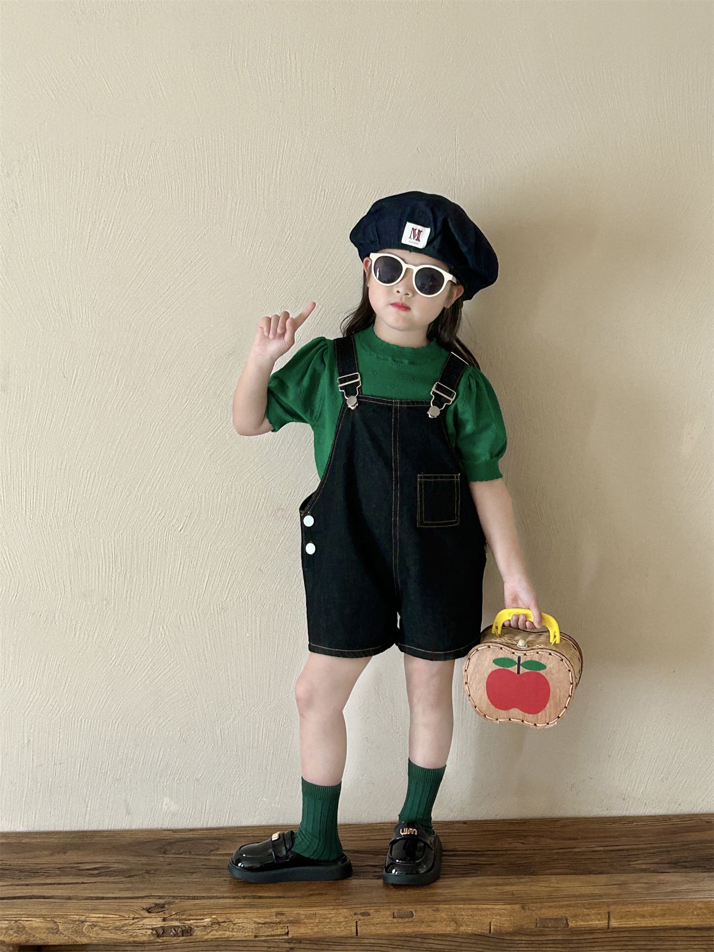 소녀 한국식 양동이 바지 2024 여름 새 어린이 아기 데님 양동이 짧은 니트 반소매 탑스토어 가기