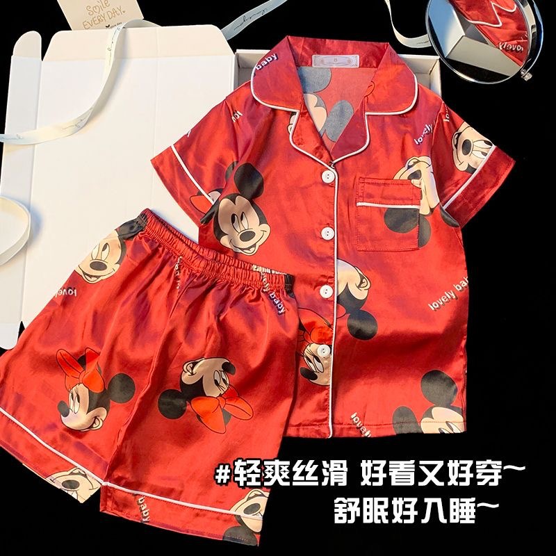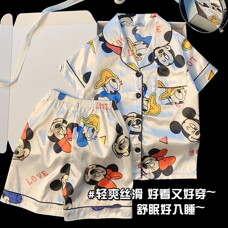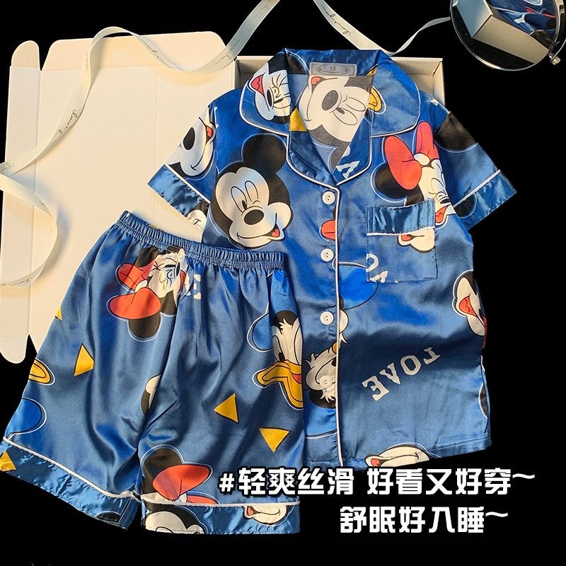 새로운 짧은 소매 옷깃 어린이 아이스 실크 파자마 세트 홈 옷 소년 카디건 짧은 소매 만화 소녀 홈 옷