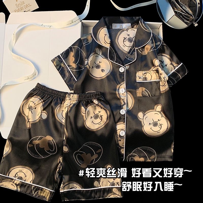 새로운 짧은 소매 옷깃 어린이 아이스 실크 파자마 세트 홈 옷 소년 카디건 짧은 소매 만화 소녀 홈 옷스토어 가기