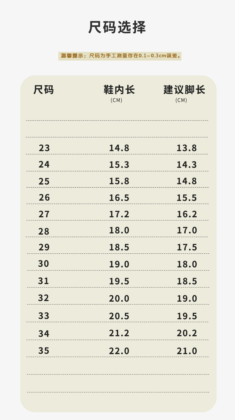 尺码为人工测量,因测量工具和测量方法不同等因素,会存在5MM的误差,请根据您平时给宝宝的穿着习惯参考尺码表及评价详情,自主购物,或者咨询客服推荐合适尺码。
