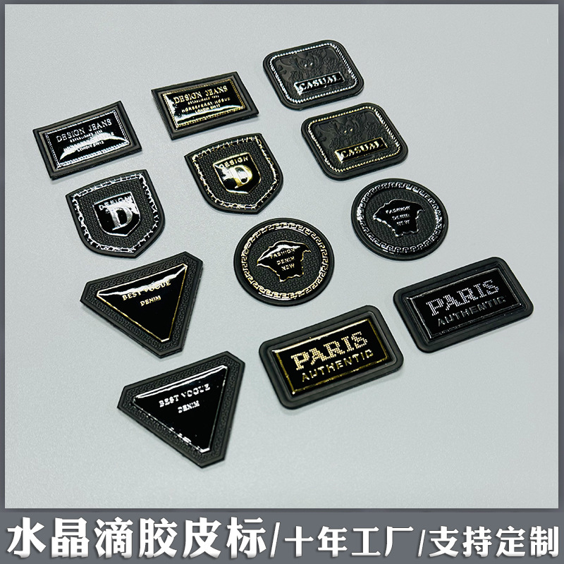 크리스탈 드롭 접착제 가죽 라벨 10 년 공장 핫 스탬핑 실버 pu 가죽 의류 장식 표준 가방 가죽 브랜드 가죽 배지