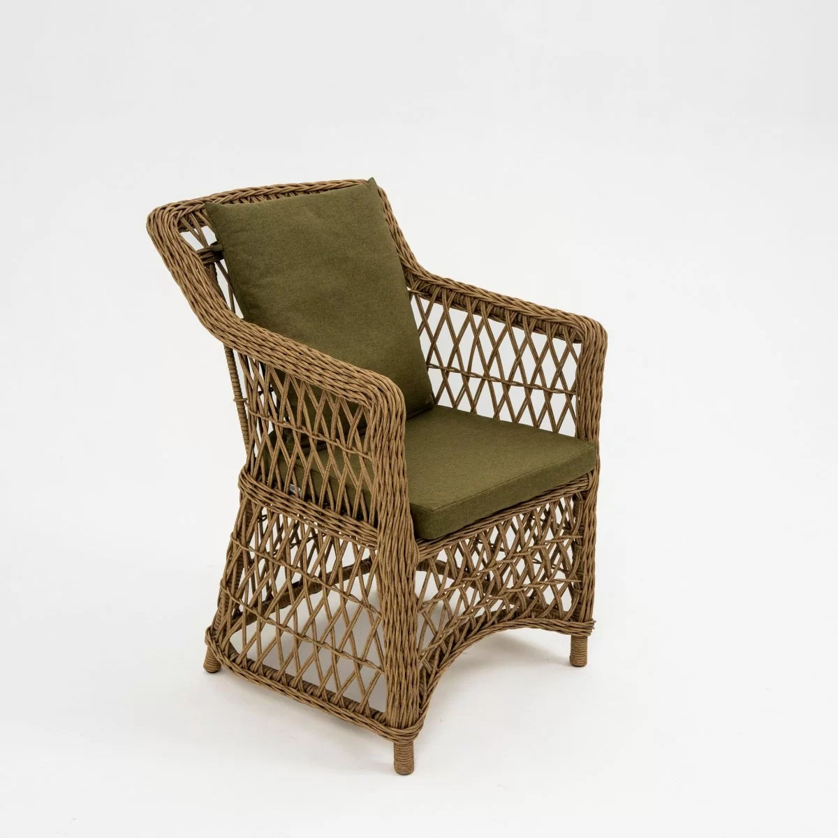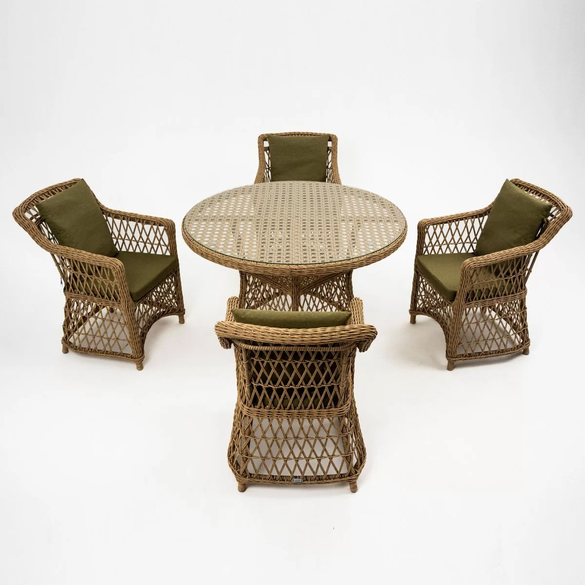 • 사각 등받이 중공 식탁 의자 4개 + 90CM 중공 등나무 원형 테이블 [브라운 아미 그린 쿠션]