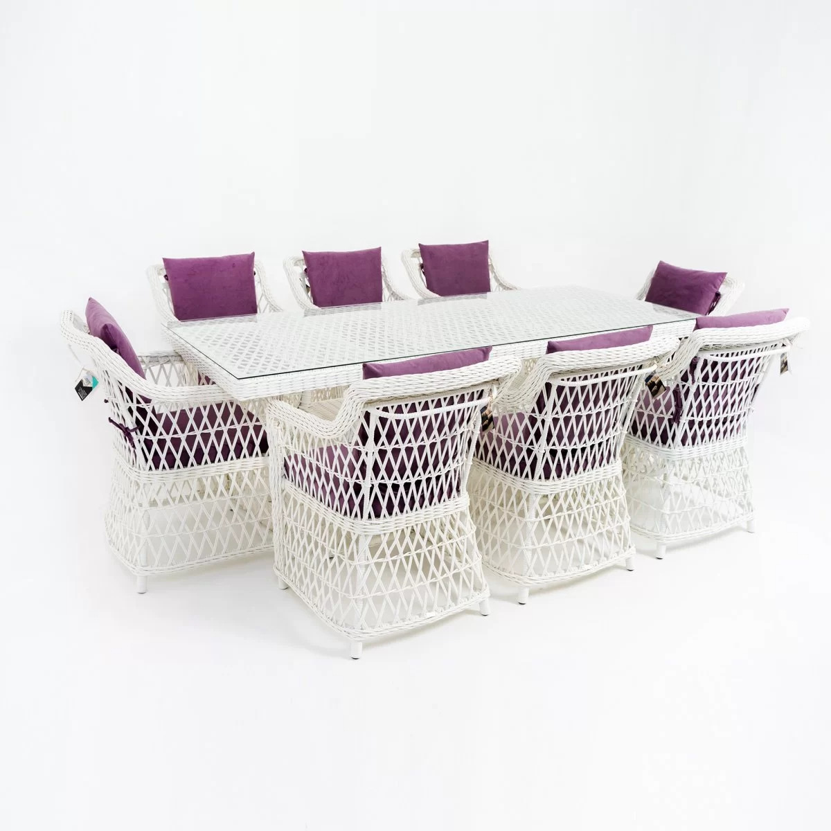 • 사각 등받이 중공 식탁 의자 8개 + 210CM 중공 등나무 롱 테이블 [화이트 라탄 퍼플 쿠션]