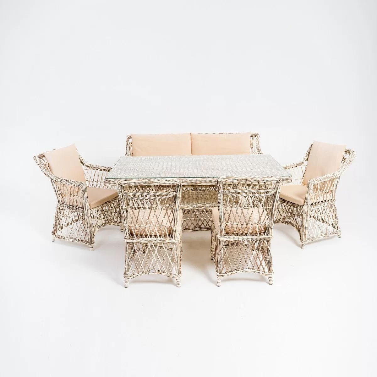 • 사각 등받이 중공 식탁 의자 4개 + 사각 등받이 이중 중공 소파 + 160CM 중공 등나무 롱 테이블 [쌀 등나무 베이지 쿠션]
