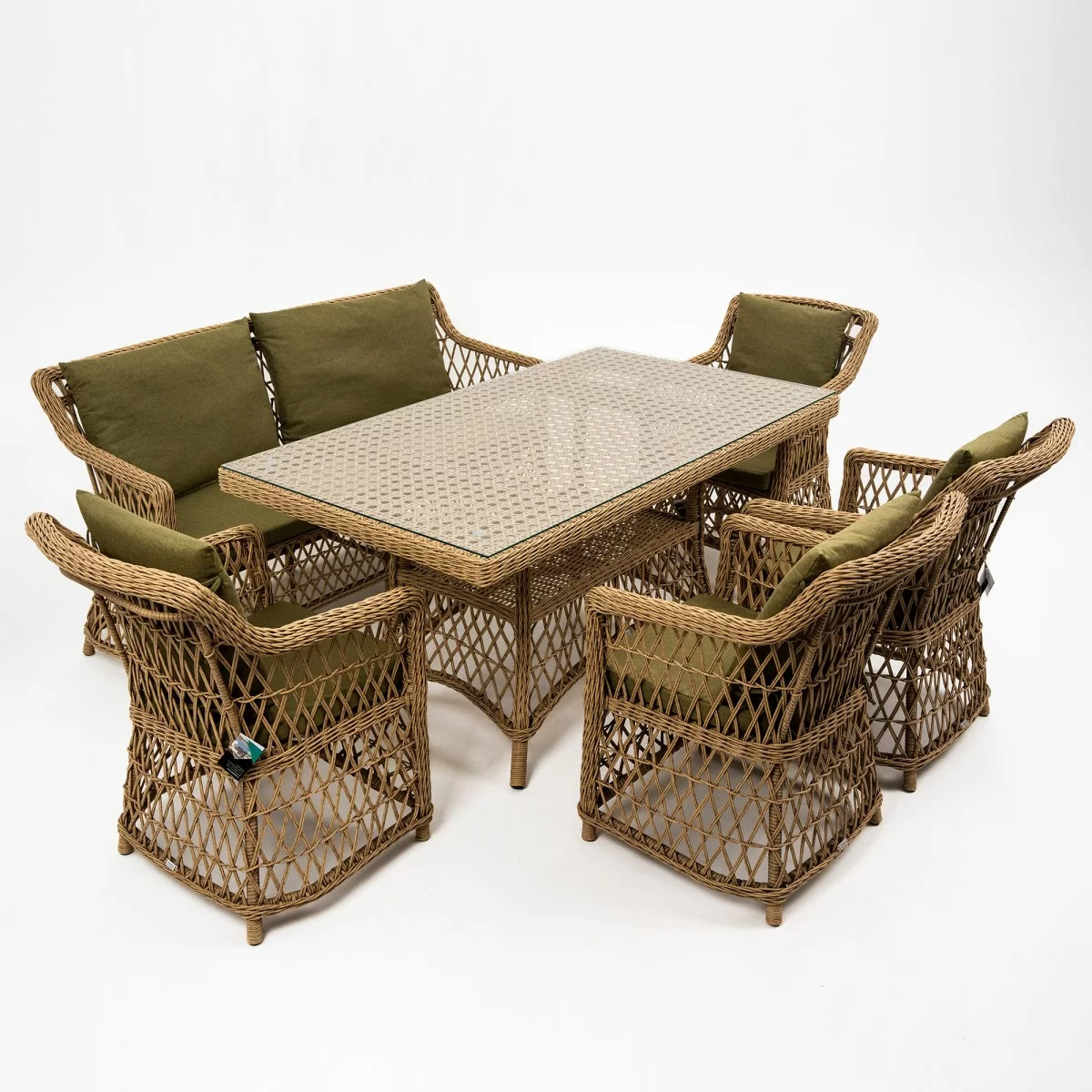 • 사각 등받이 중공 식탁 의자 4개 + 사각 등받이 이중 중공 소파 + 160CM 중공 등나무 롱 테이블 [브라운 아미 그린 쿠션]
