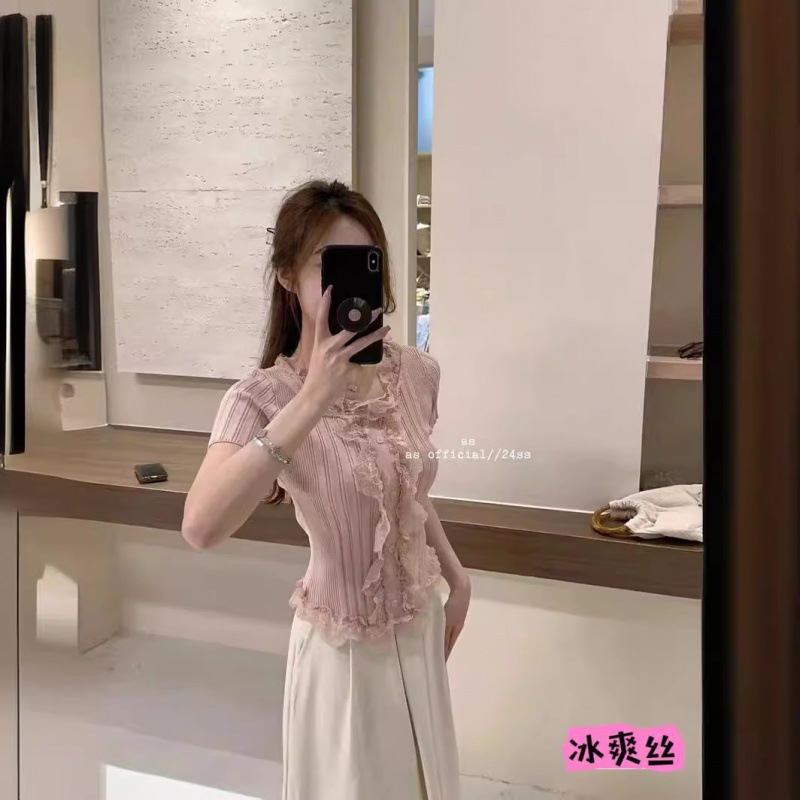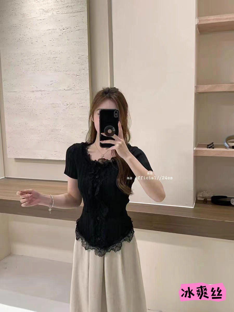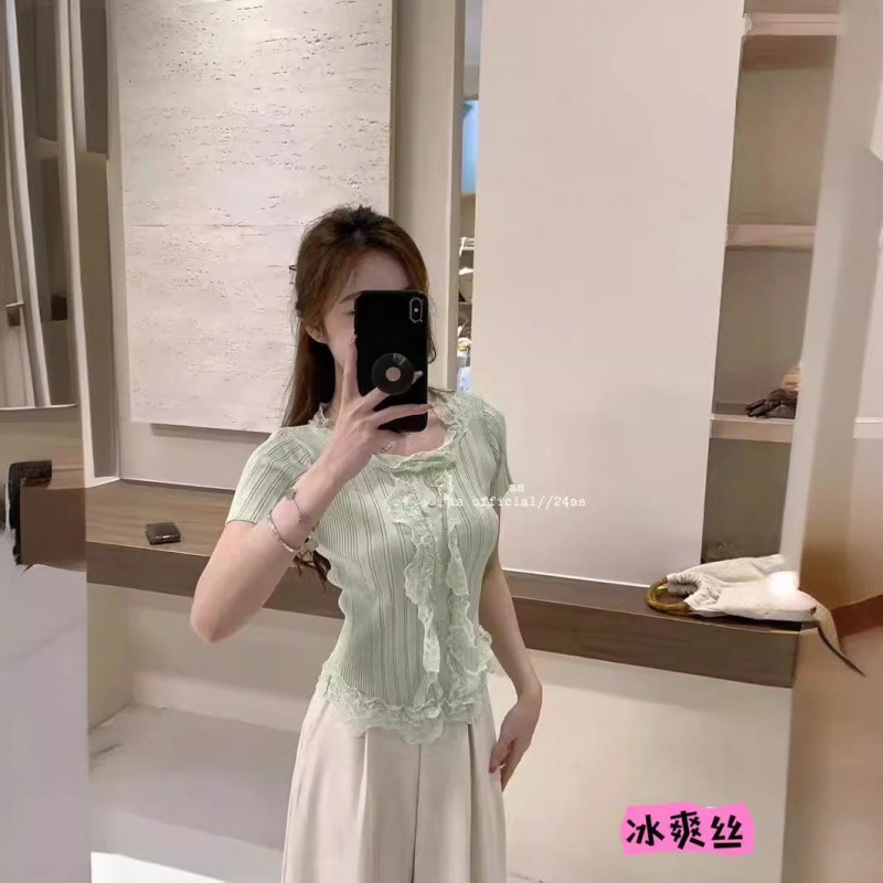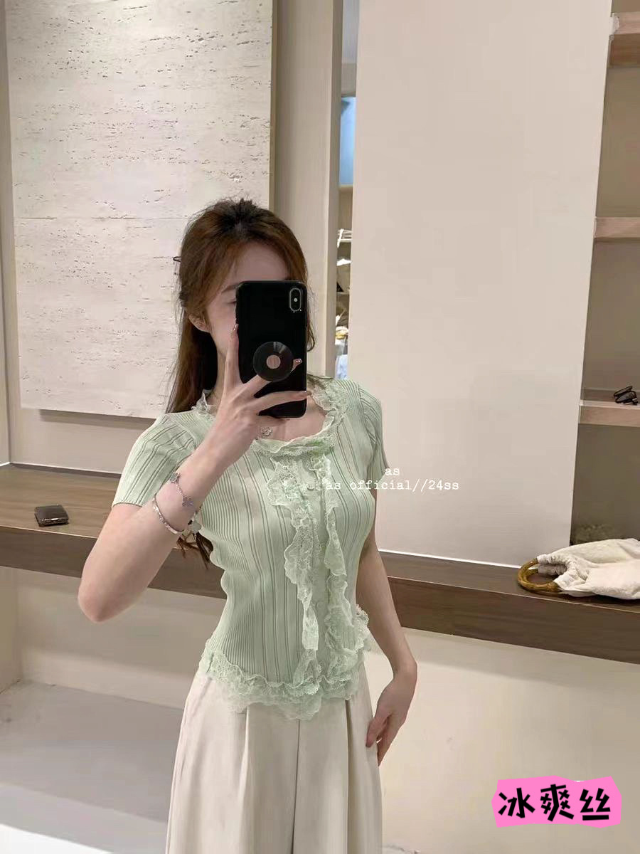 여름 달콤하고 매운 섹시한 레이스 바느질 V 넥 반팔 스웨터 여성의 우아한 올 매치 슬림 핏 티셔츠 쇼트 탑스토어 가기
