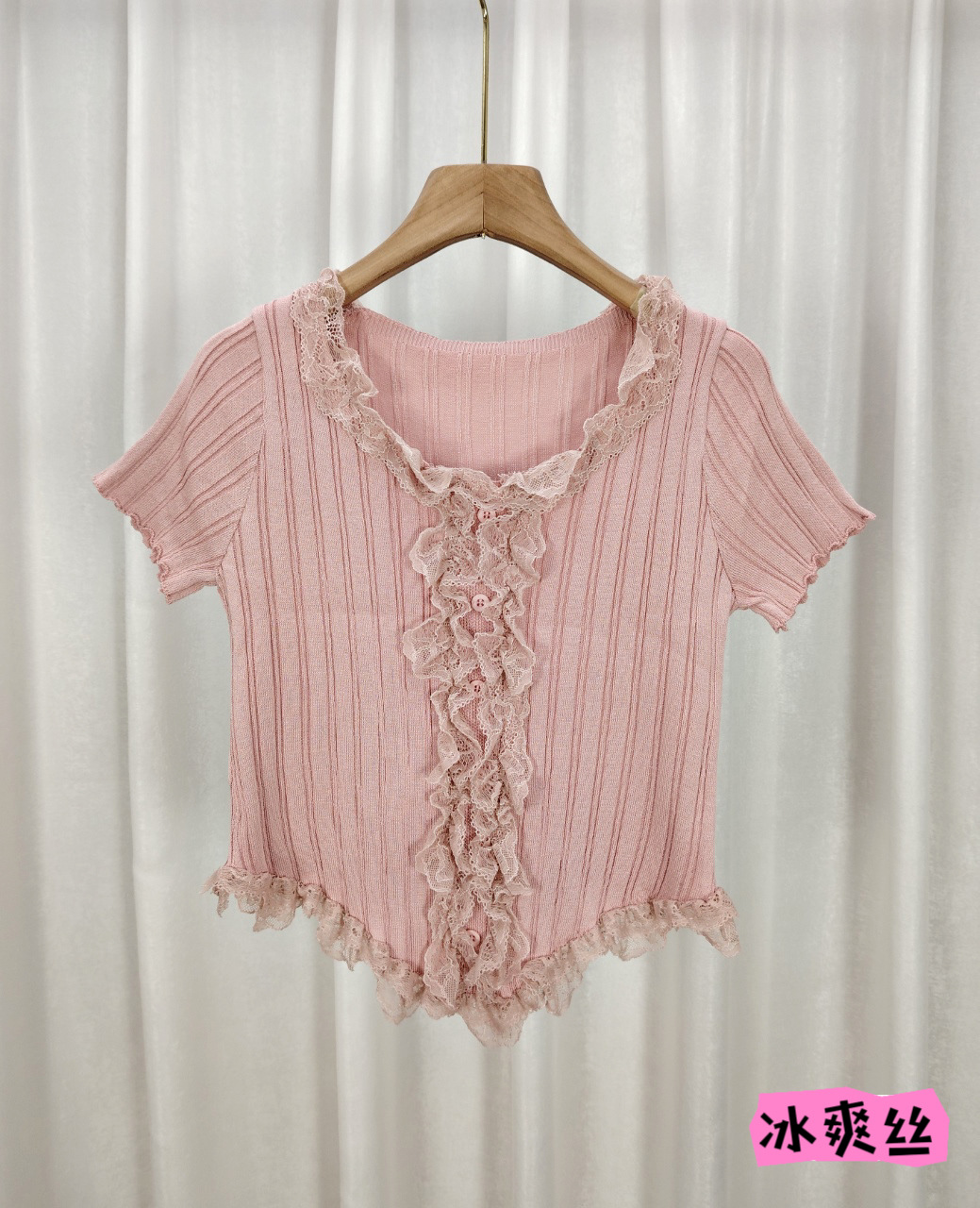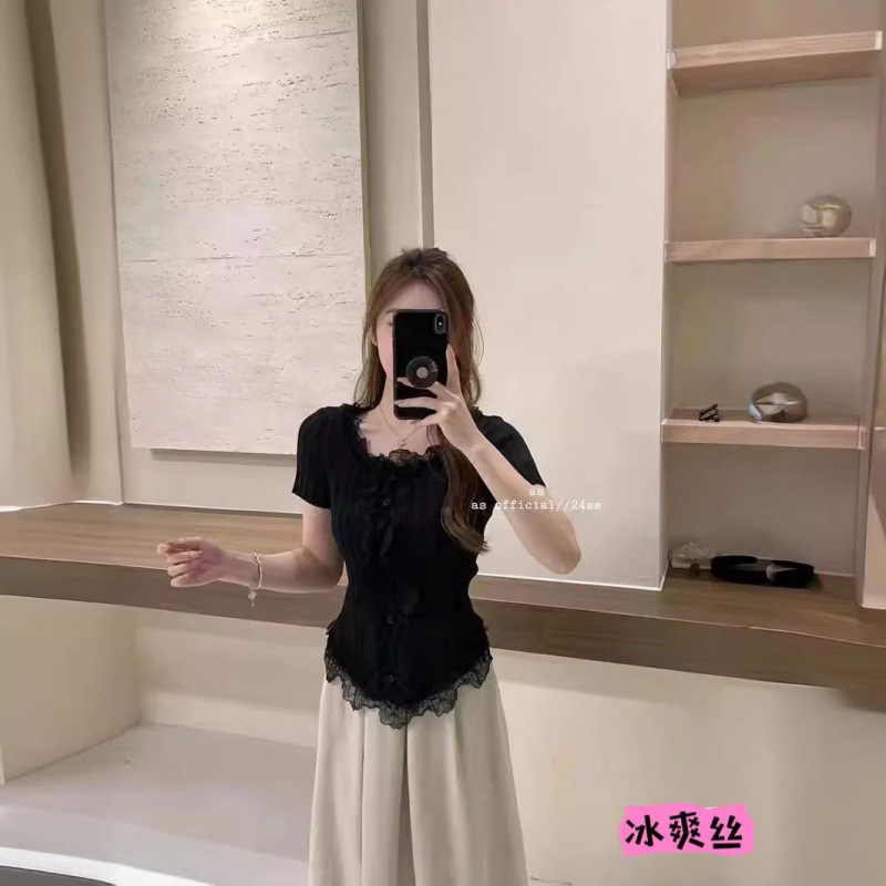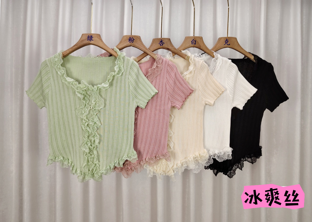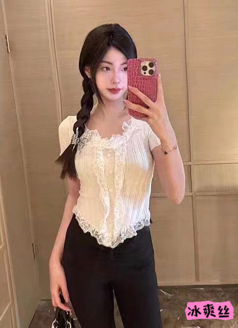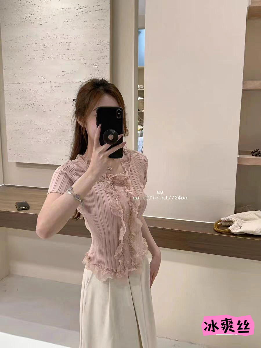 여름 달콤하고 매운 섹시한 레이스 바느질 V 넥 반팔 스웨터 여성의 우아한 올 매치 슬림 핏 티셔츠 쇼트 탑스토어 가기