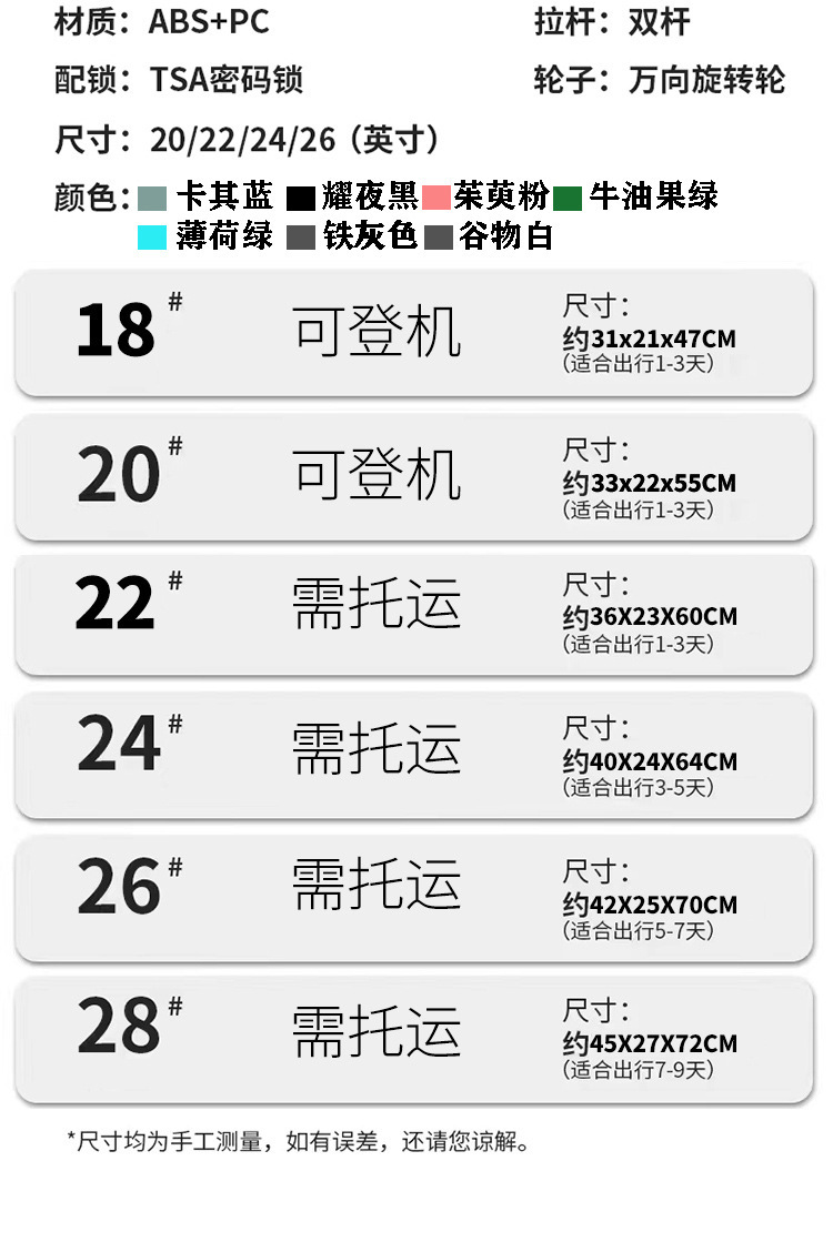 • 20 인치 (추천 초등학생에게 투명 상자 세트를 보내기 위해 비행기에 탑승 할 수 있음)