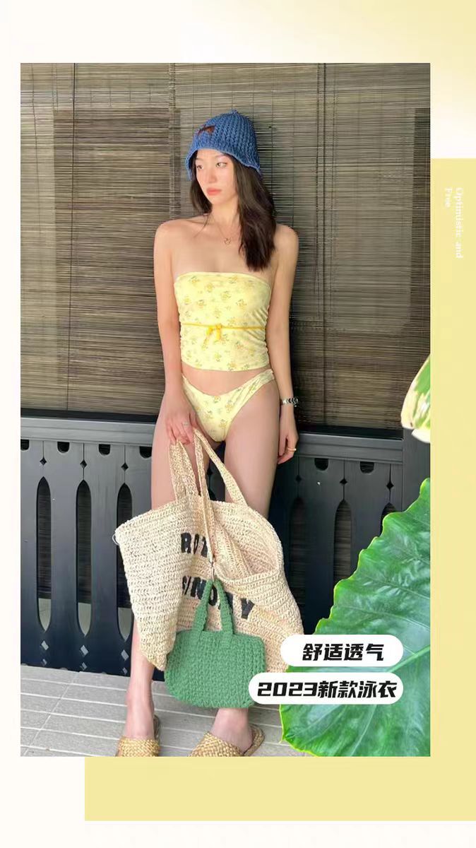 2024 새로운 스타일 스파이스 소녀 노란색 꽃 스플릿 스트랩리스 수영복 여성용 화이트 슬리밍 비키니 비치 수영복스토어 가기