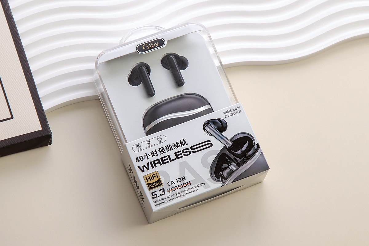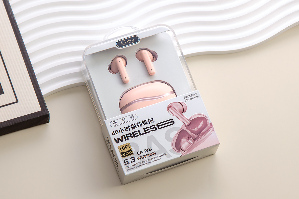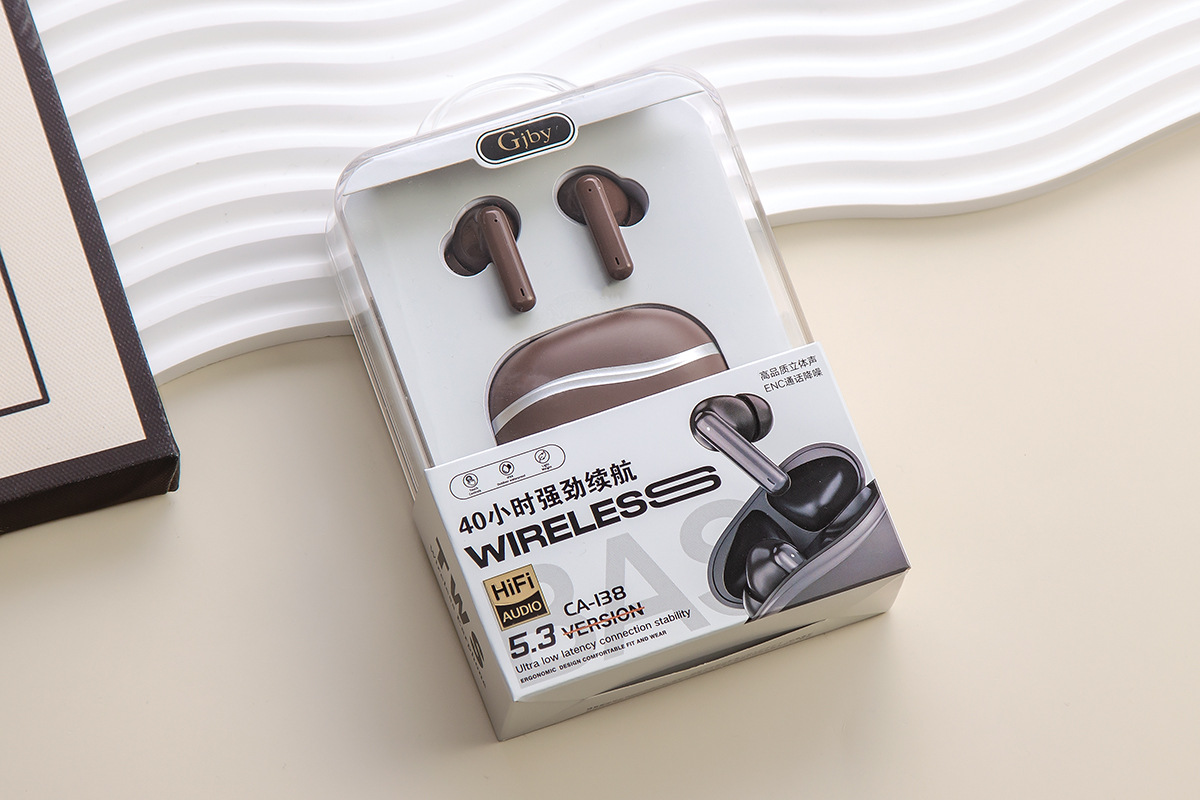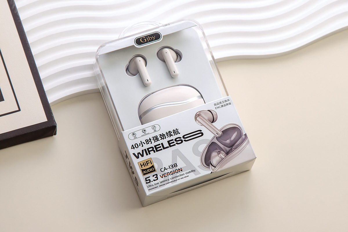 耳机从充电仓拿出自动开机,指示灯红蓝交替闪烁,进入配对模式,打开蓝牙设备并搜索“CA-138”手动点击,连接配对成功后有音效提示。