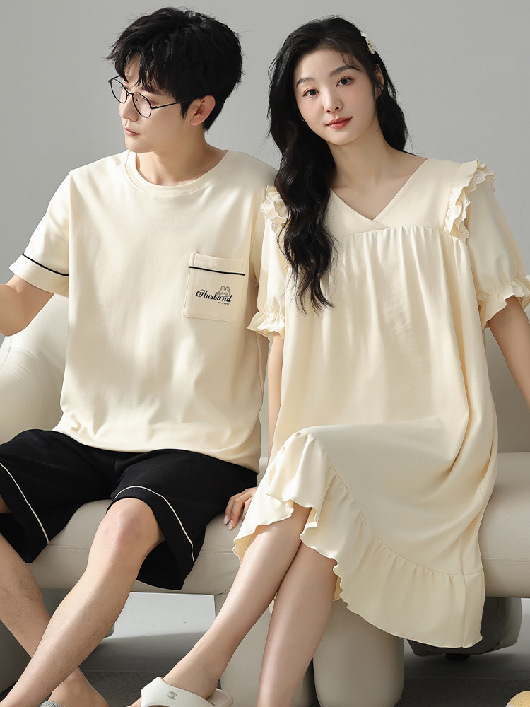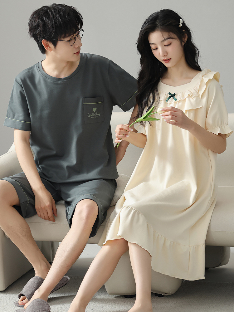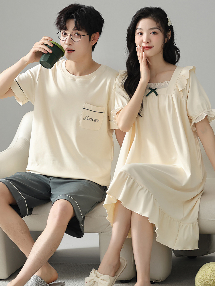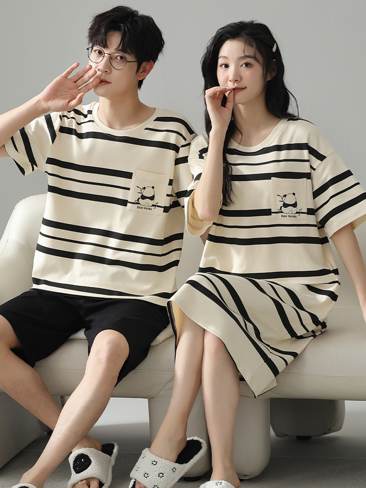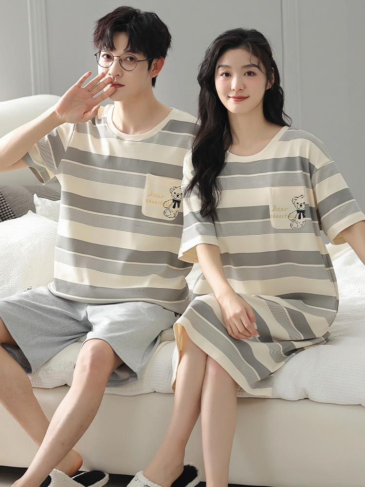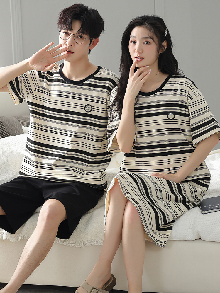 커플 잠옷 여름 순면 반팔 반바지 여성 줄무늬 잠옷 남성용 겉옷 얇은 느슨한 홈 옷