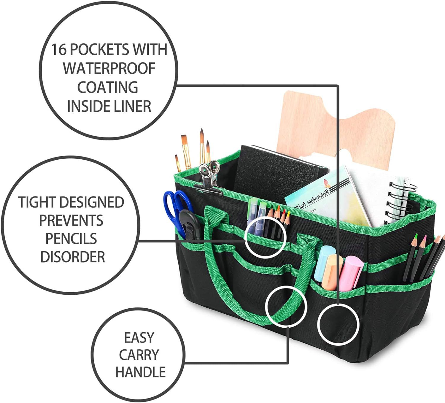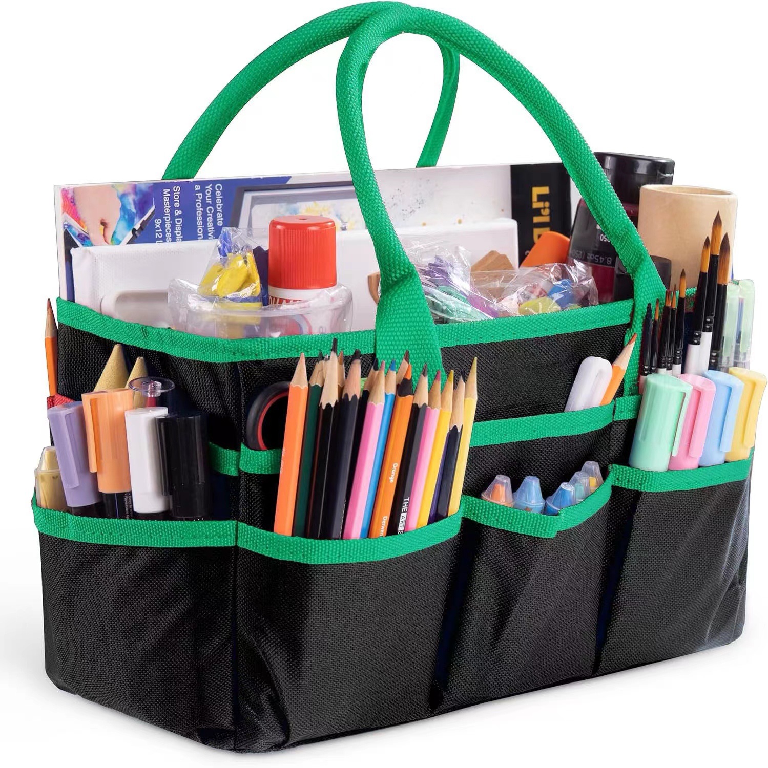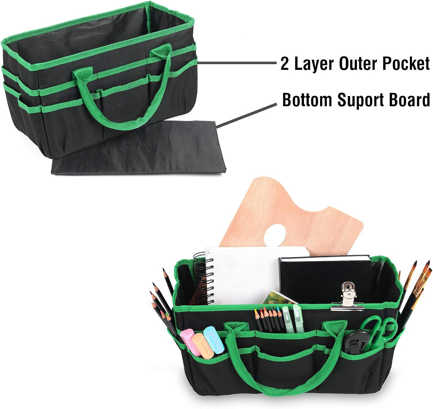 【产品功能】这个教师手提袋可以放各种东西,从马克笔、铅笔到剪刀、胶水……再加上一个超大的内部空间,足够放书、文件夹、记事本等等。有坚固提手可携带去任何地方,并保持基本的教学用品组织整洁和方便。平时放在办公桌上当文具收纳盒用,不用时折叠存放。家庭也好使用,可存放尿片等等......