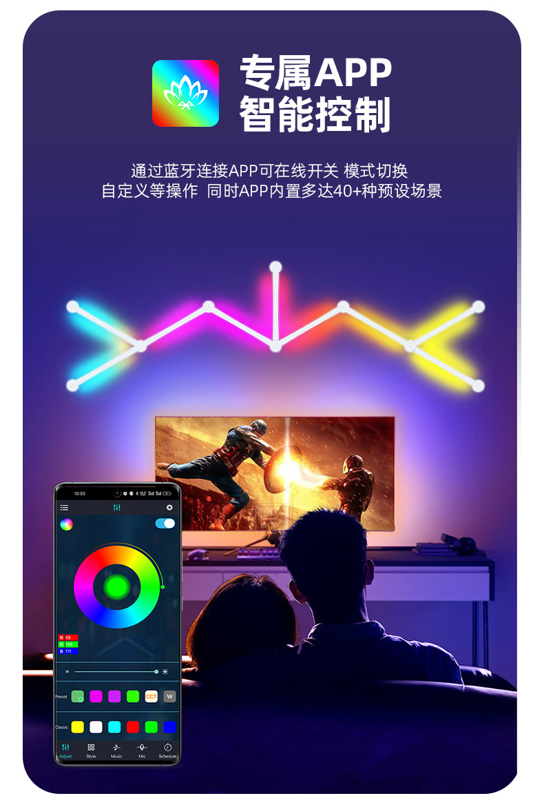 2024년 신형 분위기 조명 5V 블루투스 연결 다채로운 벽 조명, 연결이 쉬운 다이나믹 RGB 장식 조명