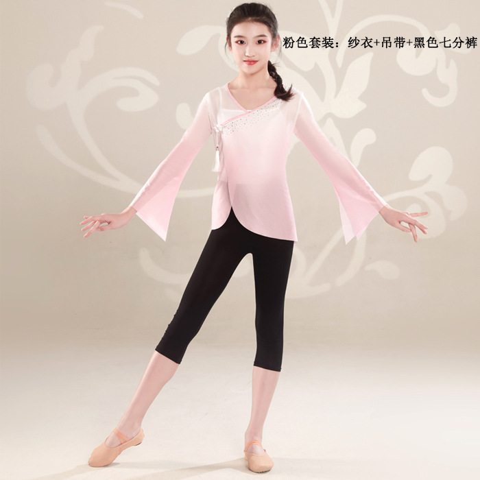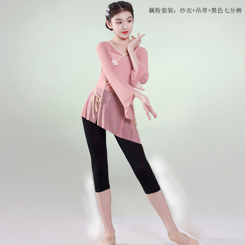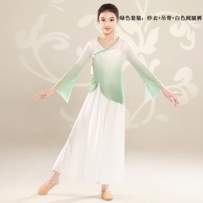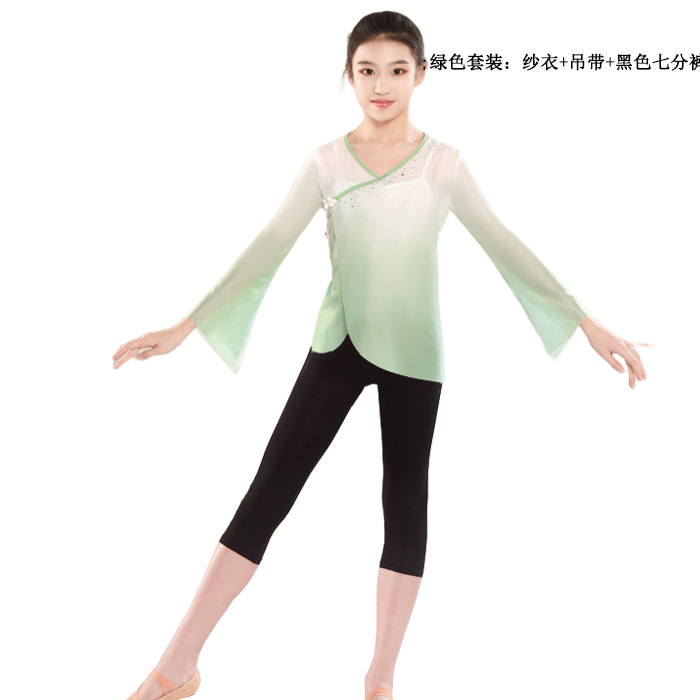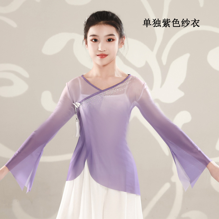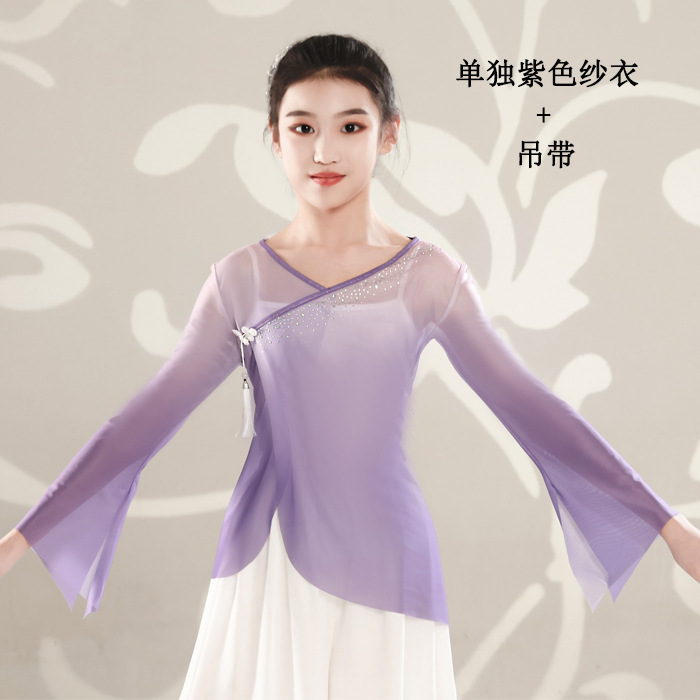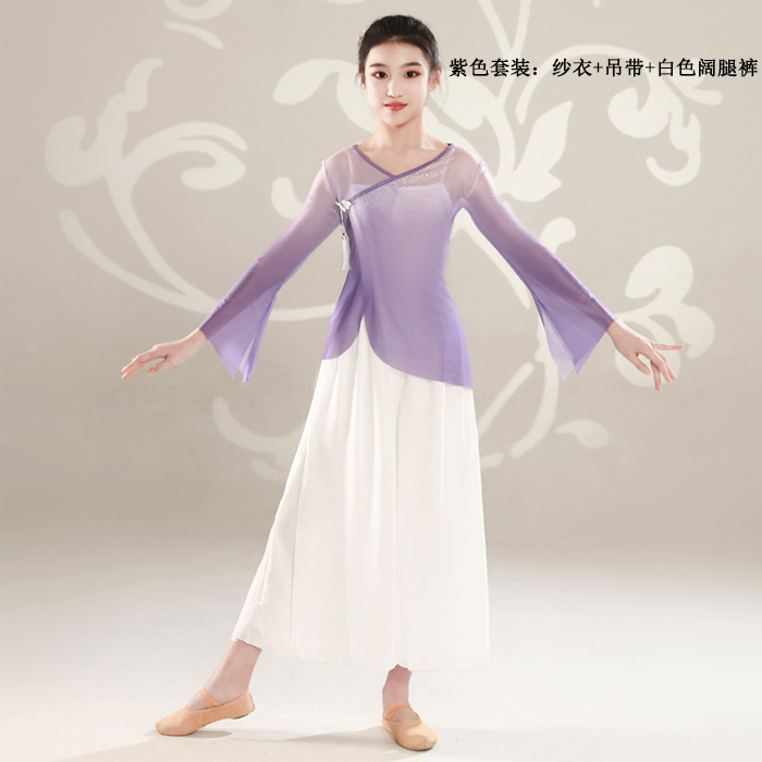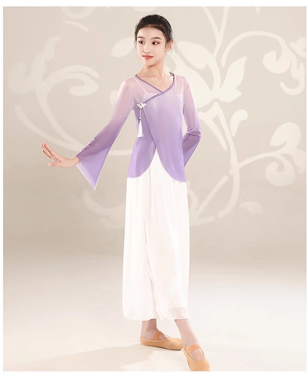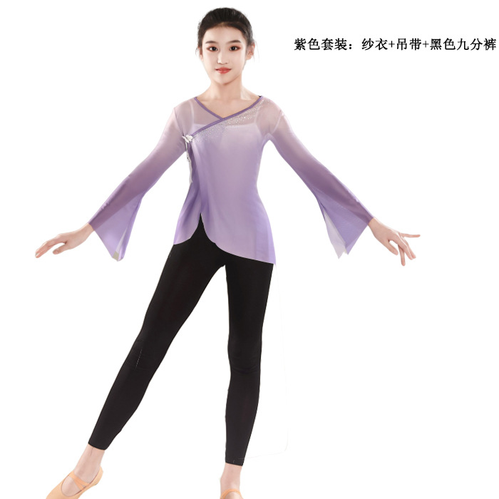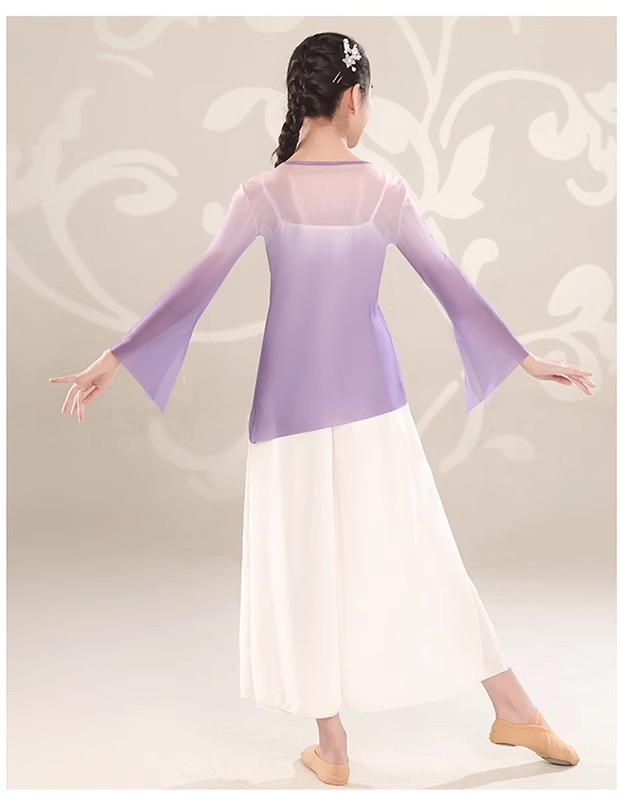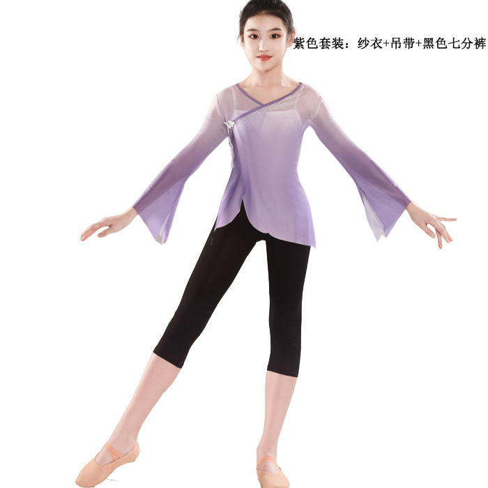 어린이 클래식 댄스 코트 교육 세트 우아한 라임 걸스 중국 댄스 공연 세트 보라색 댄스 세트 자른 바지