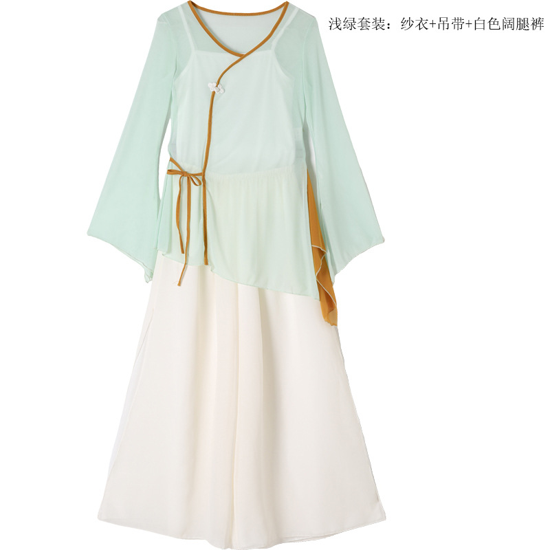 • 라이트 그린 세트: 흰색 넓은 다리 바지와 거즈 콘돌