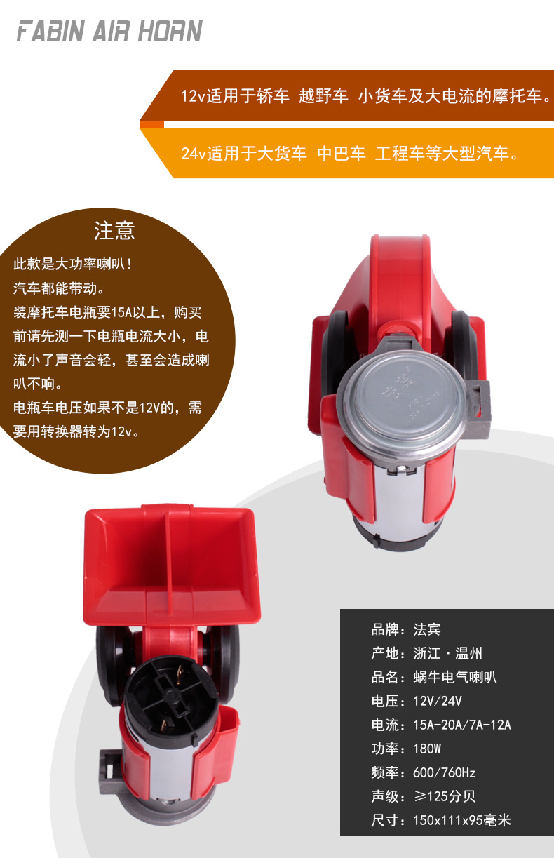국경 간 소스 파빈 달팽이 전기 경적 자동차 휘파람 트럭 트럭 보편적 인 휘파람 12v/24v