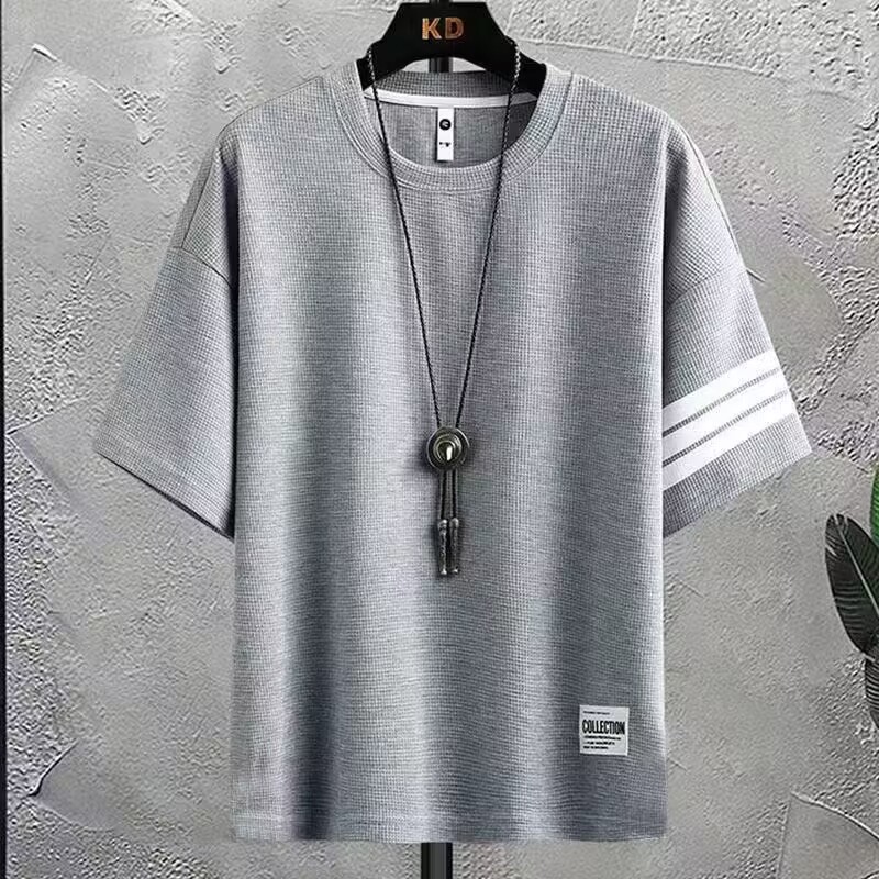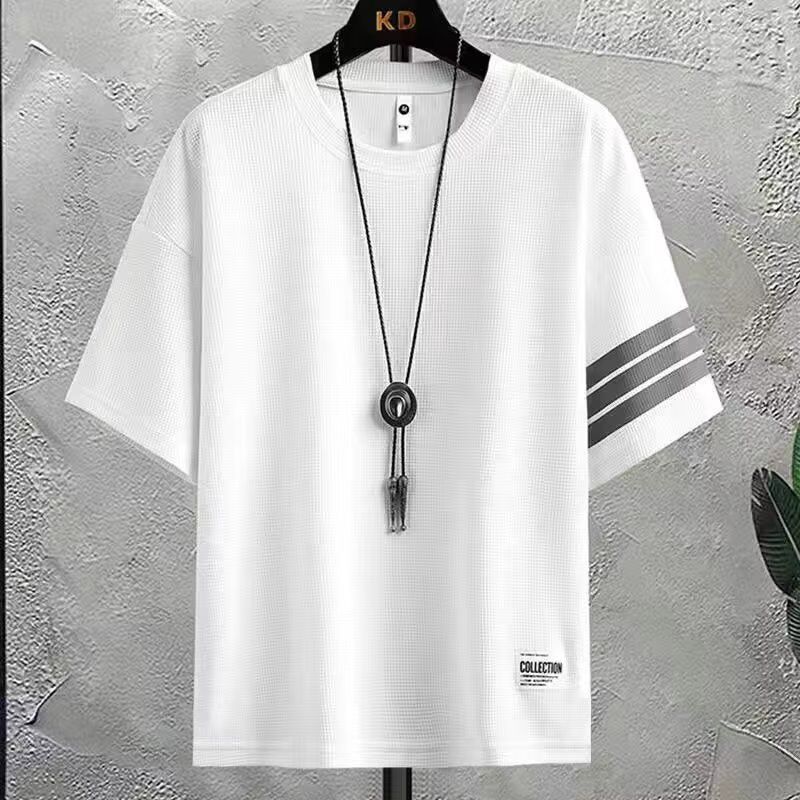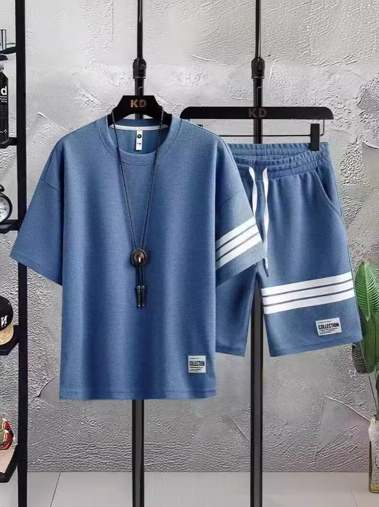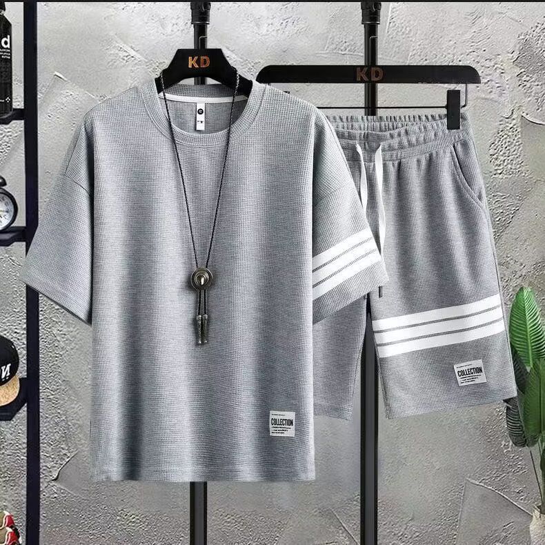 스포츠웨어 여름 얇은 와플 패턴 루즈핏 캐주얼 탑 티셔츠 세트 반바지 반팔 투피스 세트스토어 가기