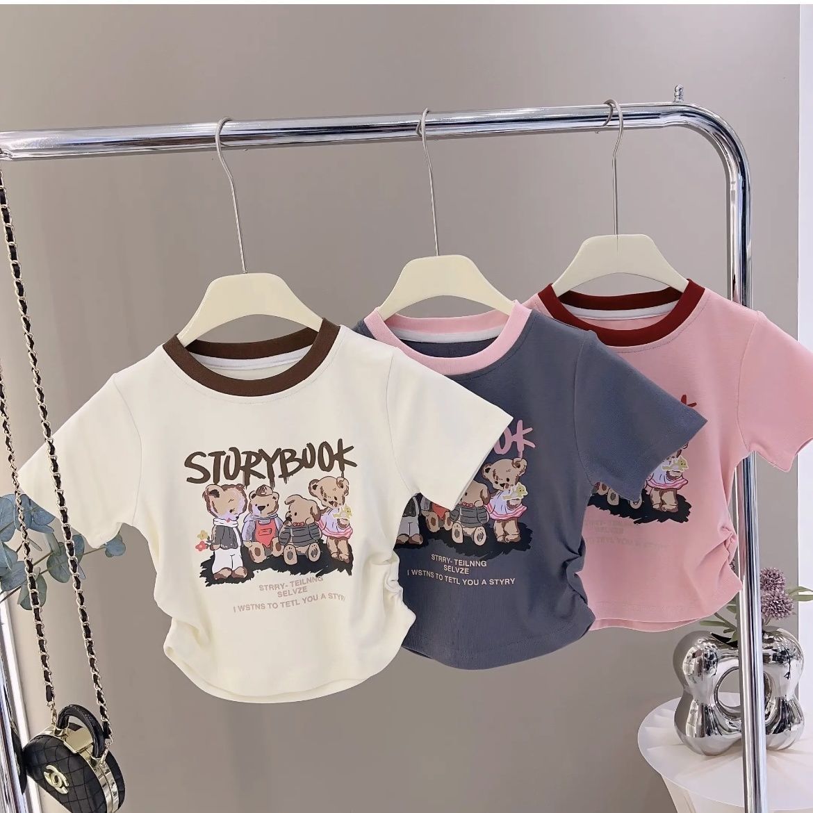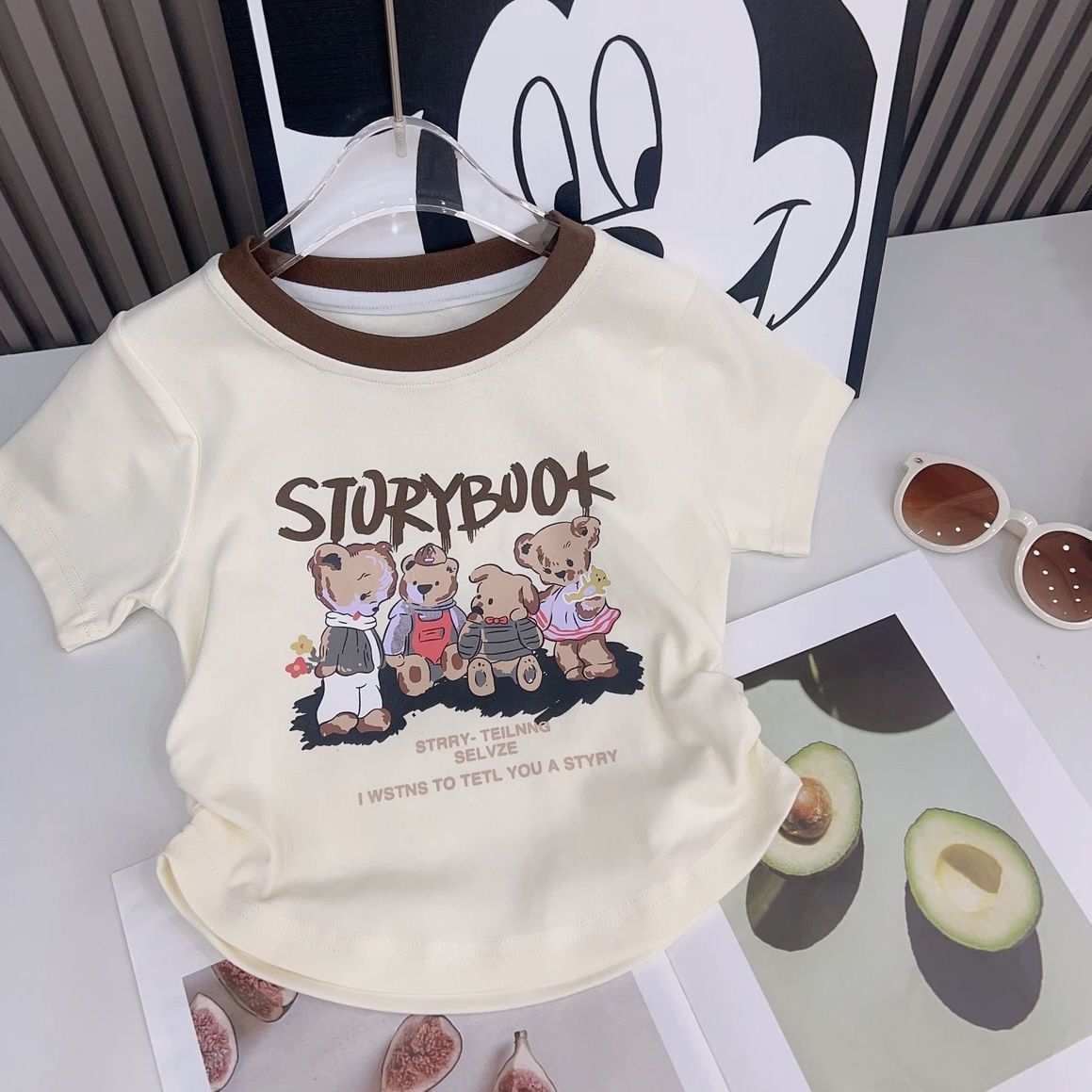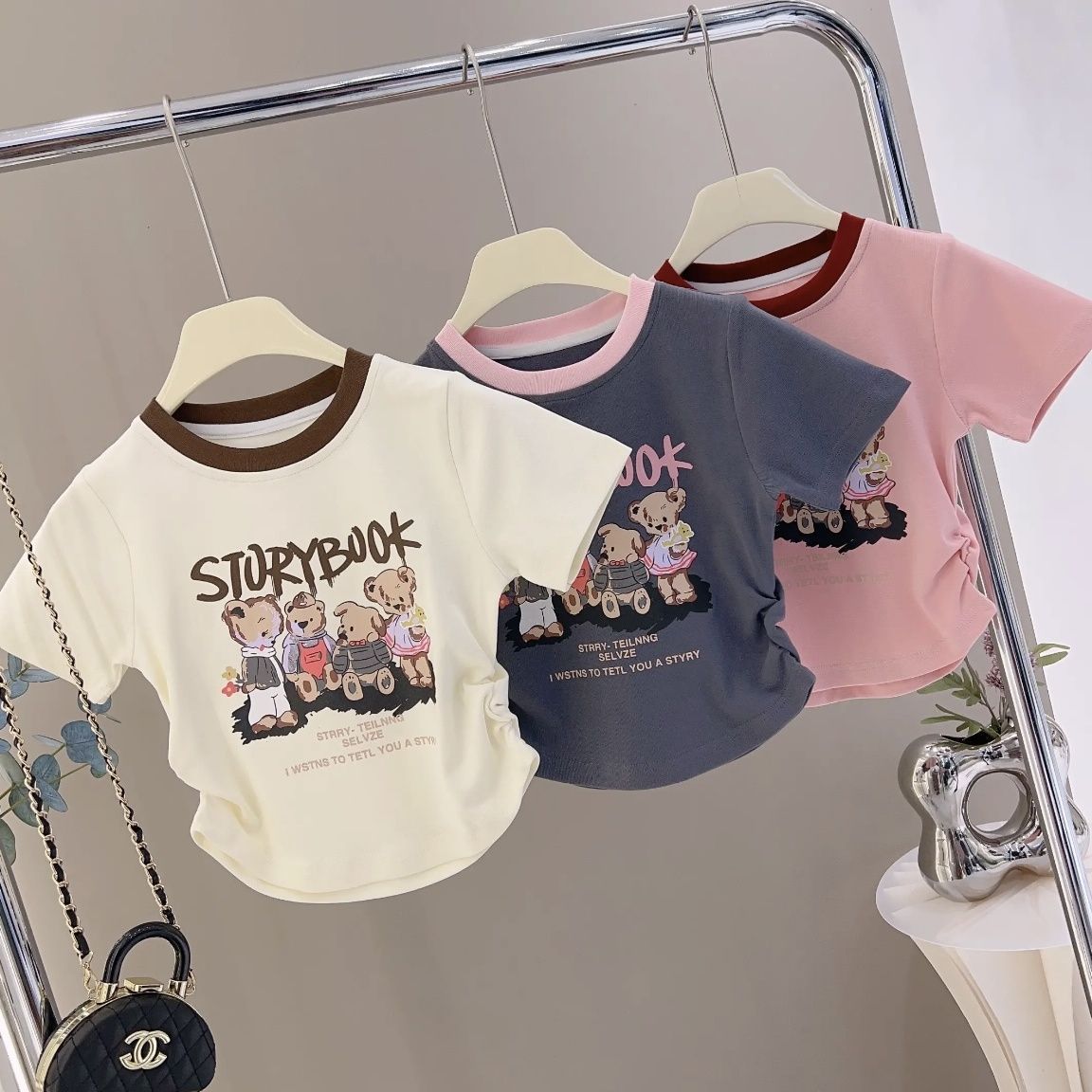 2024 소녀의 새로운 여름 한국 스타일 올 매치 유치한 스타일 4 곰 인쇄 Pleated 반팔 유행 사이버 인기 티셔츠스토어 가기