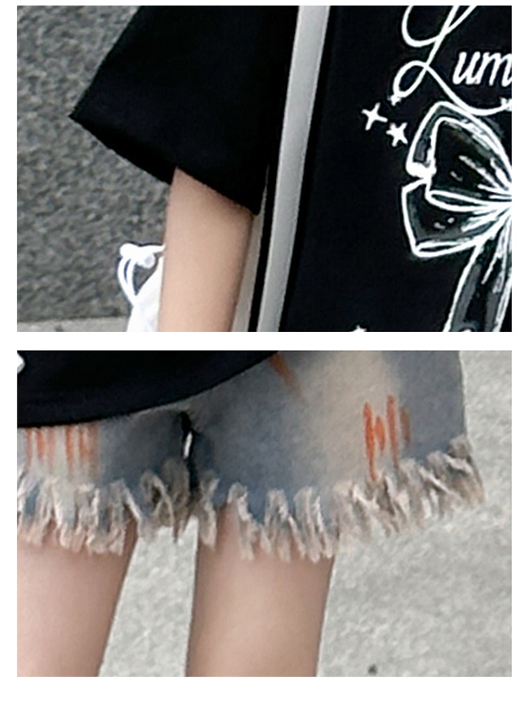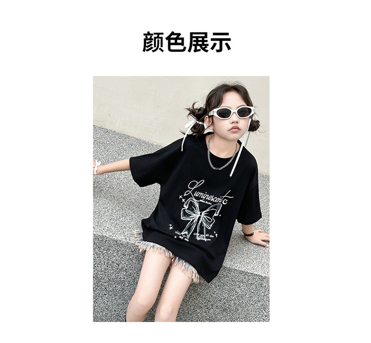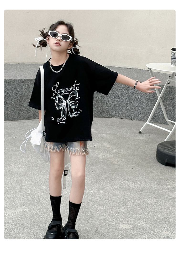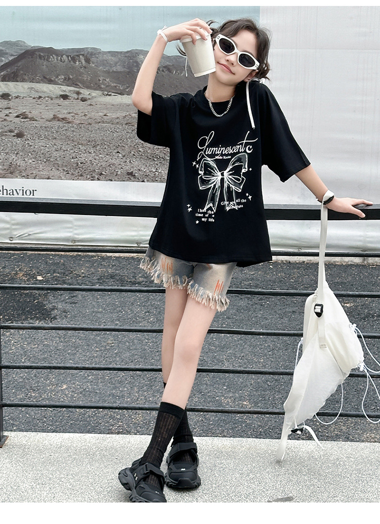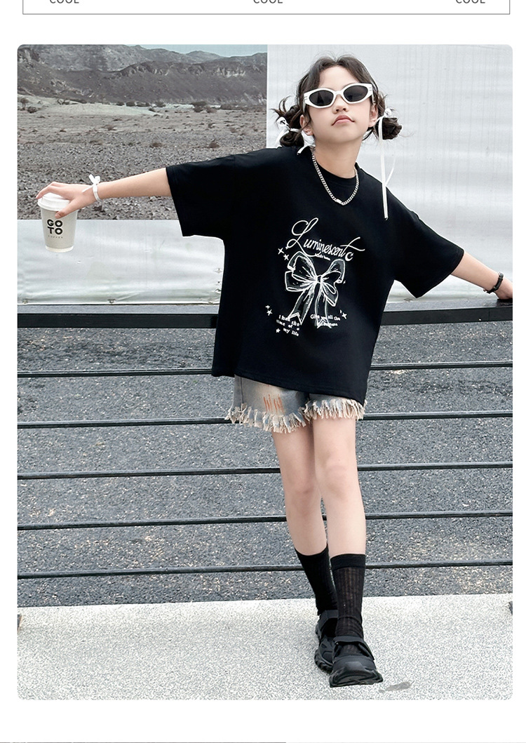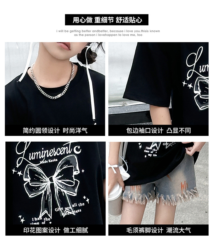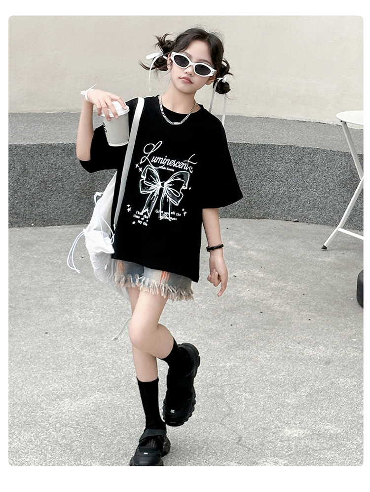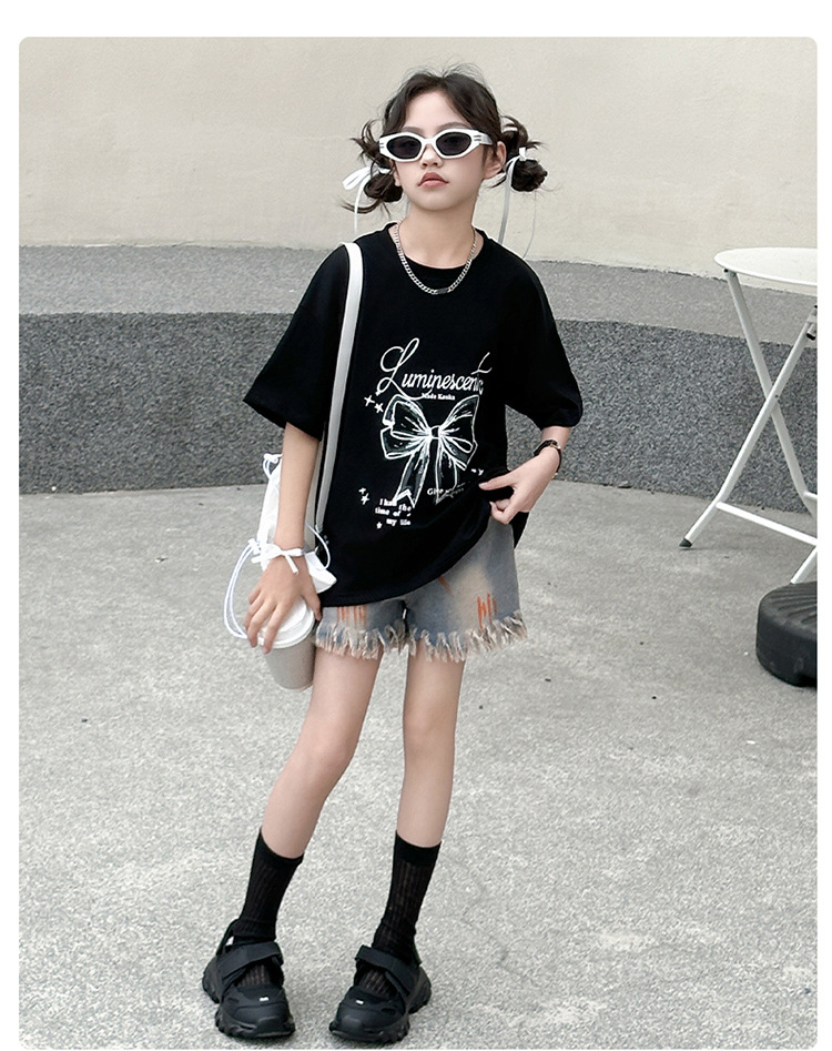 여아용 검정색 반팔 여름 2026 신상 여아 패션 티셔츠와 프린지 데님 반바지 투피스 여름 의상스토어 가기