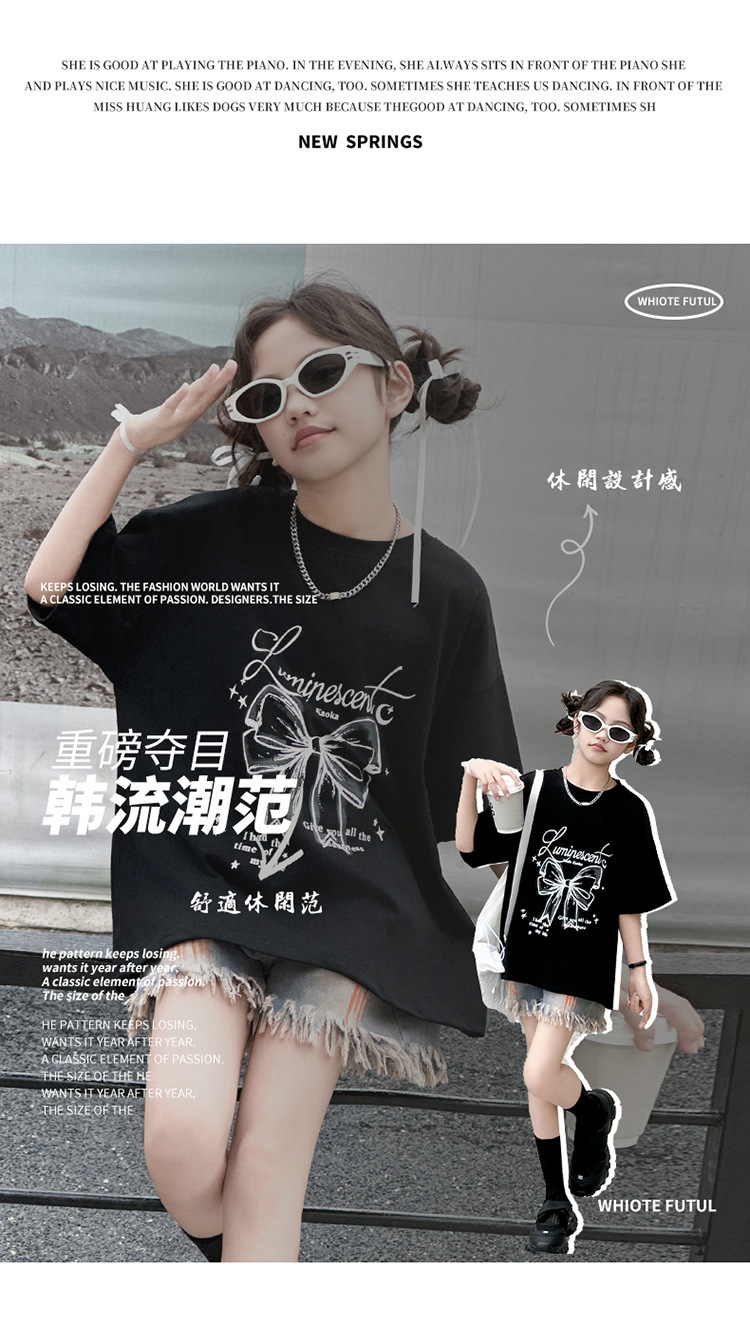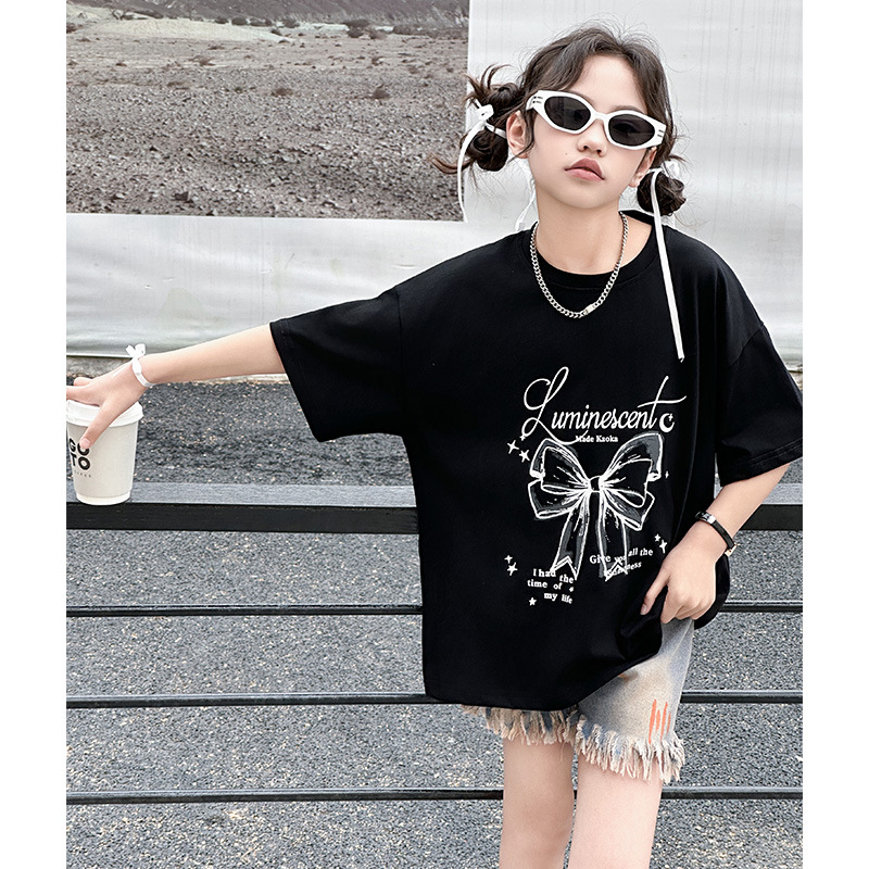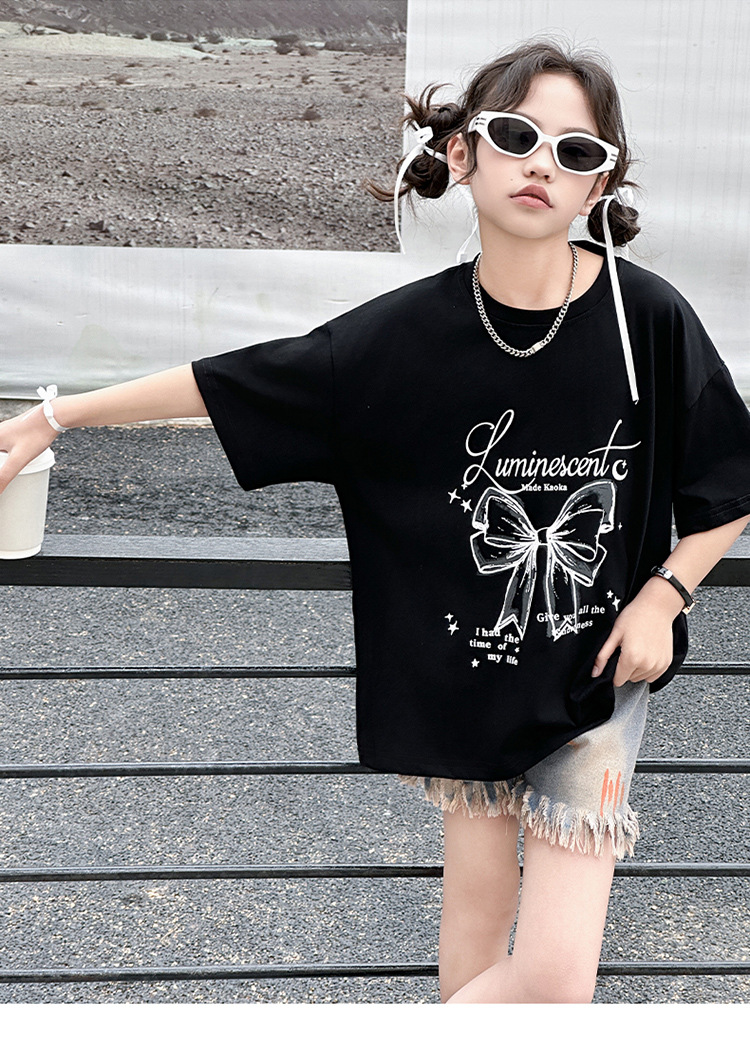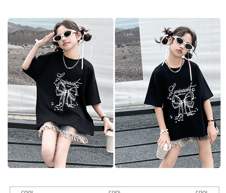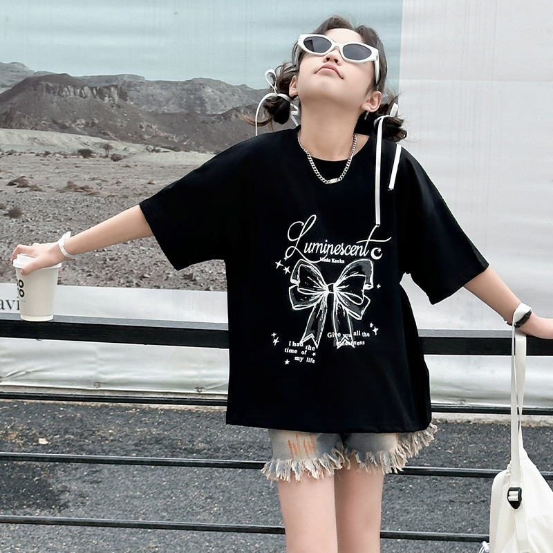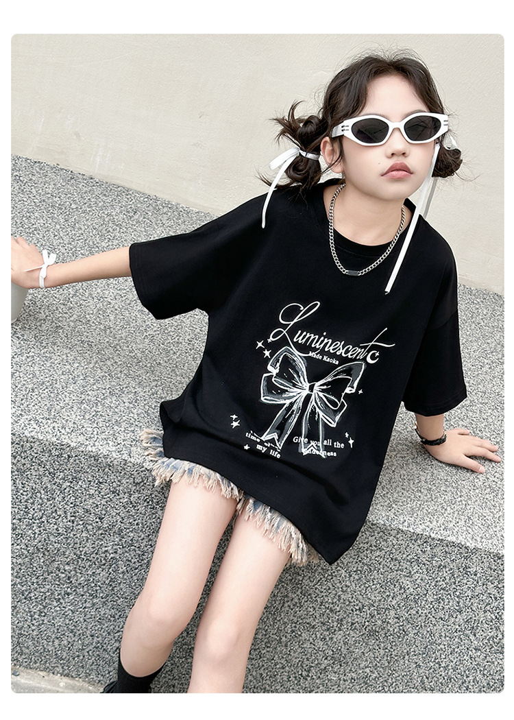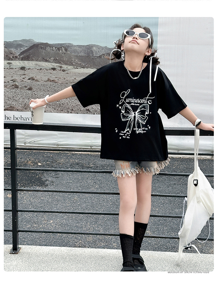 여아용 검정색 반팔 여름 2026 신상 여아 패션 티셔츠와 프린지 데님 반바지 투피스 여름 의상스토어 가기