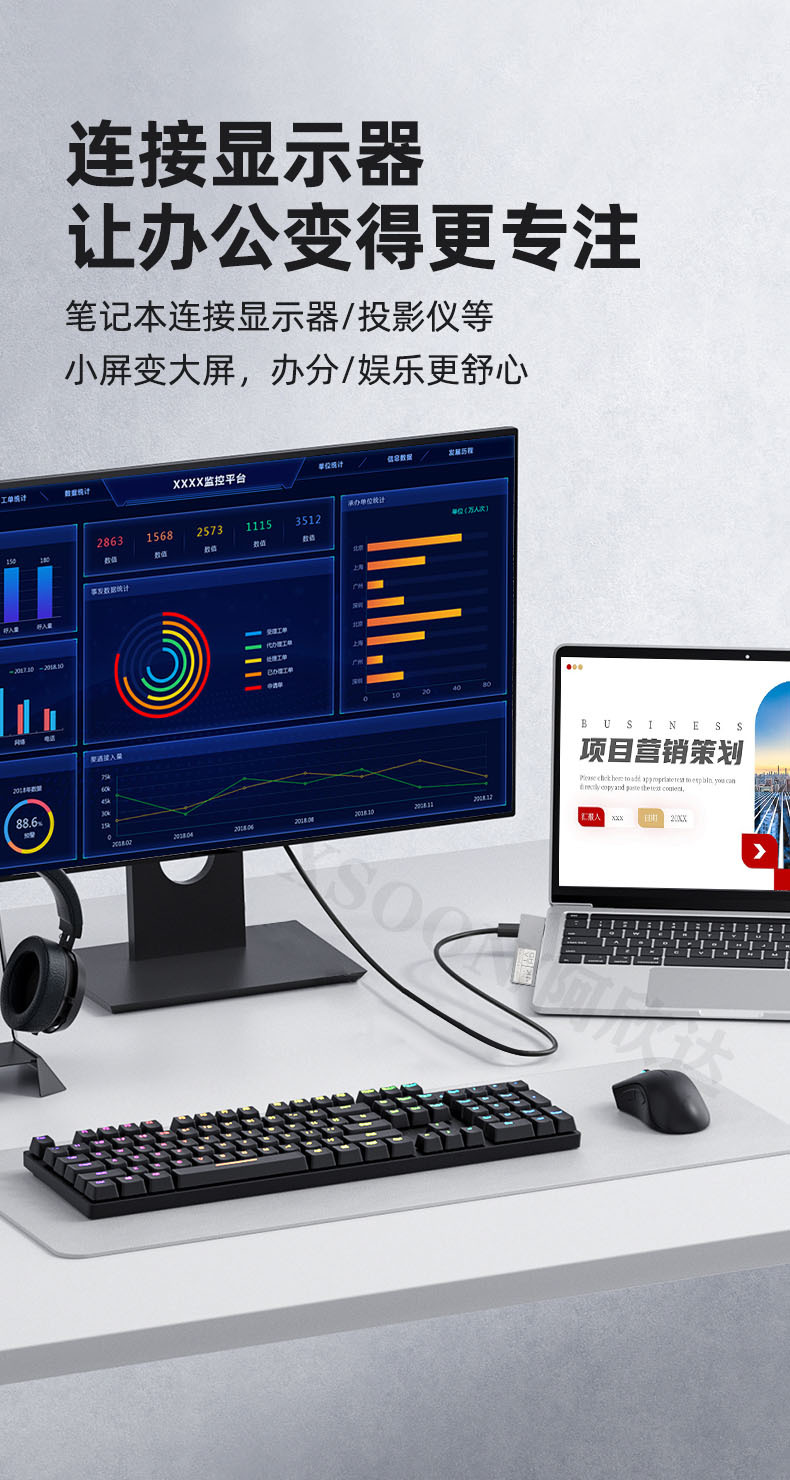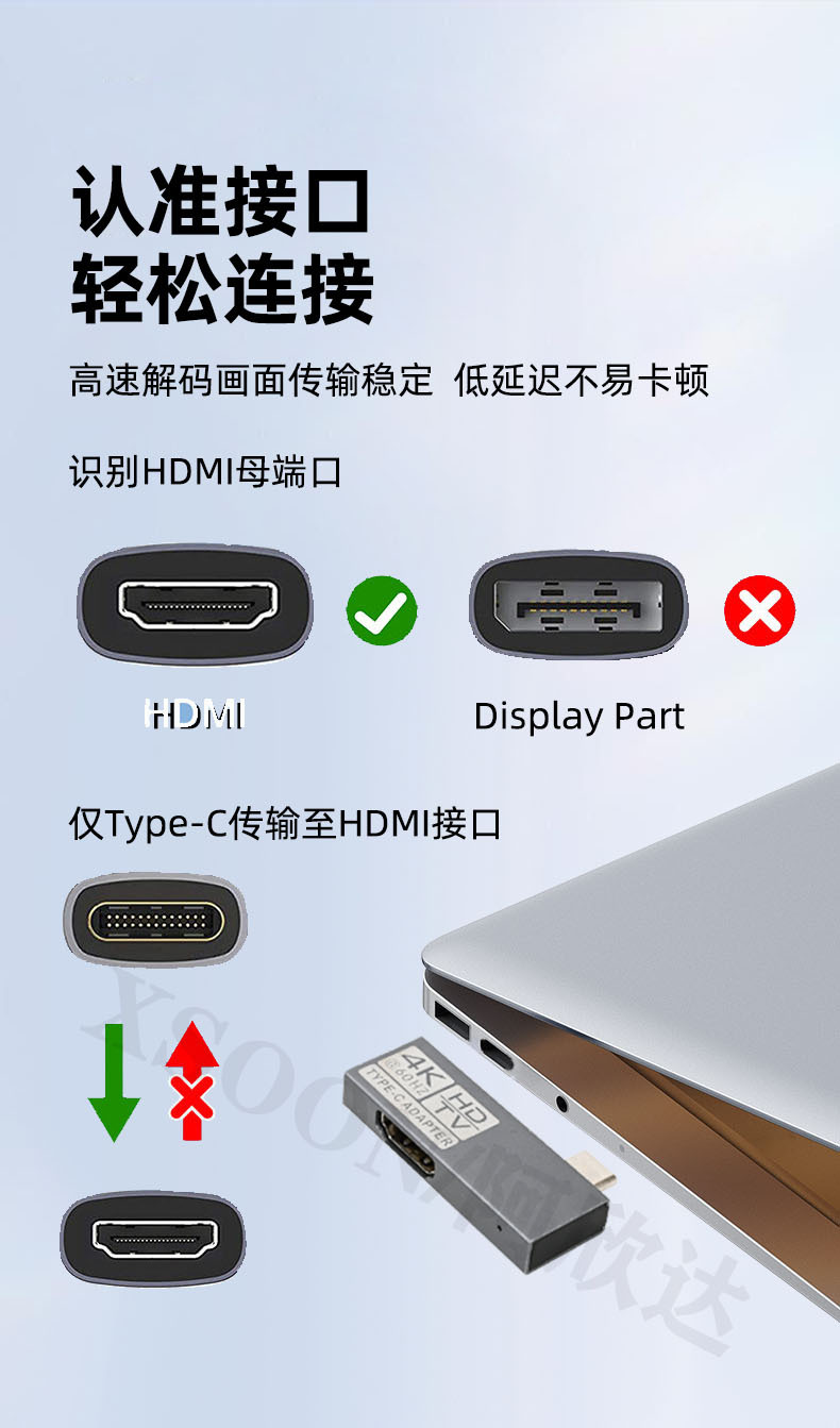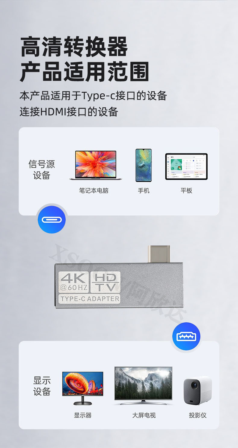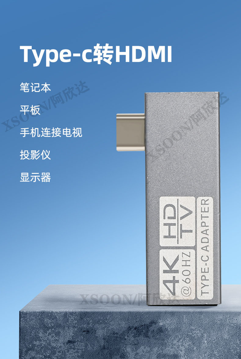 这款TYPE-C3.0转HDMI高清转换器,能让你将笔记本和台式机的USB接口连接到高清显示设备上。这样你可以在HDTV、投影仪、幻灯机等具有HDMI输入端口的大屏幕上观看全高清视频或幻灯片输出分辨率高达4K@30HZ和4K@60HZ。