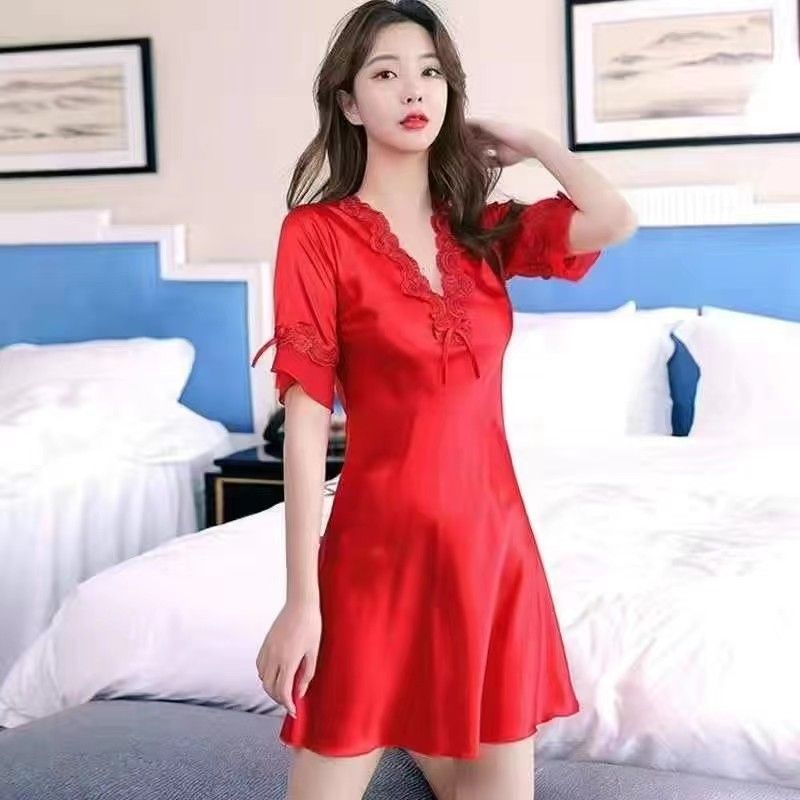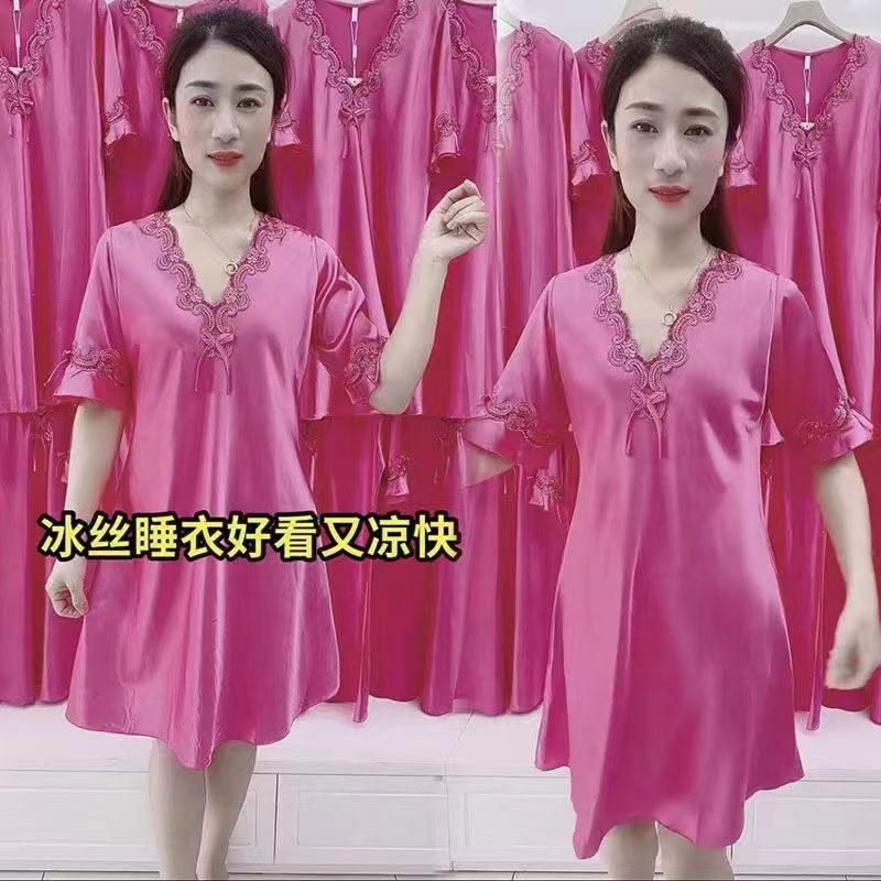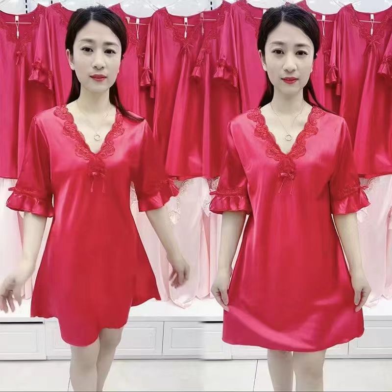 대형 V 넥 잠옷 여성 여름 얇은 아이스 실크 레이스 반팔 한국 스타일 섹시한 부드러운 느슨한 홈 옷스토어 가기