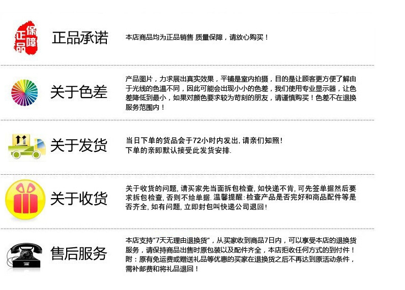 6、对收到货物以不满意,没想象中好为理由的退货请求,实际没有质量问题的产品要求退货,不予受理,请要下大批量的客户对产品如果不了解的,建议先订购些样品看下实样。(质量问题的界定为货品破损或残缺。)