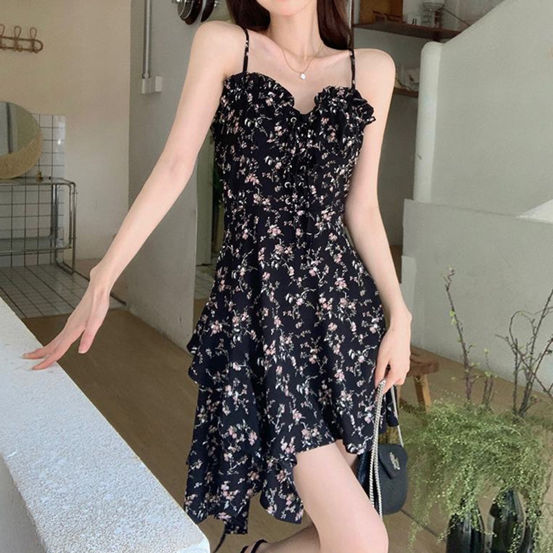 2026년 여름 신상품 여성용 흑색 플로럴 프린트 슬립 원피스, 퓨어&섹시 스타일, 허리를 잘록하게 잡아주는 슬림핏 숏 원피스스토어 가기