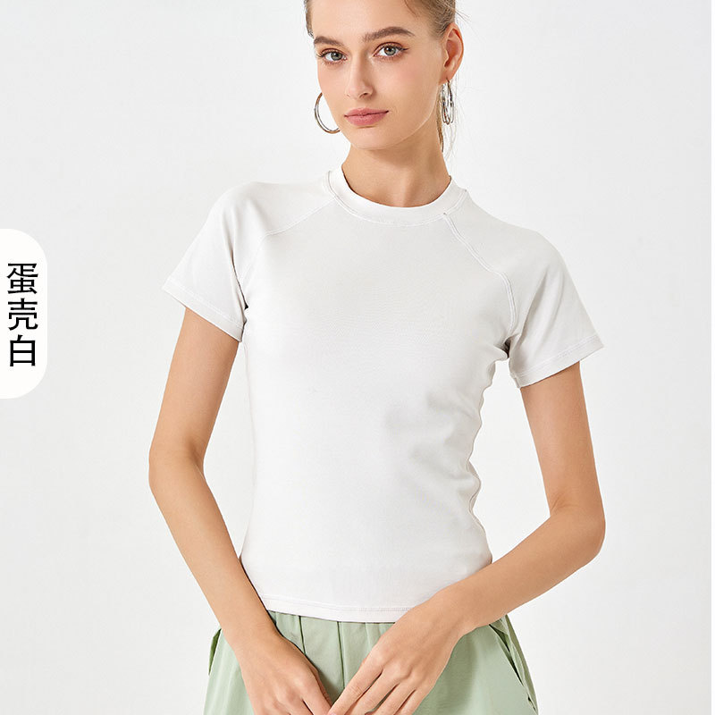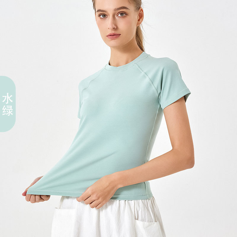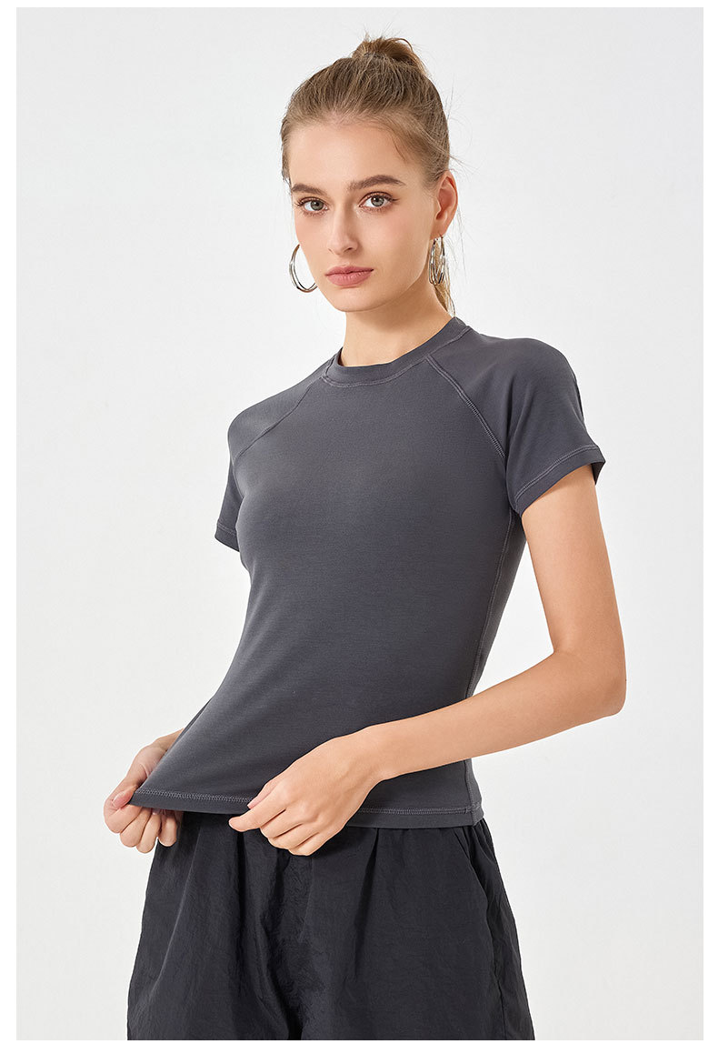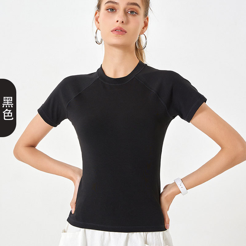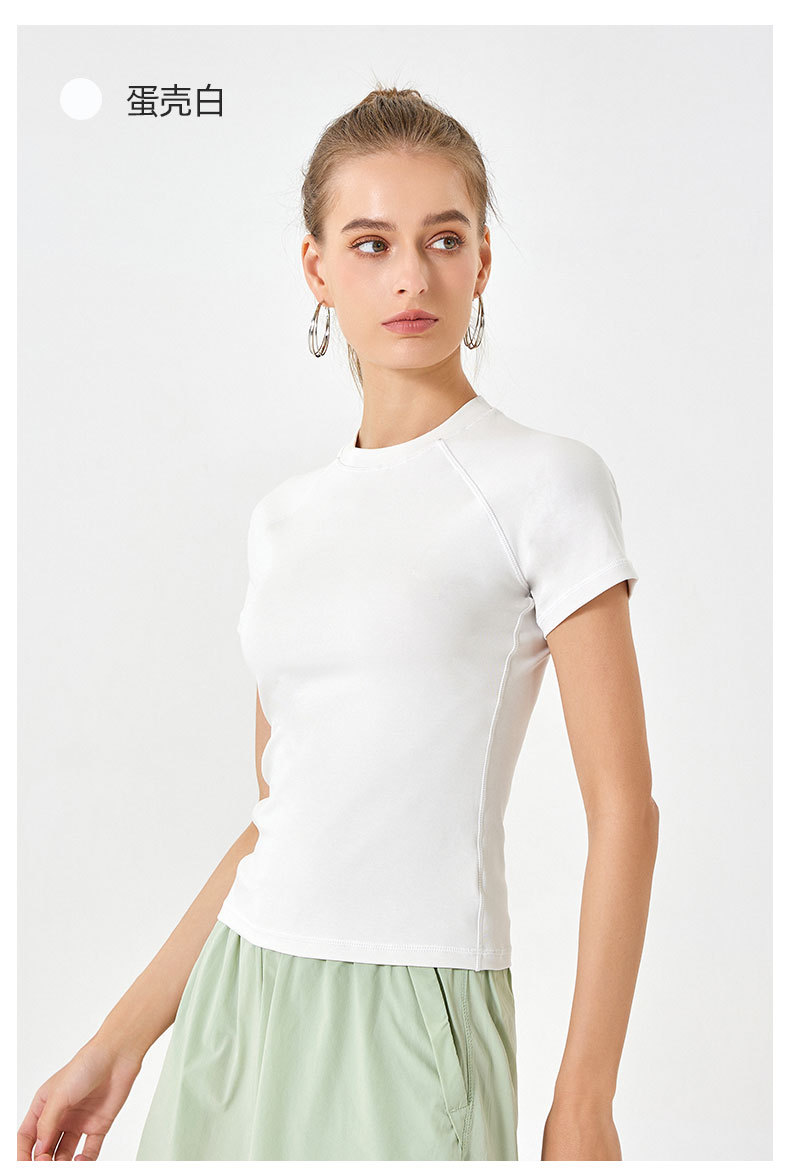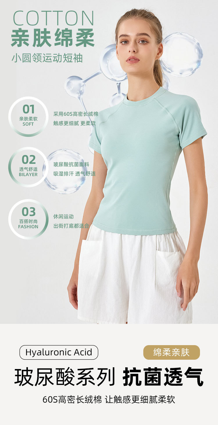 봄 여름 신상품 히알루론산 롱 스테이플 코튼 스포츠 반팔 여성용 라운드넥 슬리밍 타이트핏 통기성 고탄력 요가탑스토어 가기