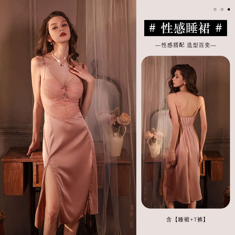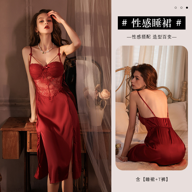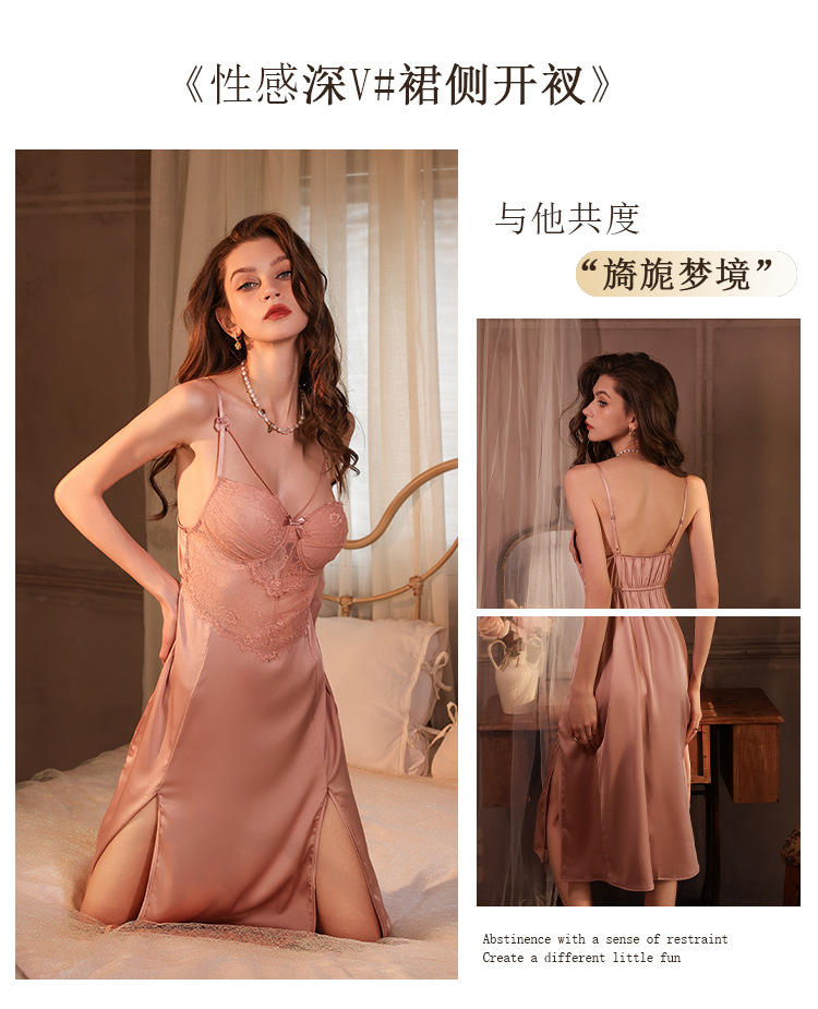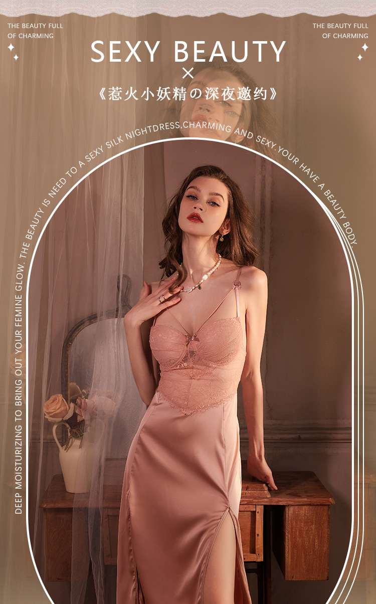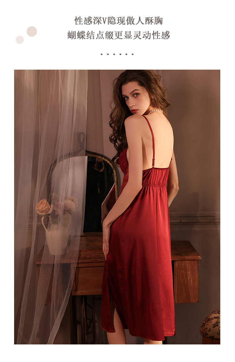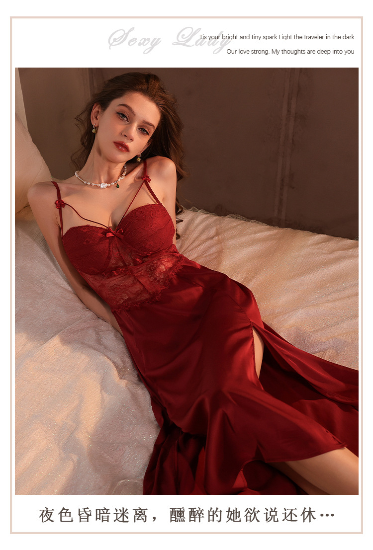 Yi Ying 섹시한 슬링 나이트 가운 긴 슬릿 레이스 딥 V 나이트 가운 프랑스 여성용 새틴 하이 엔드 센스 홈웨어스토어 가기