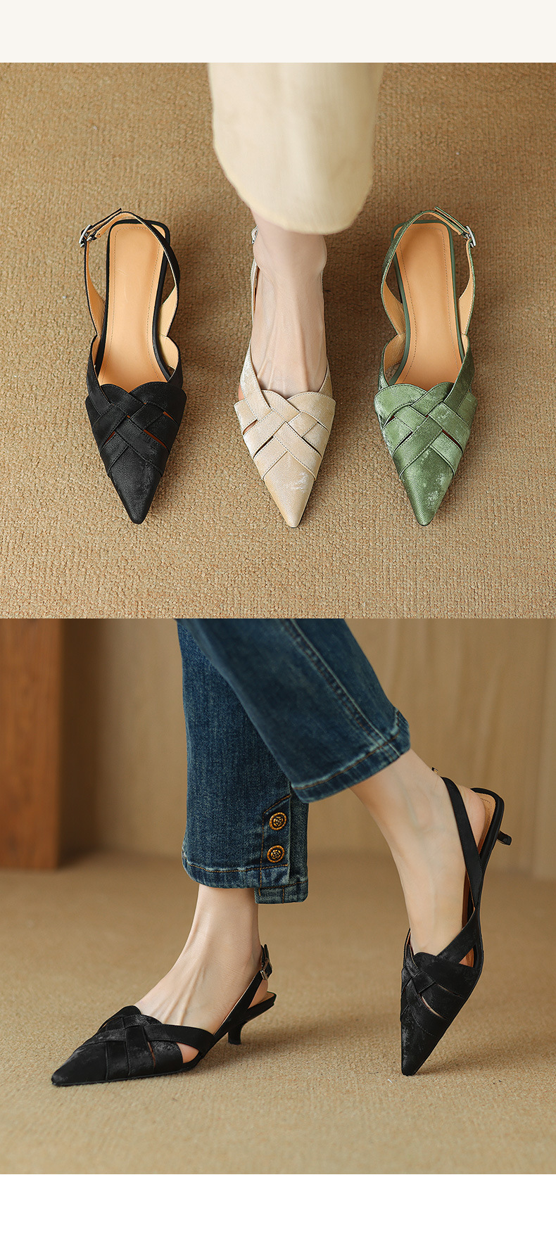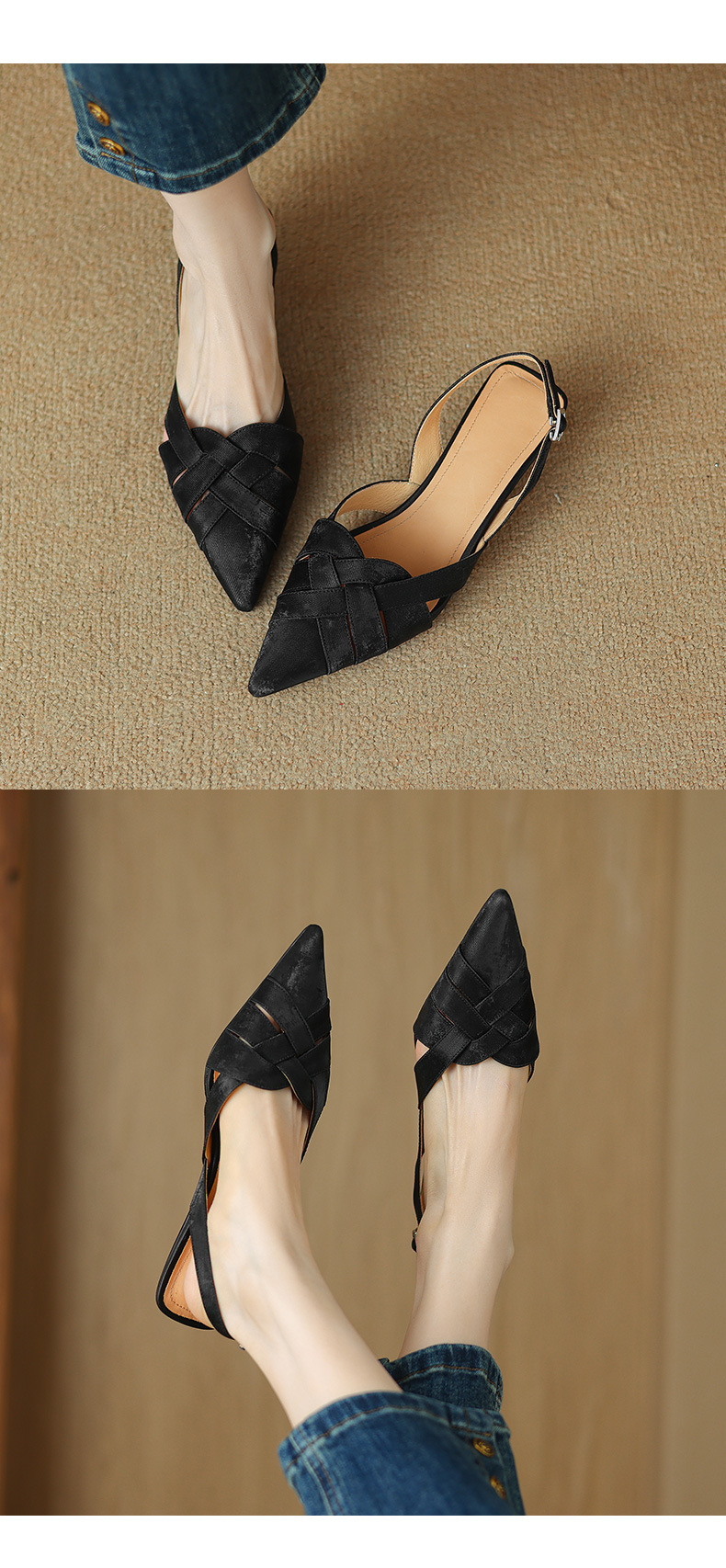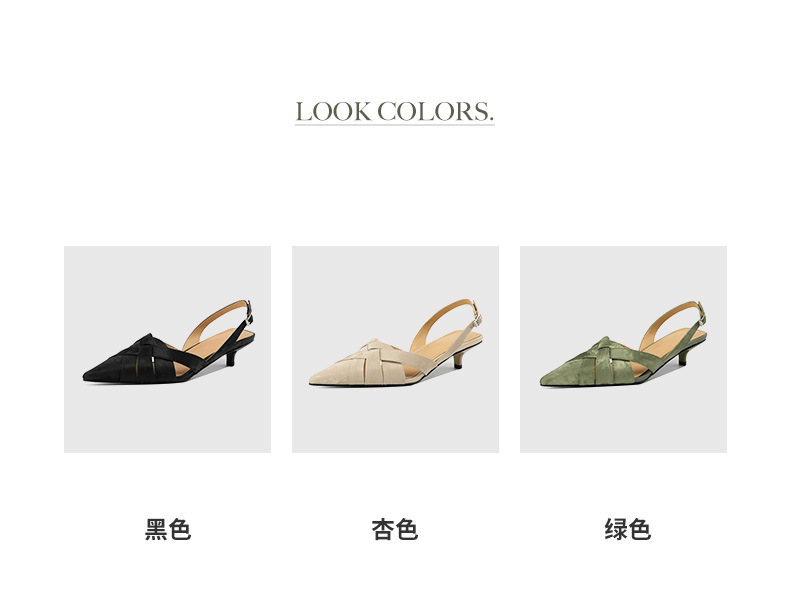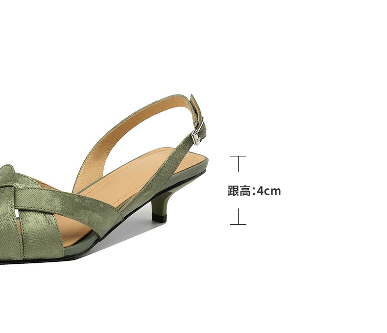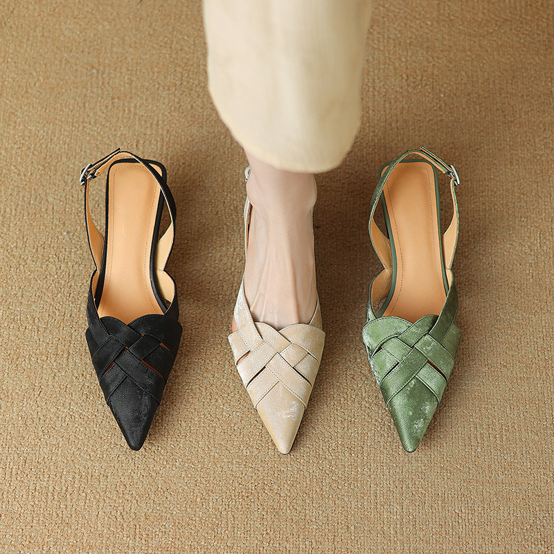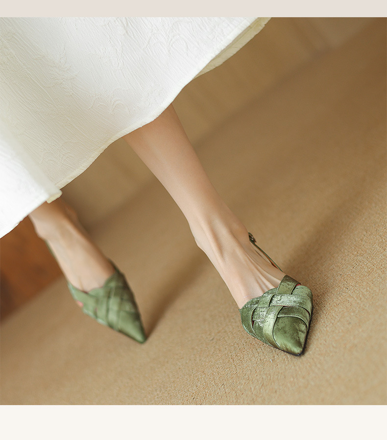 중공 Baotou 정품 가죽 로마 샌들 여성 여름 2024 새로운 미드 힐 스티치 포인팅 백 할로우 새로운 중국 여성 신발