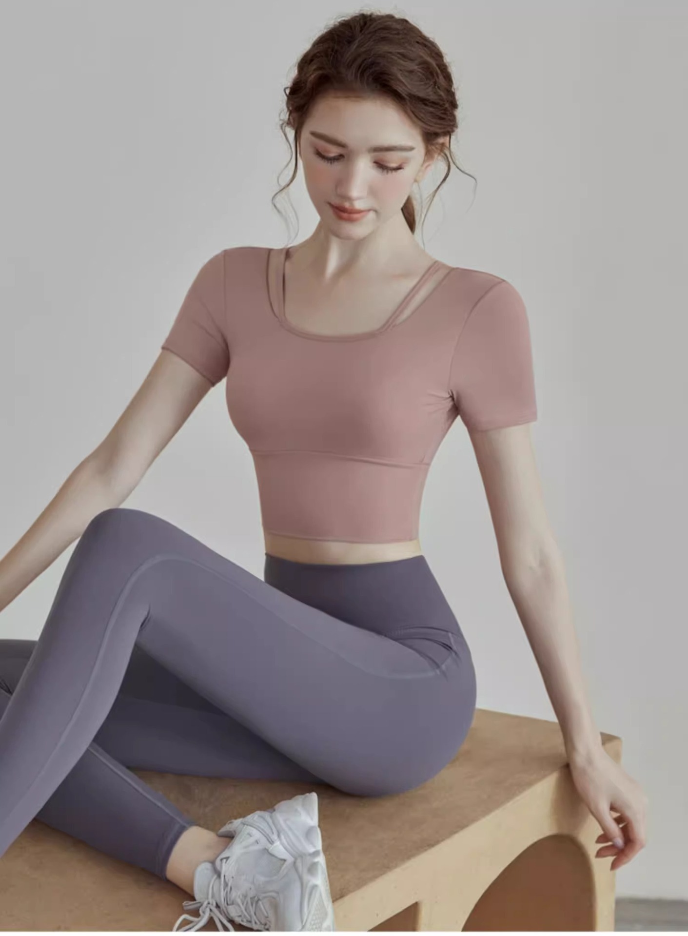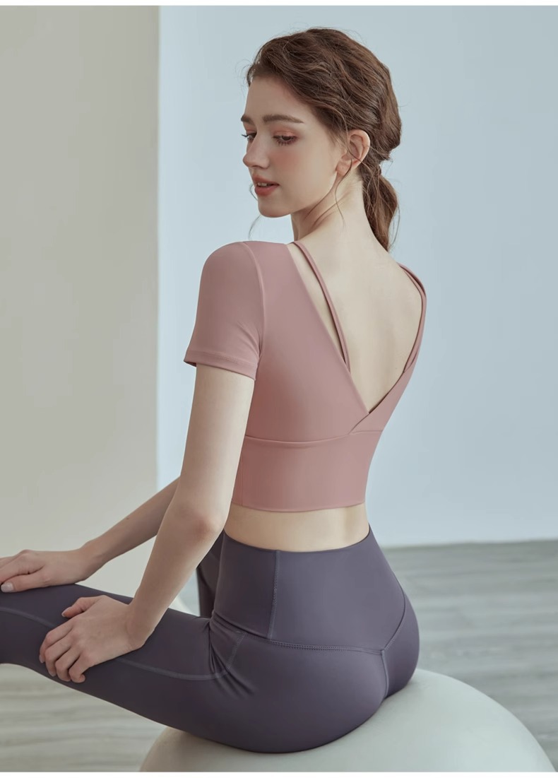 요가 의류 소녀의 봄과 여름 통기성 스포츠 반팔 탑 꽉 끼는 슬리밍 얇은 피트니스 의류 필라테스 훈련 의류