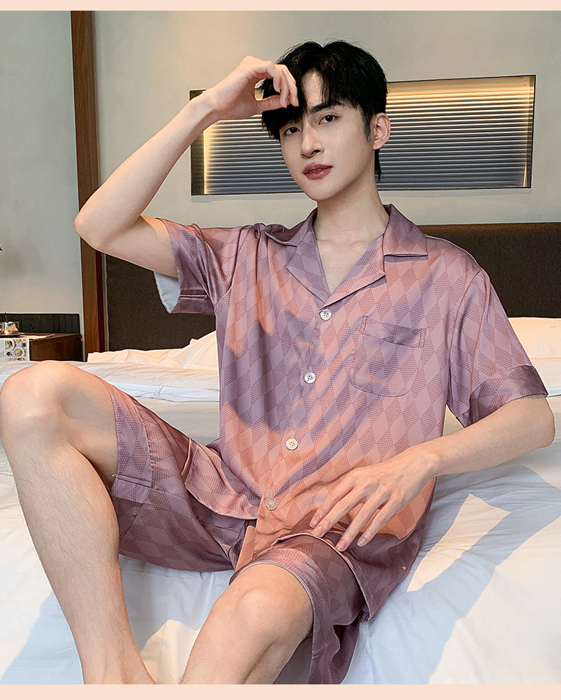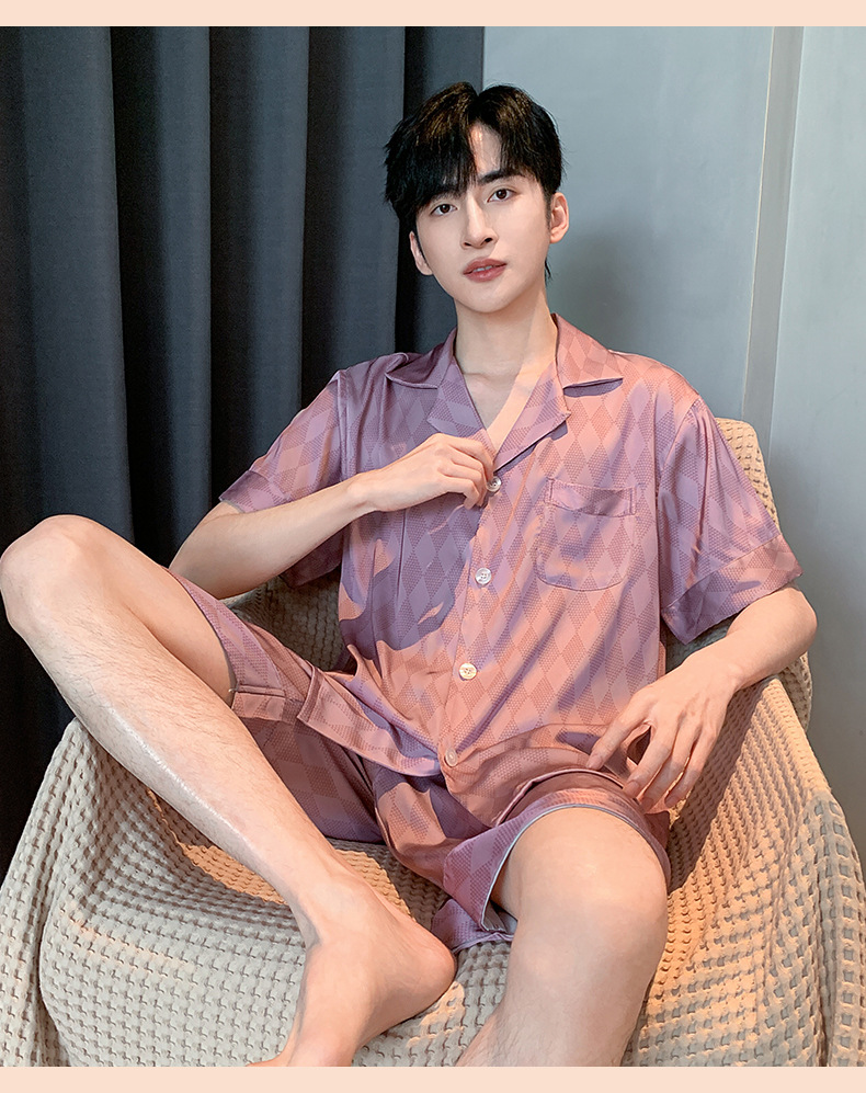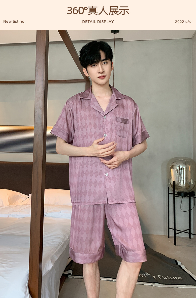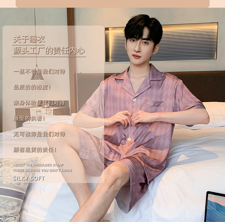 2024 새로운 옷깃 트렌디 한 남성용 아이스 실크 잠옷 부드러운 빛 짧은 소매 반바지 하이 엔드 감각 큰 사이즈는 도매로 나갈 수 있습니다