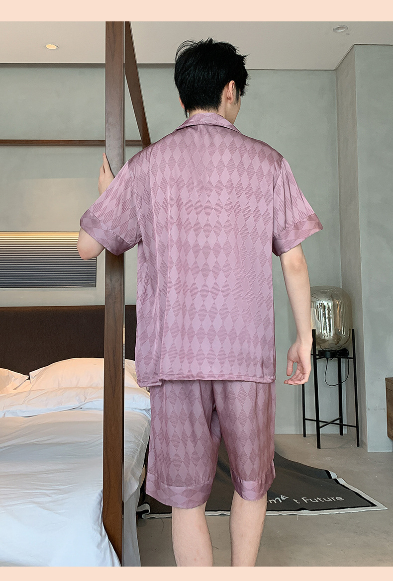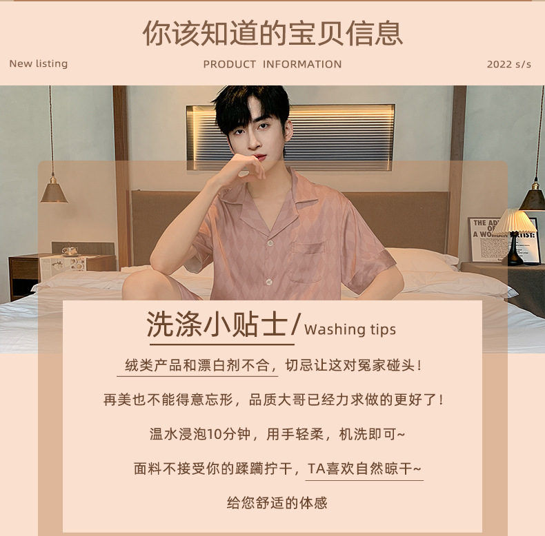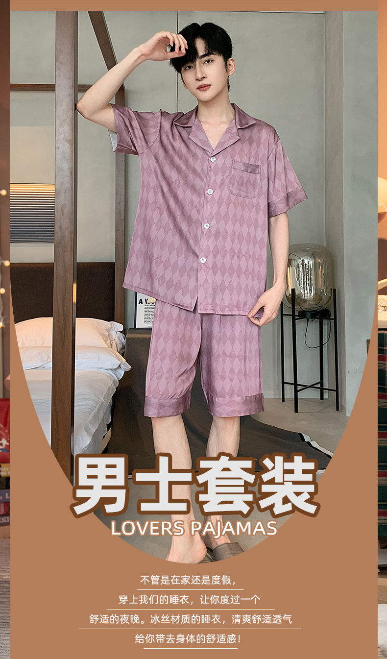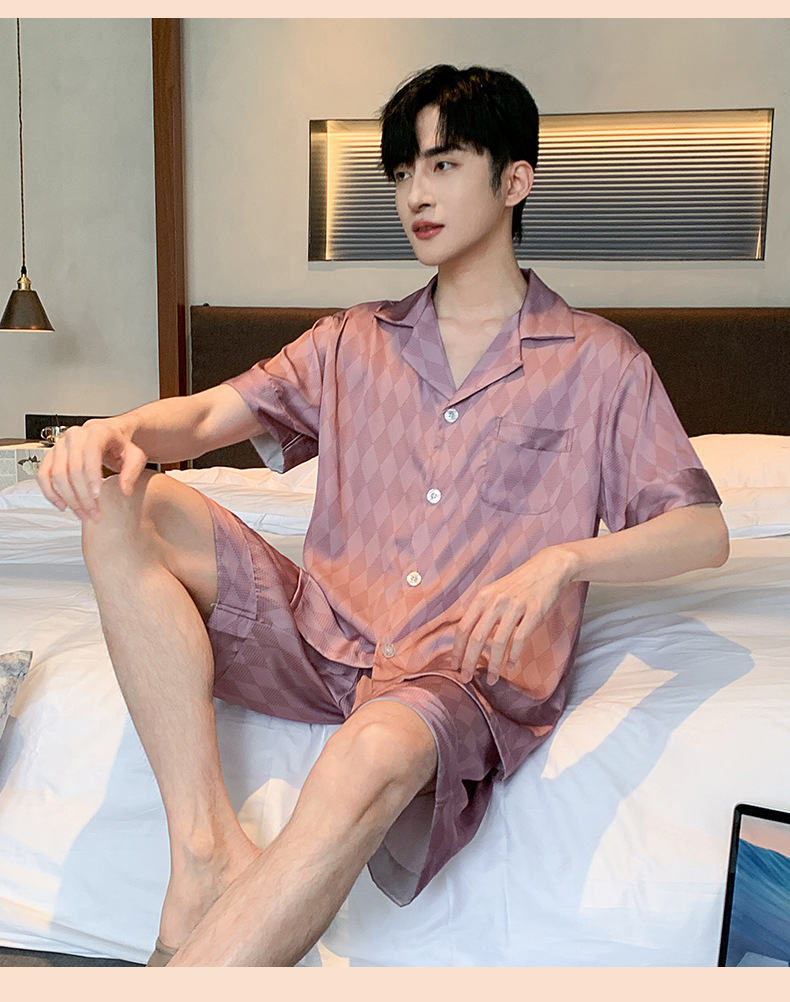 2024 새로운 옷깃 트렌디 한 남성용 아이스 실크 잠옷 부드러운 빛 짧은 소매 반바지 하이 엔드 감각 큰 사이즈는 도매로 나갈 수 있습니다