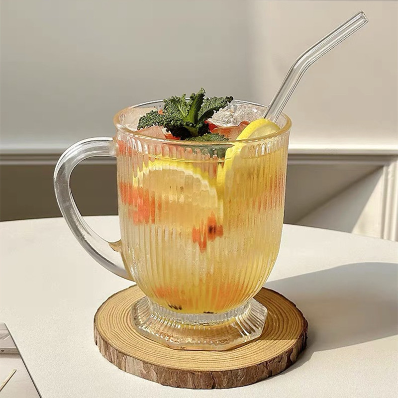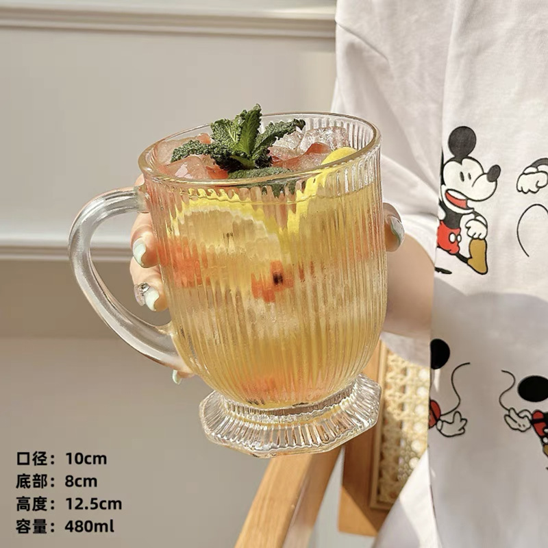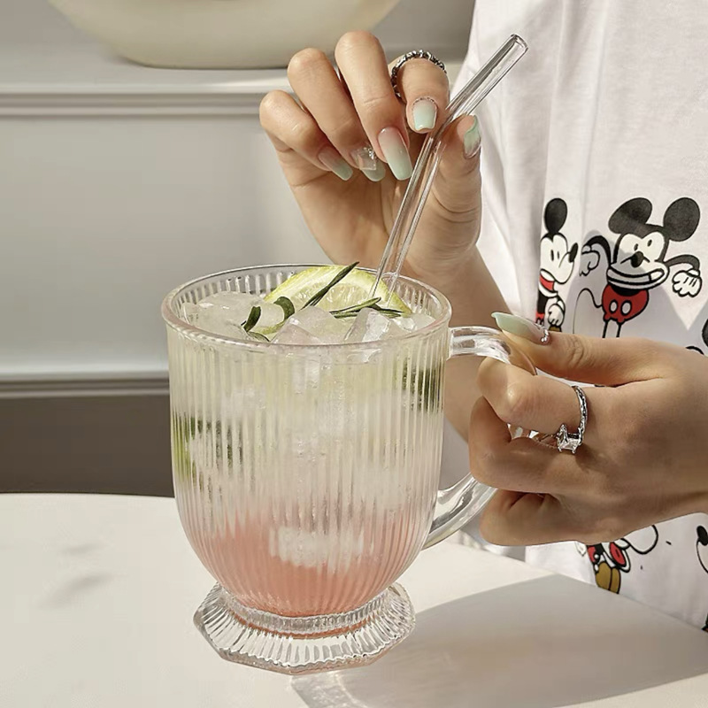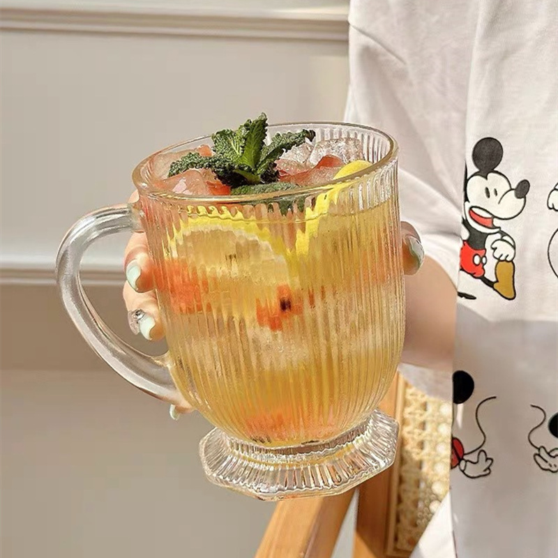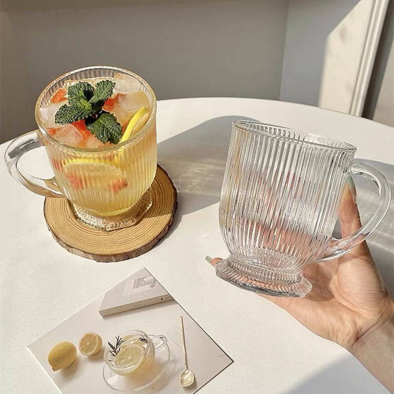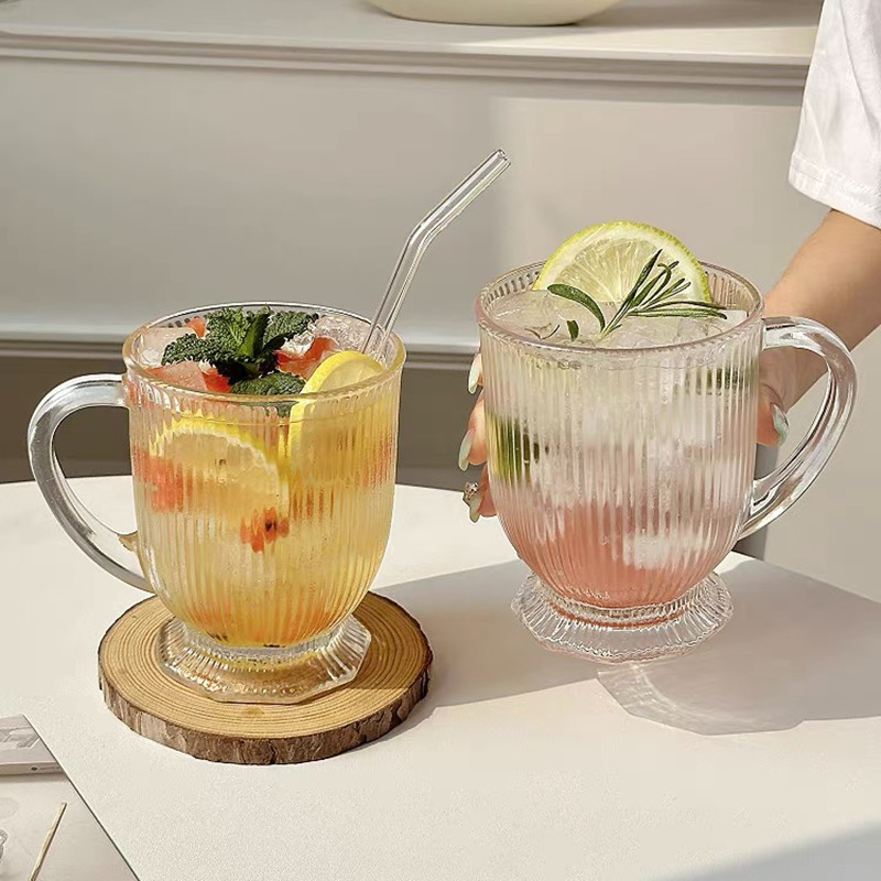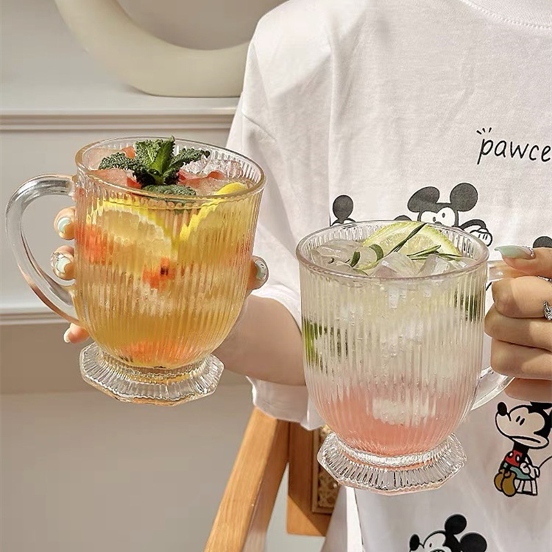 Ins 스타일 간단한 줄무늬 머그잔 유리 높은 색상 가치 큰 용량 주스 컵 핸들 음료 우유 컵