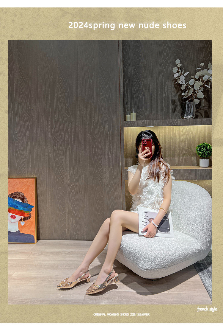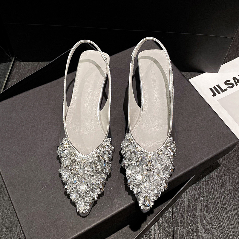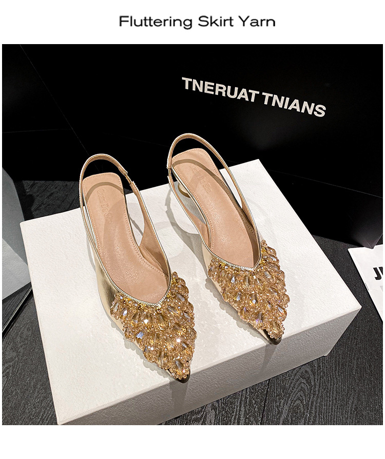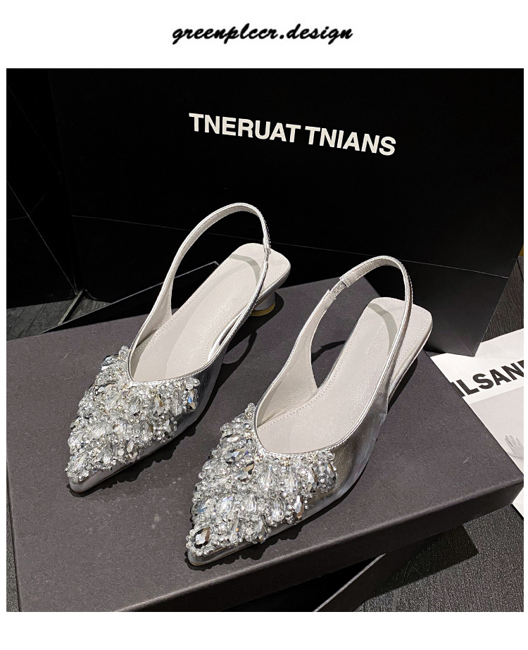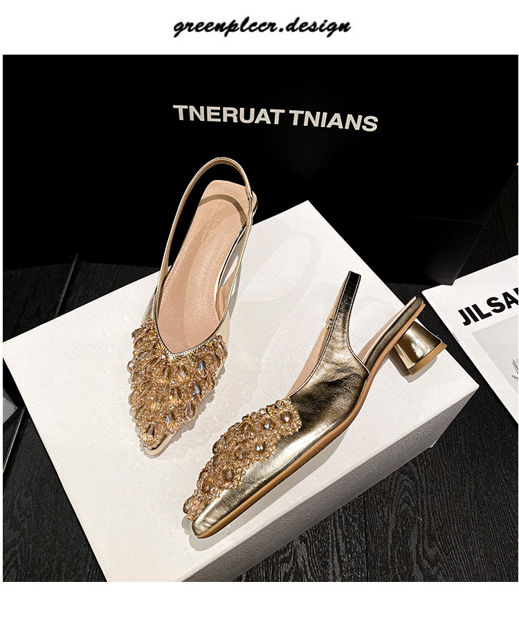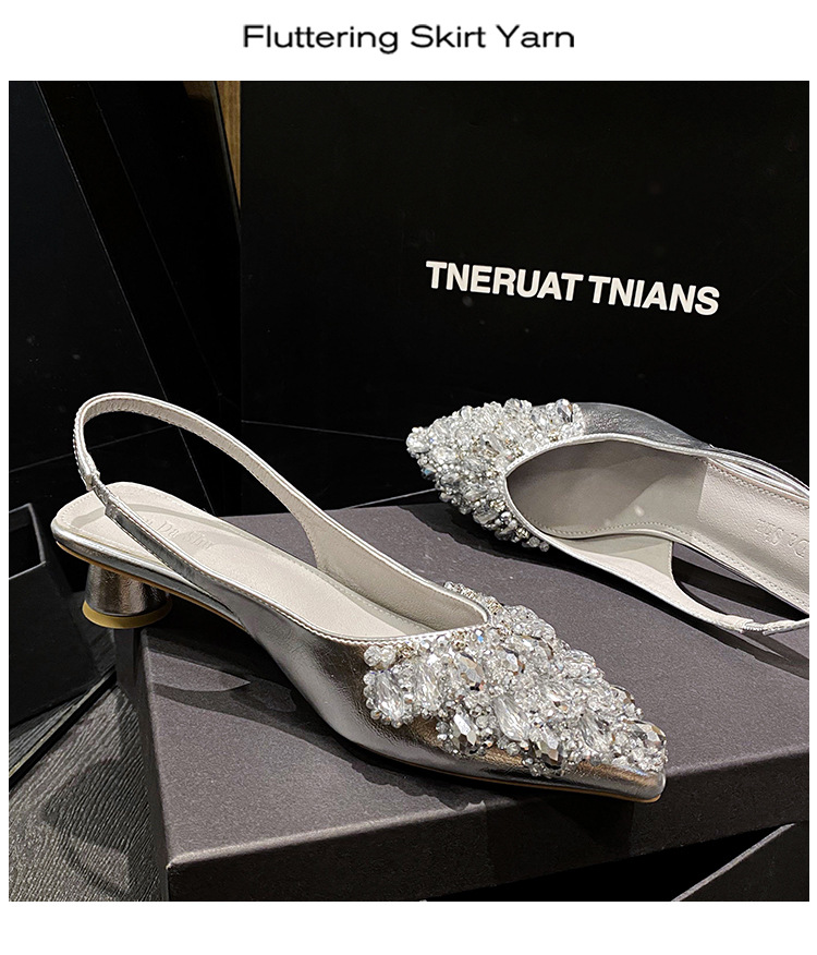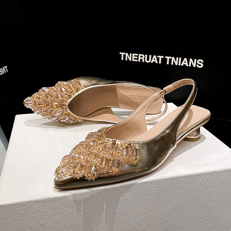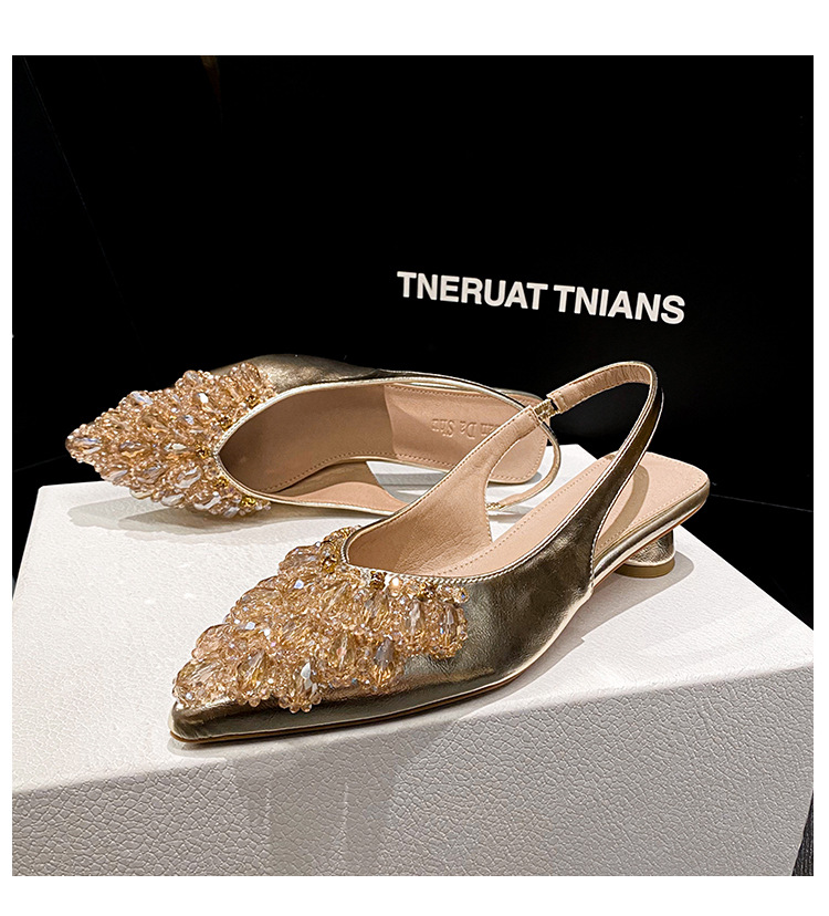 여성용 프렌치 스타일 두꺼운 굽 미드힐 토캡 샌들, 2025 신상 모델, 라인스톤 포인티드 토 싱글 슈즈, 여성용 대형 사이즈 41-43