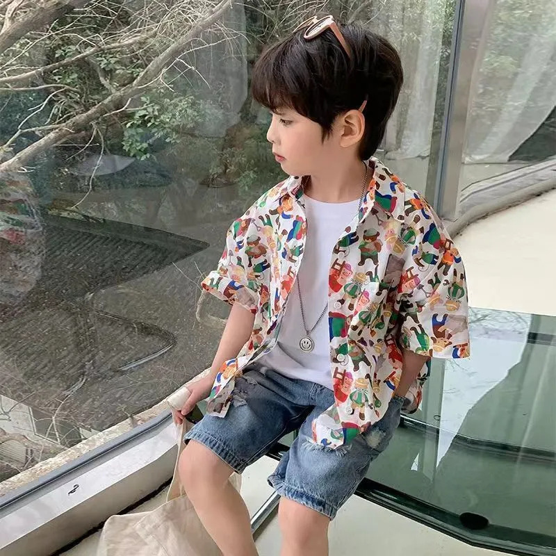 한국 스타일 어린이 캐주얼 짧은 소매 셔츠 소년과 소녀 만화 다채로운 작은 사람들이 매일 학교 셔츠 자켓 인쇄