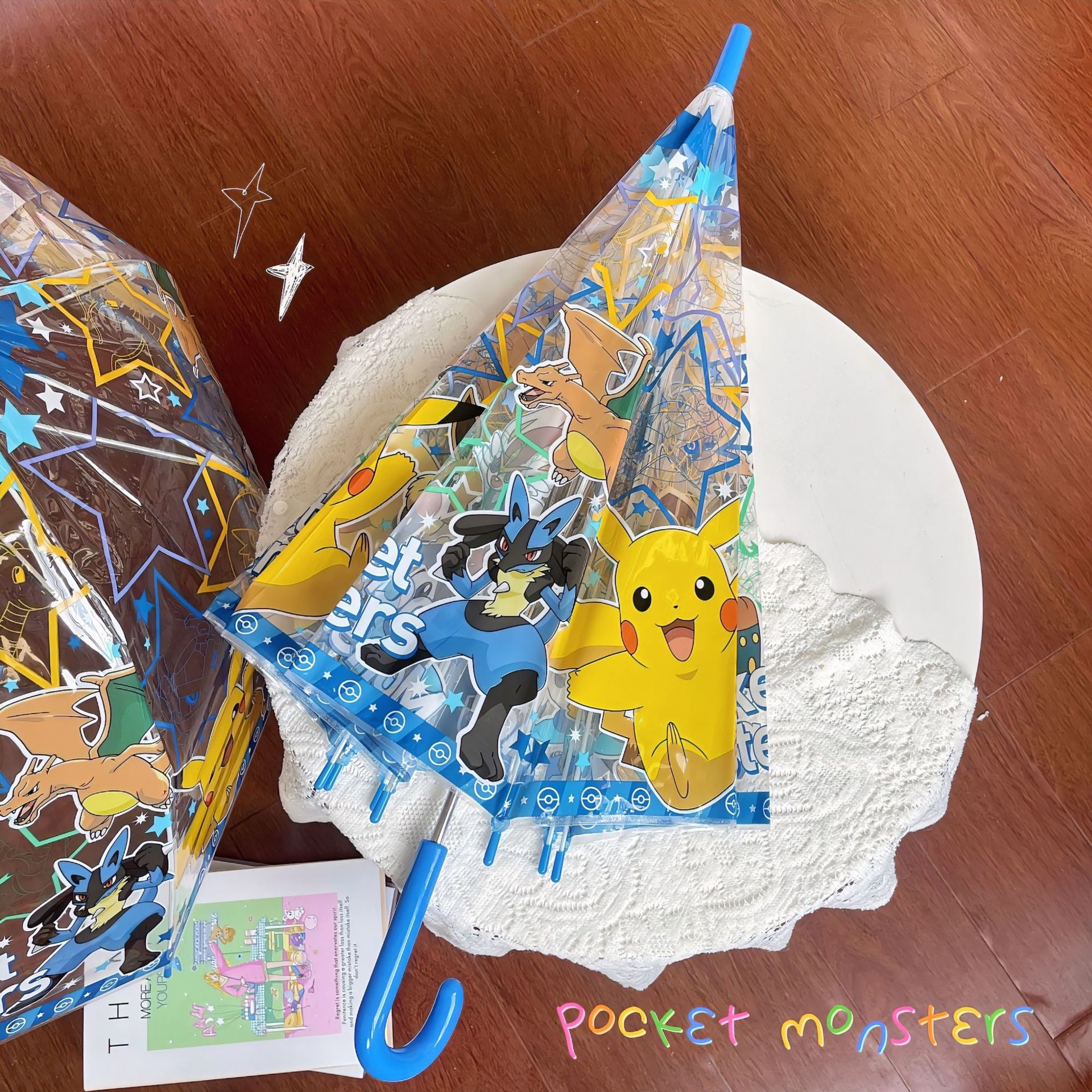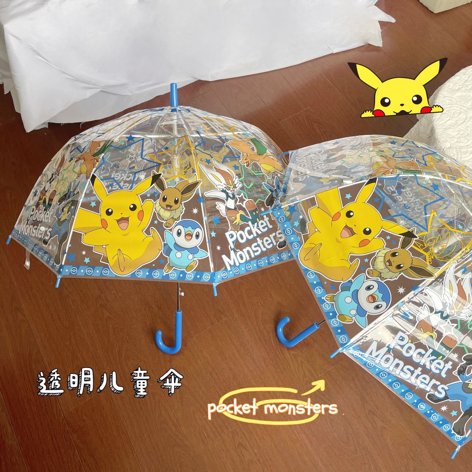 피카츄 완전 자동 투명 우산 접히는 여신 신선한 만화 학생 긴 손잡이 접히는 우산 두 배 두꺼운 우산