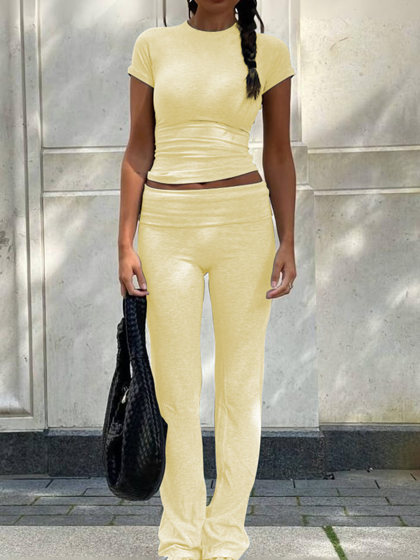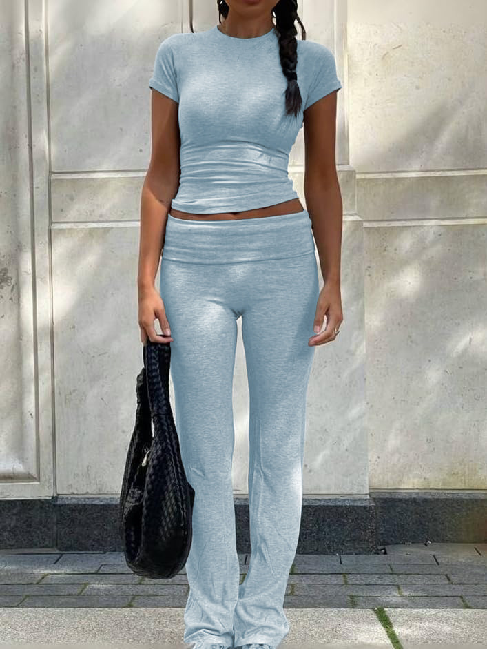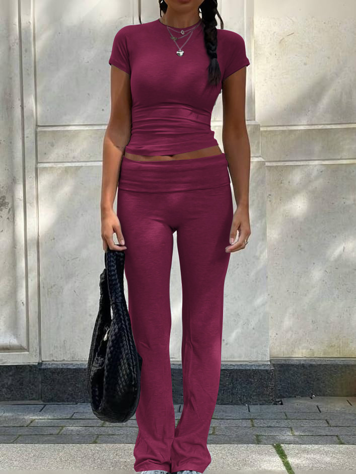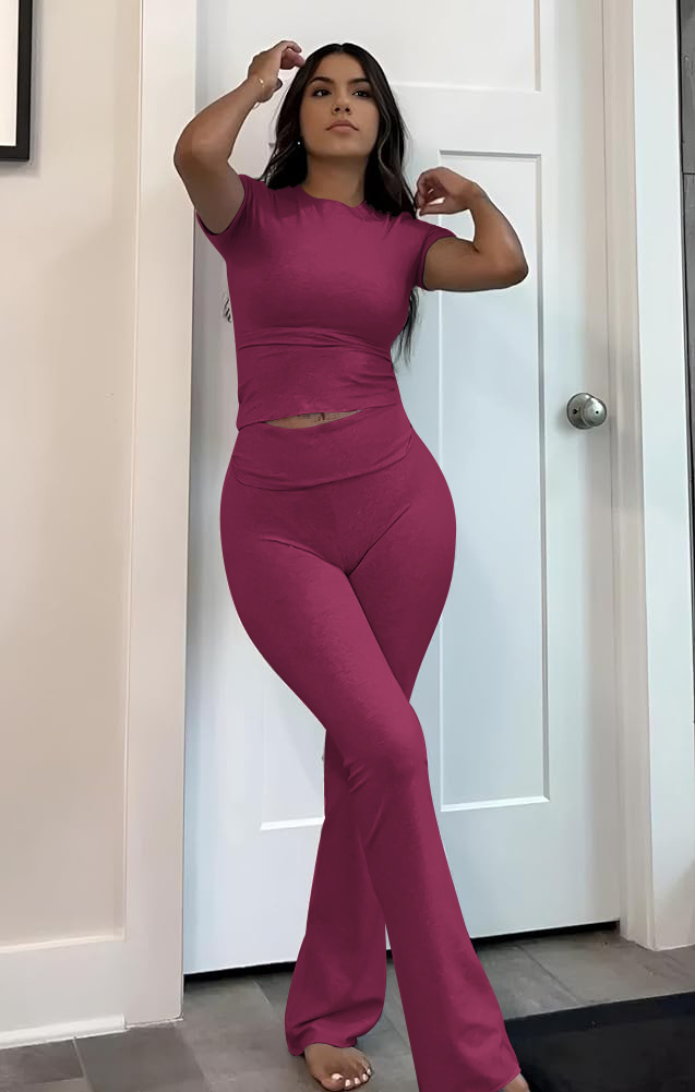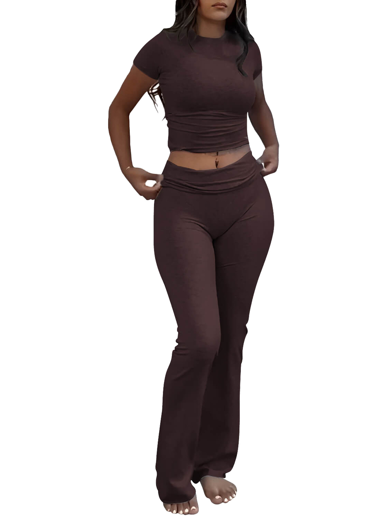 유럽과 미국 국경 간 핫셀러 레저 운동 여성 투피스 크루 넥 티셔츠 로우 웨이스트 플레어 팬츠 스포츠웨어 세트