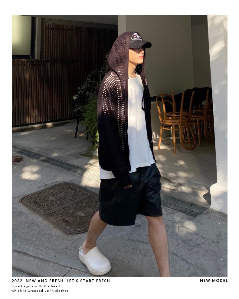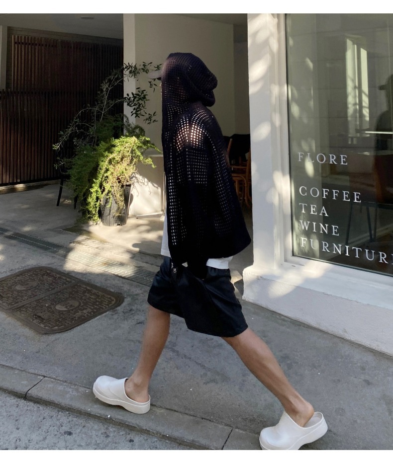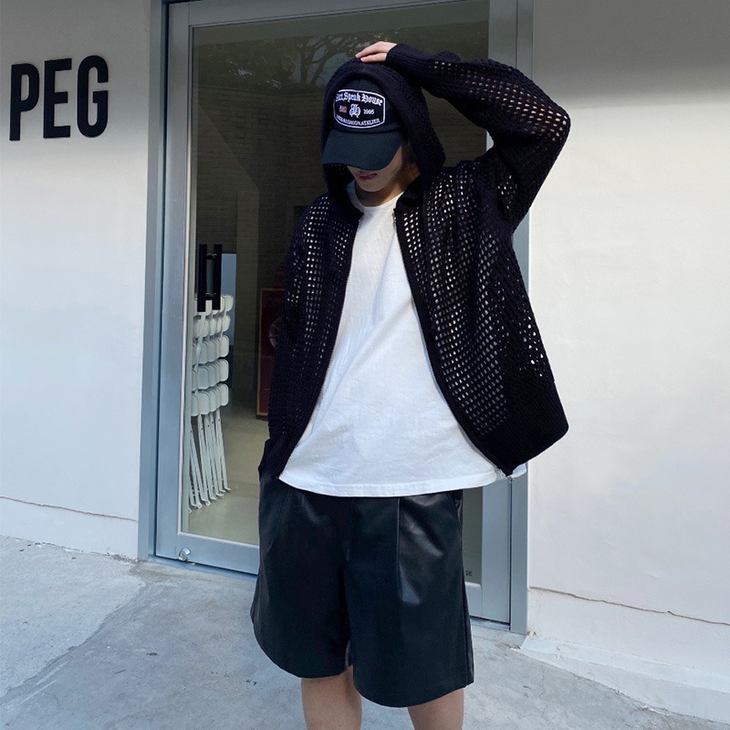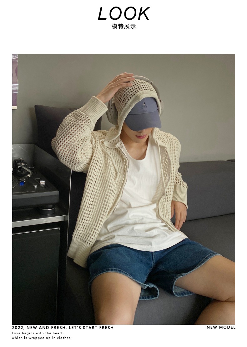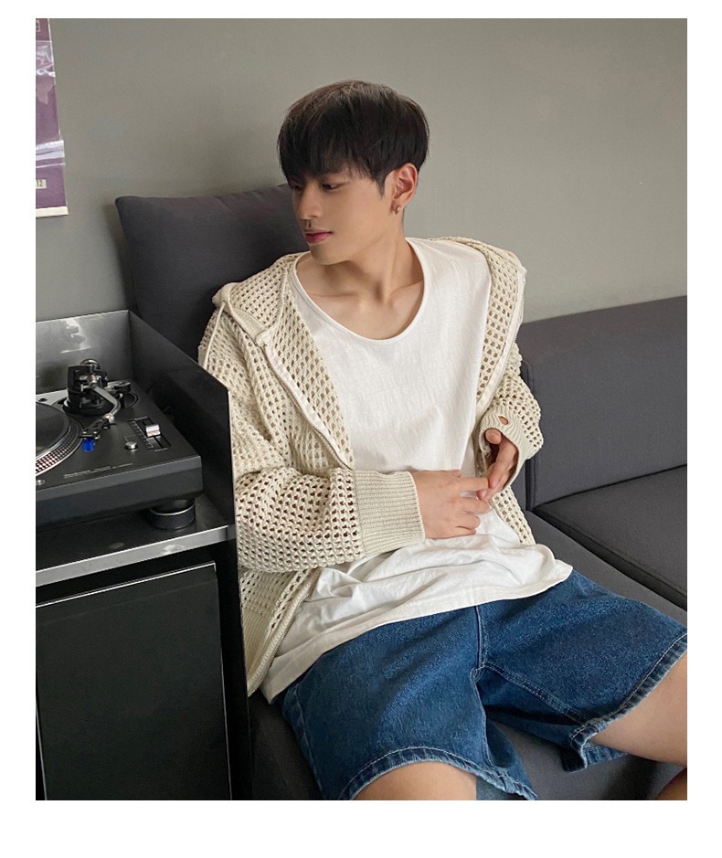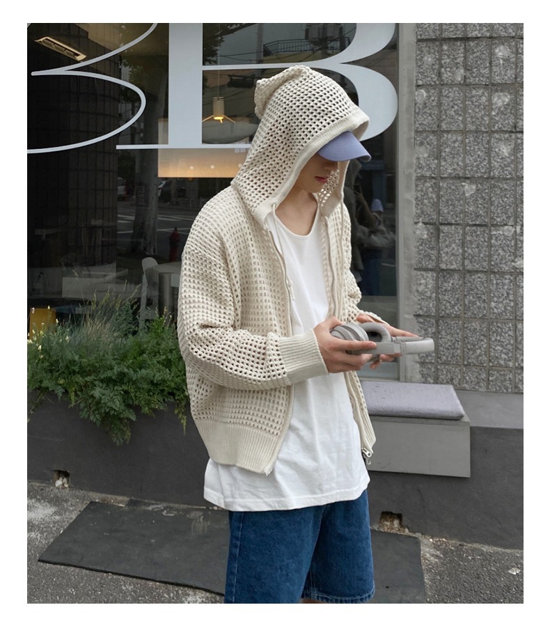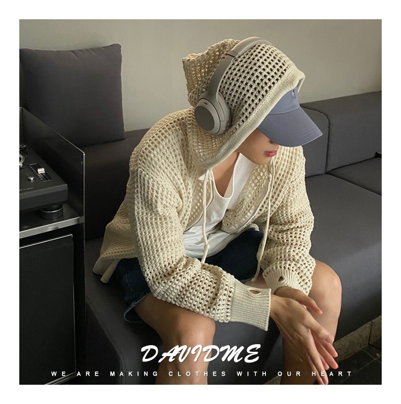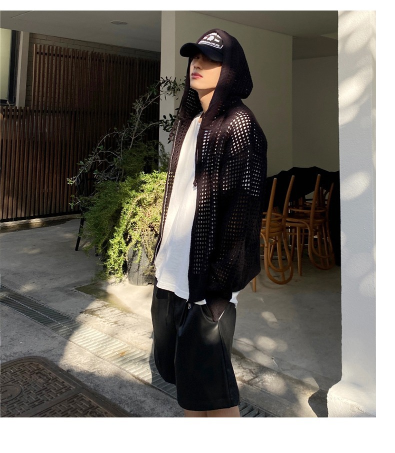하이 엔드 카디건 스웨터 남자 Ins 하이 스트리트 후드 할로우 니트 스웨터 여름 얇은 선 스크린 커플 코트스토어 가기