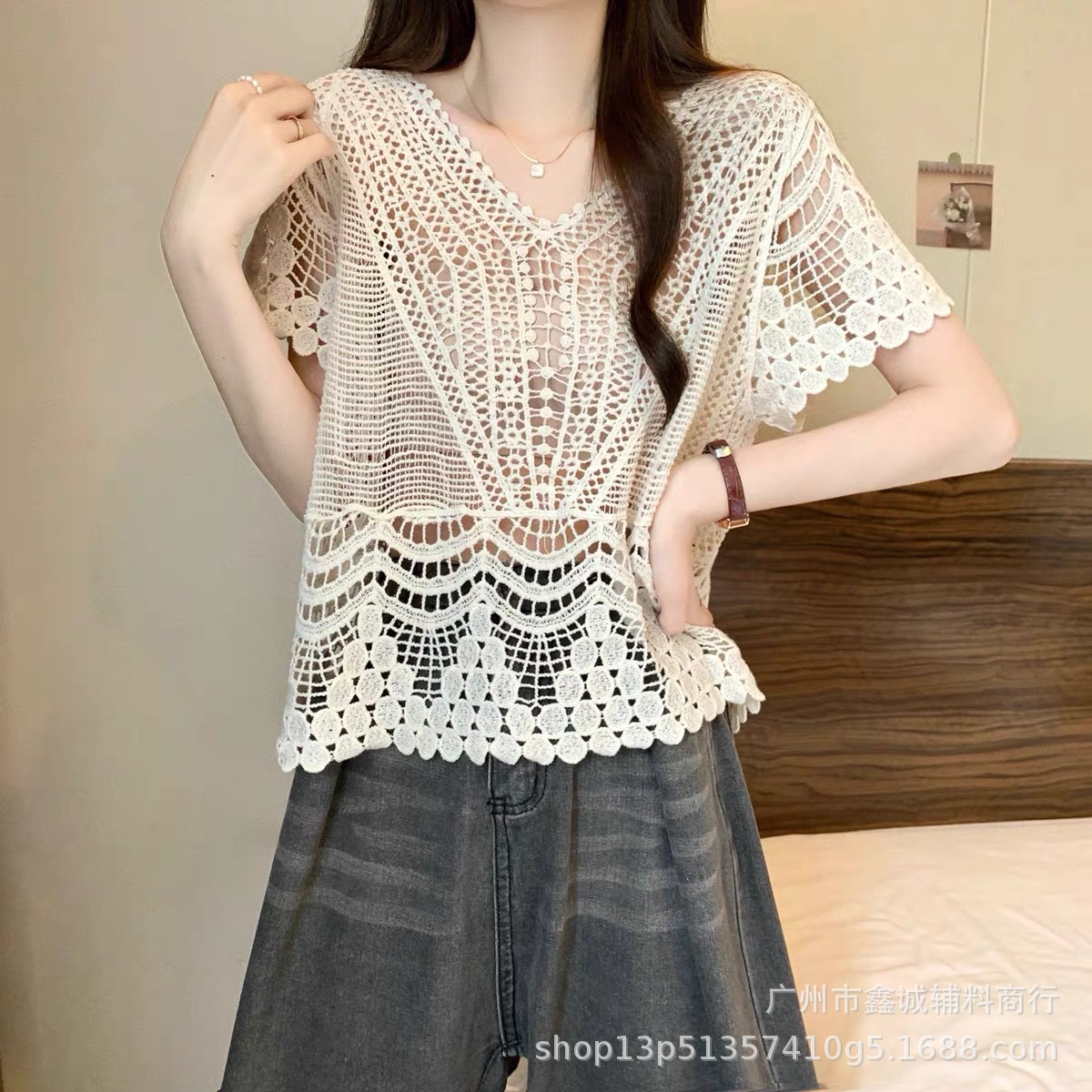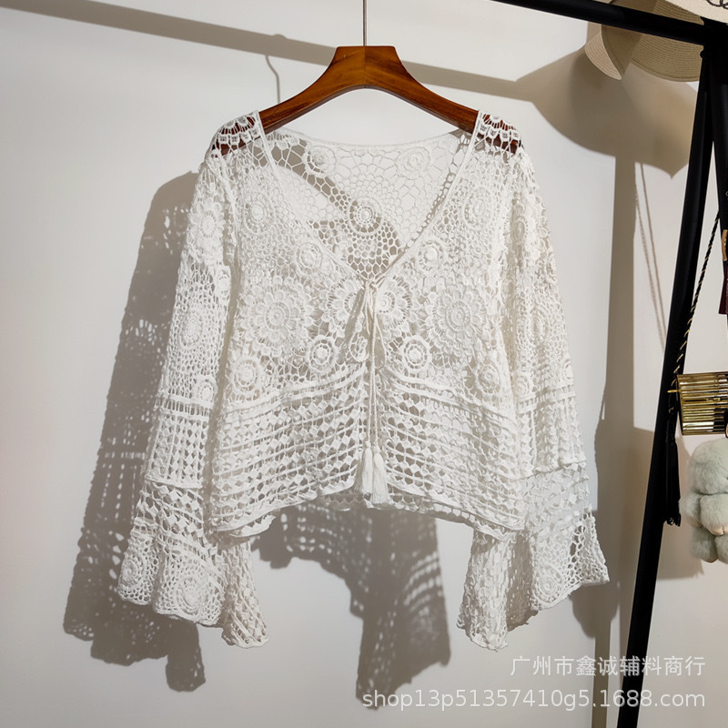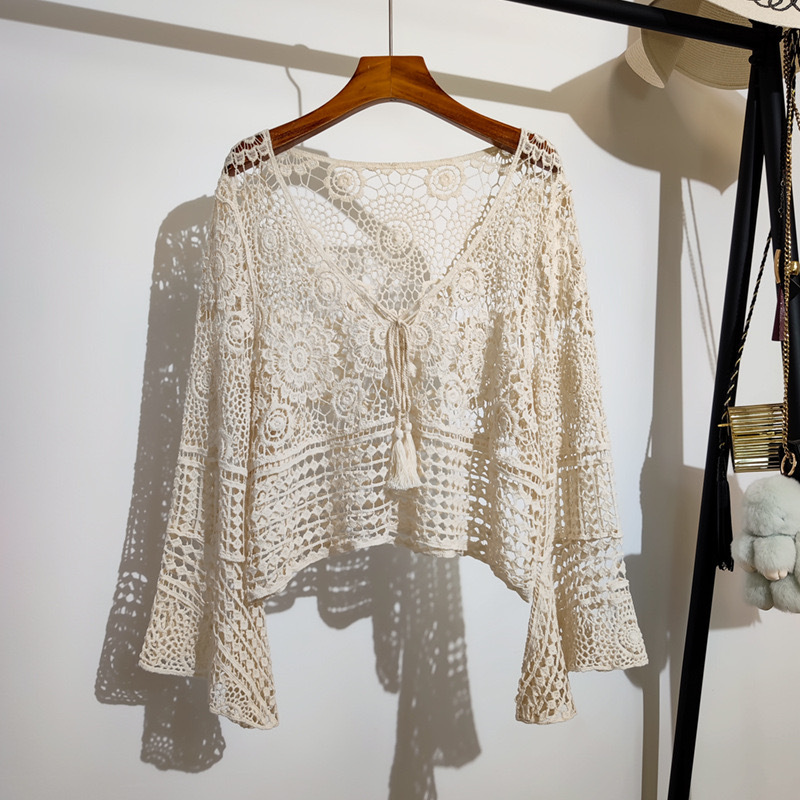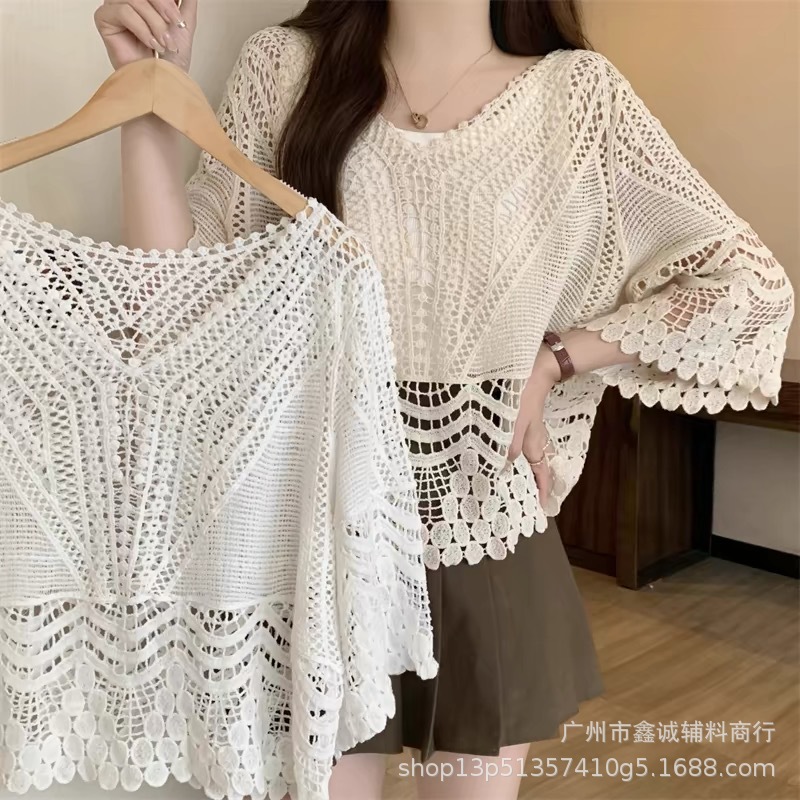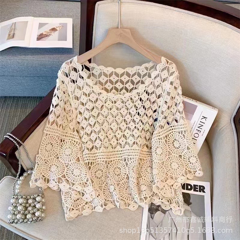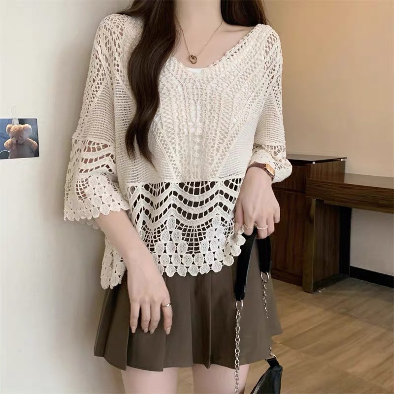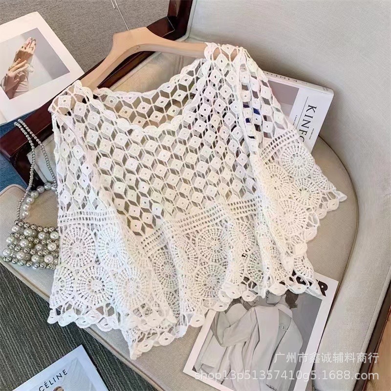 샤넬 스타일 빈 V-넥 니트 스웨터 여성용 여름 얇은 느슨한 드로우 선 스크린 블라우스 디자인 센스 쇼트 탑스토어 가기